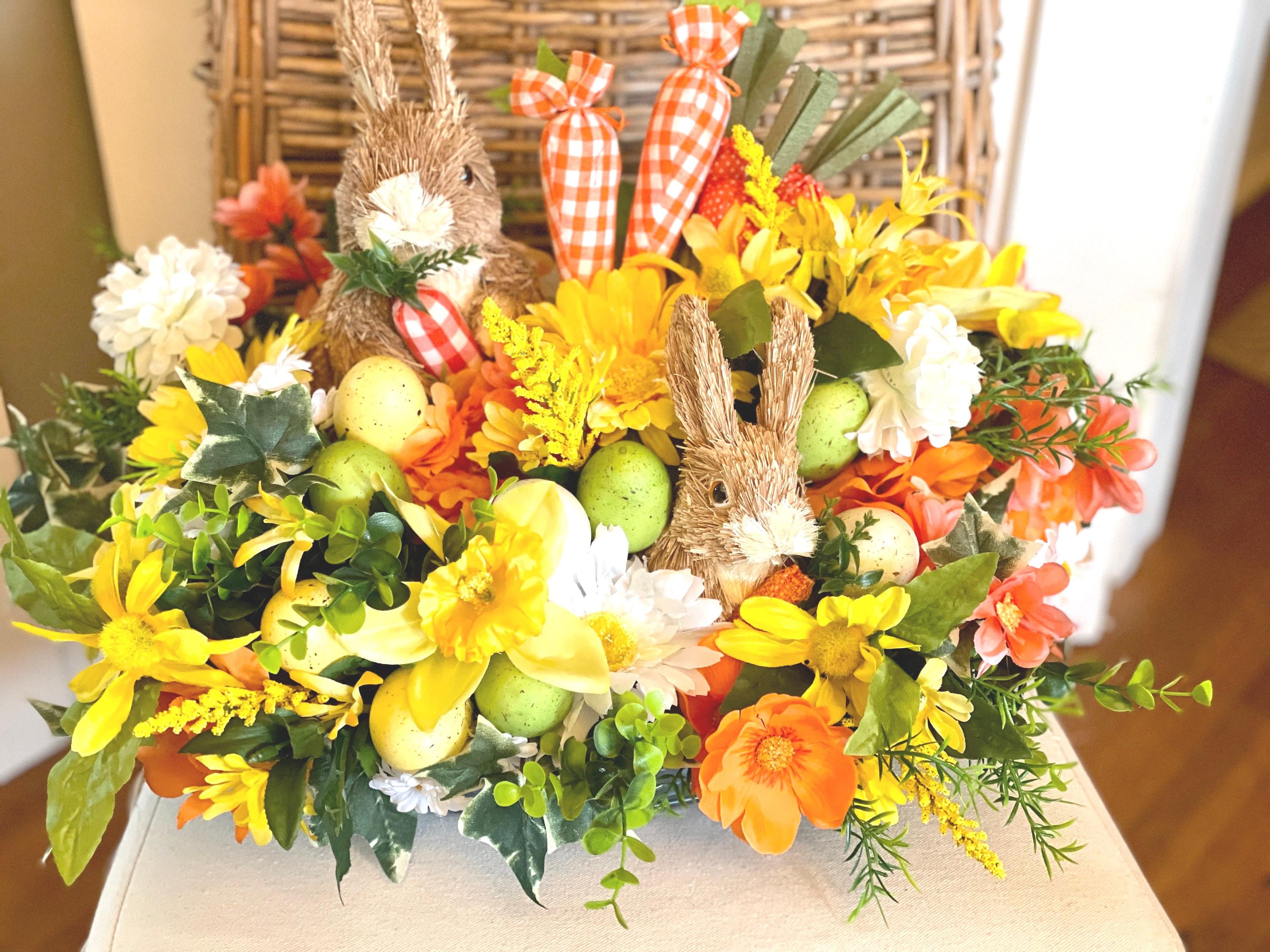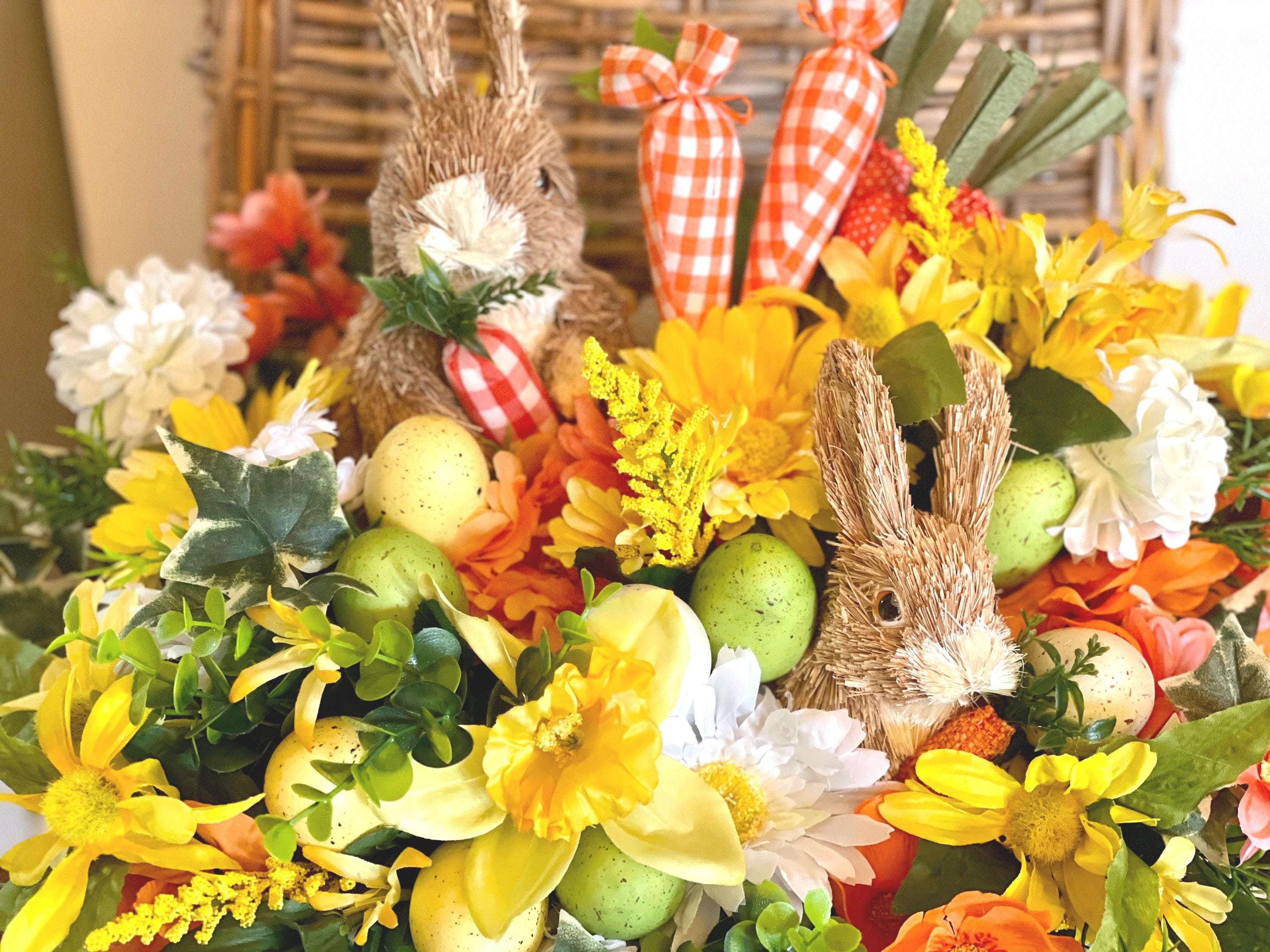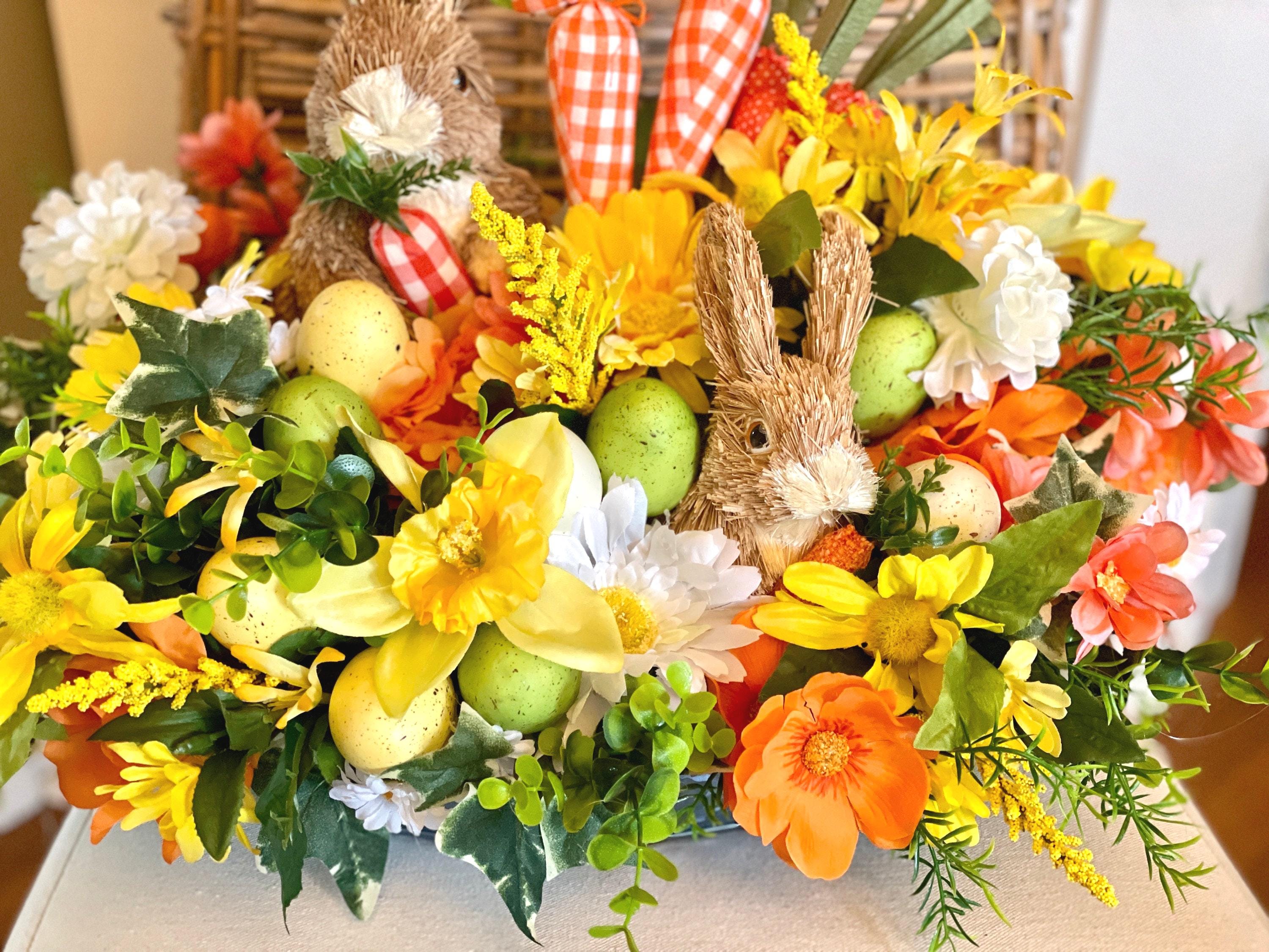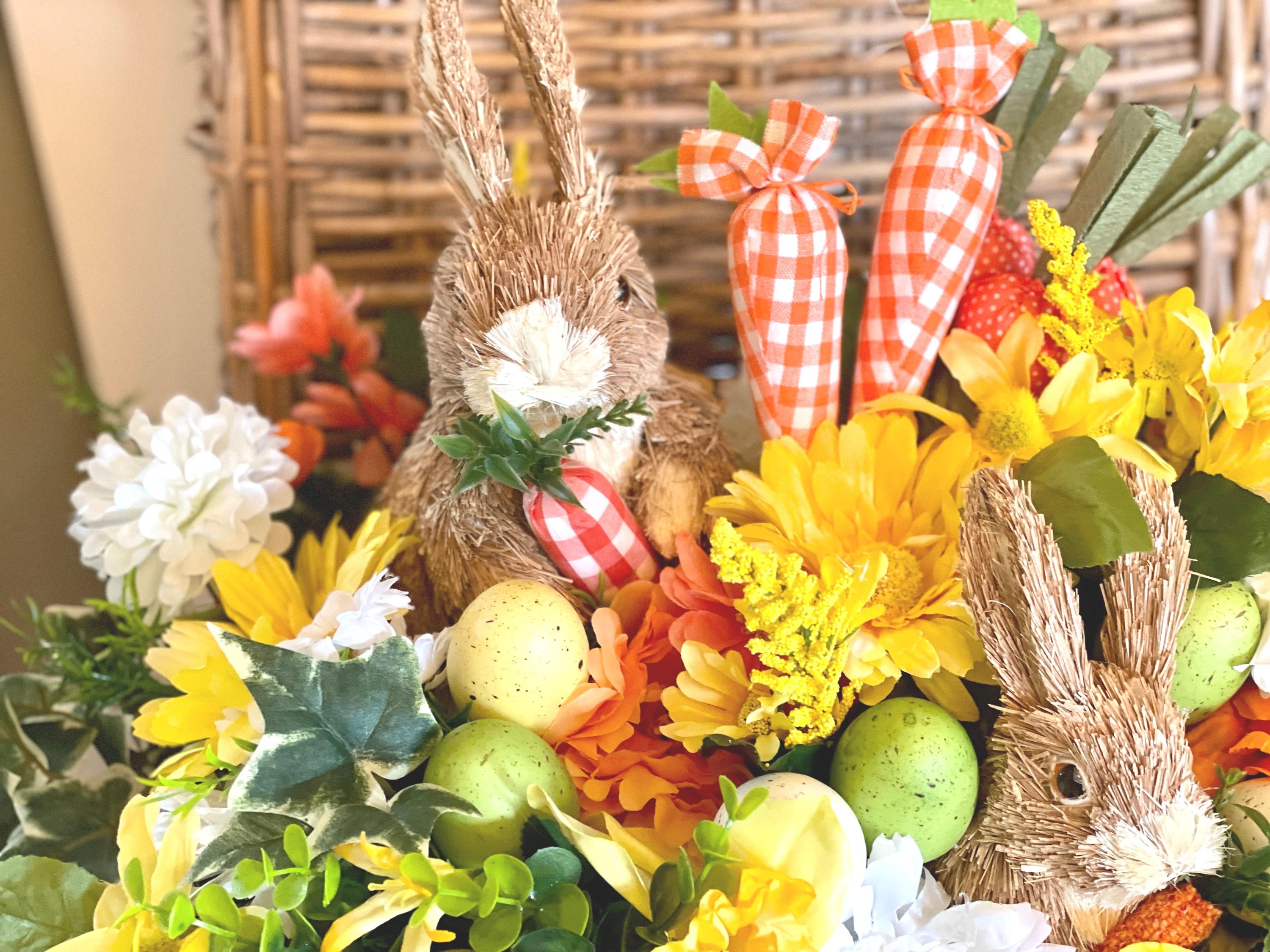 This XL bunny Centerpiece is loaded with Flowers, Eggs, Bunnies, Carrots Boxwood, Ivy and much more. This darling arrangement is large 24" wide, 20" deep, 14" high from tip to tip. The sweet bunnies are surrounded by Eggs, Carrots, Wildflowers, Peony, Gerber Daisy, all set in a tin tray with handles.