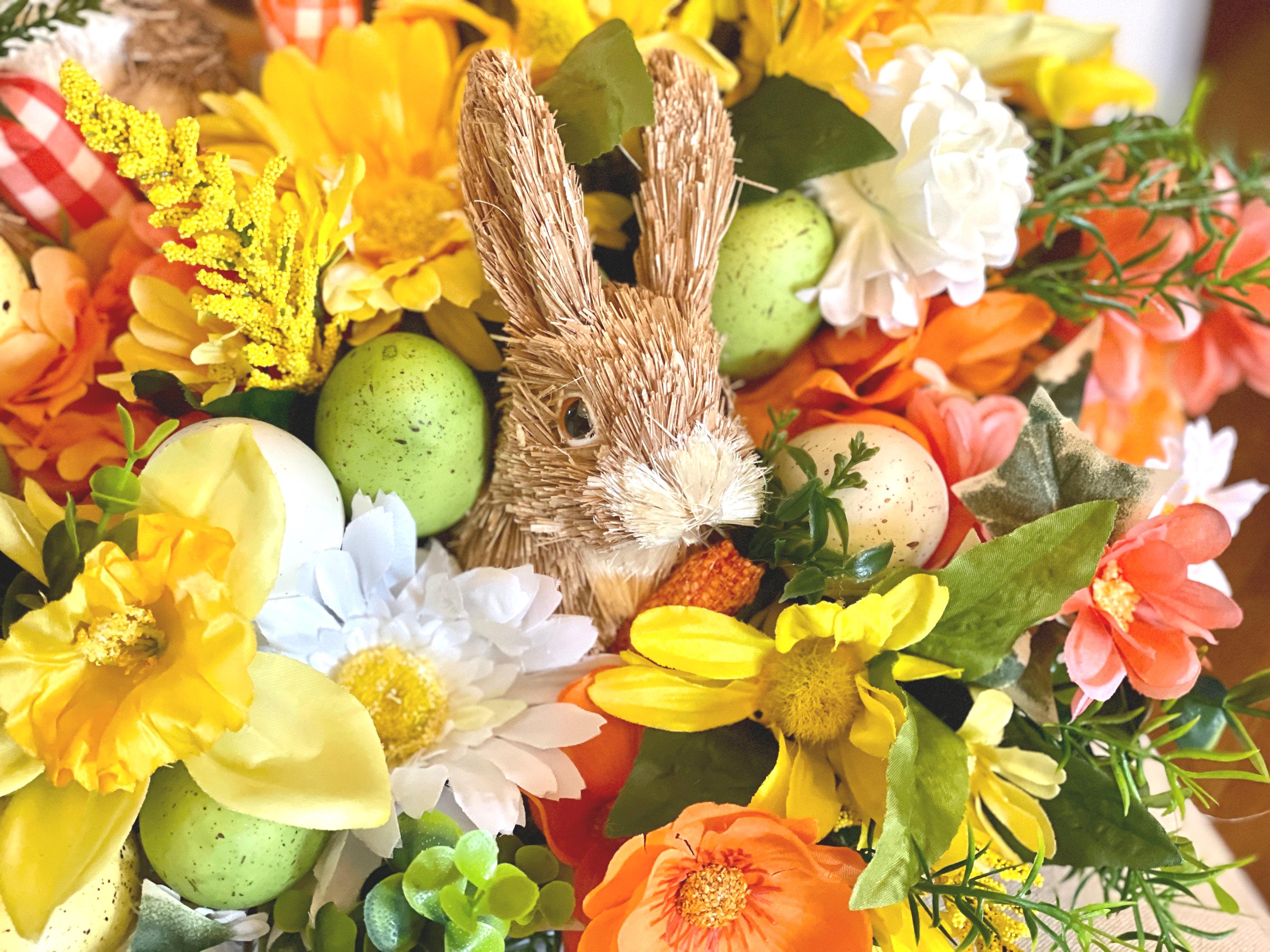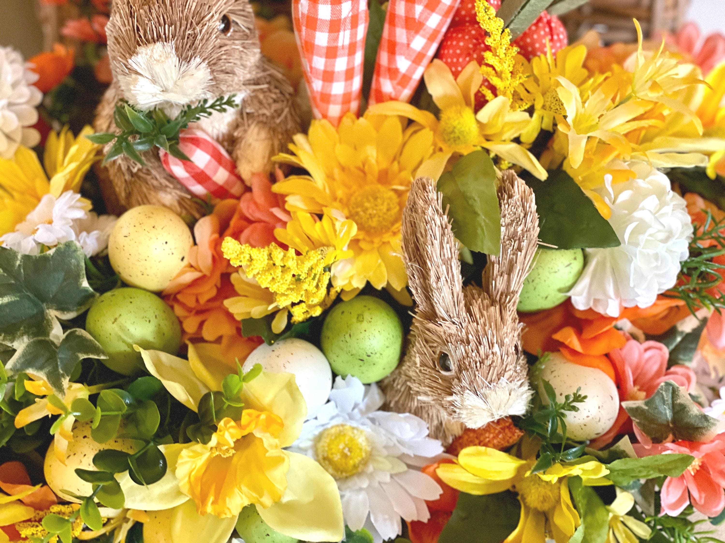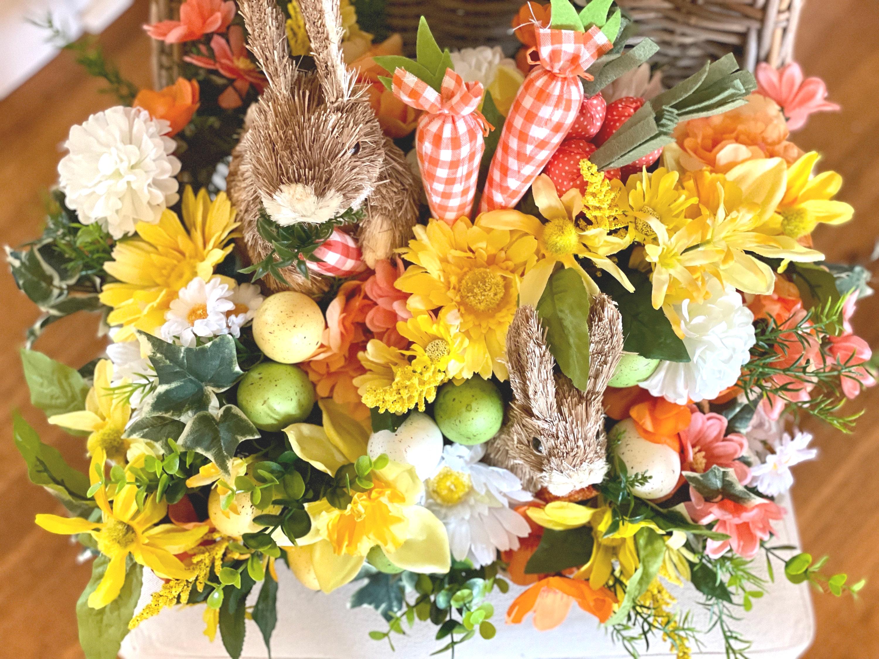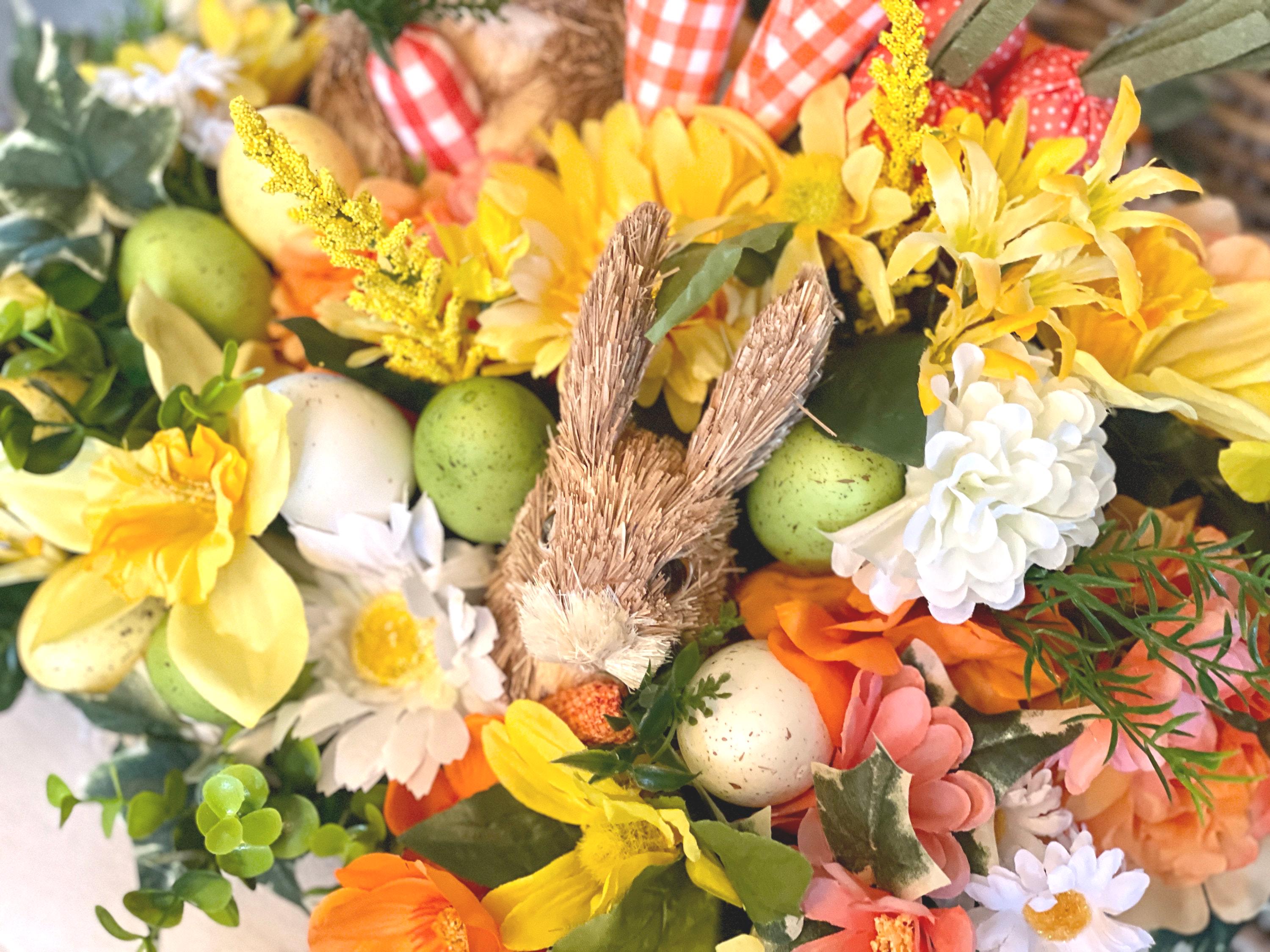 This XL bunny Centerpiece is loaded with Flowers, Eggs, Bunnies, Carrots Boxwood, Ivy and much more. This darling arrangement is large 24" wide, 20" deep, 14" high from tip to tip. The sweet bunnies are surrounded by Eggs, Carrots, Wildflowers, Peony, Gerber Daisy, all set in a tin tray with handles.