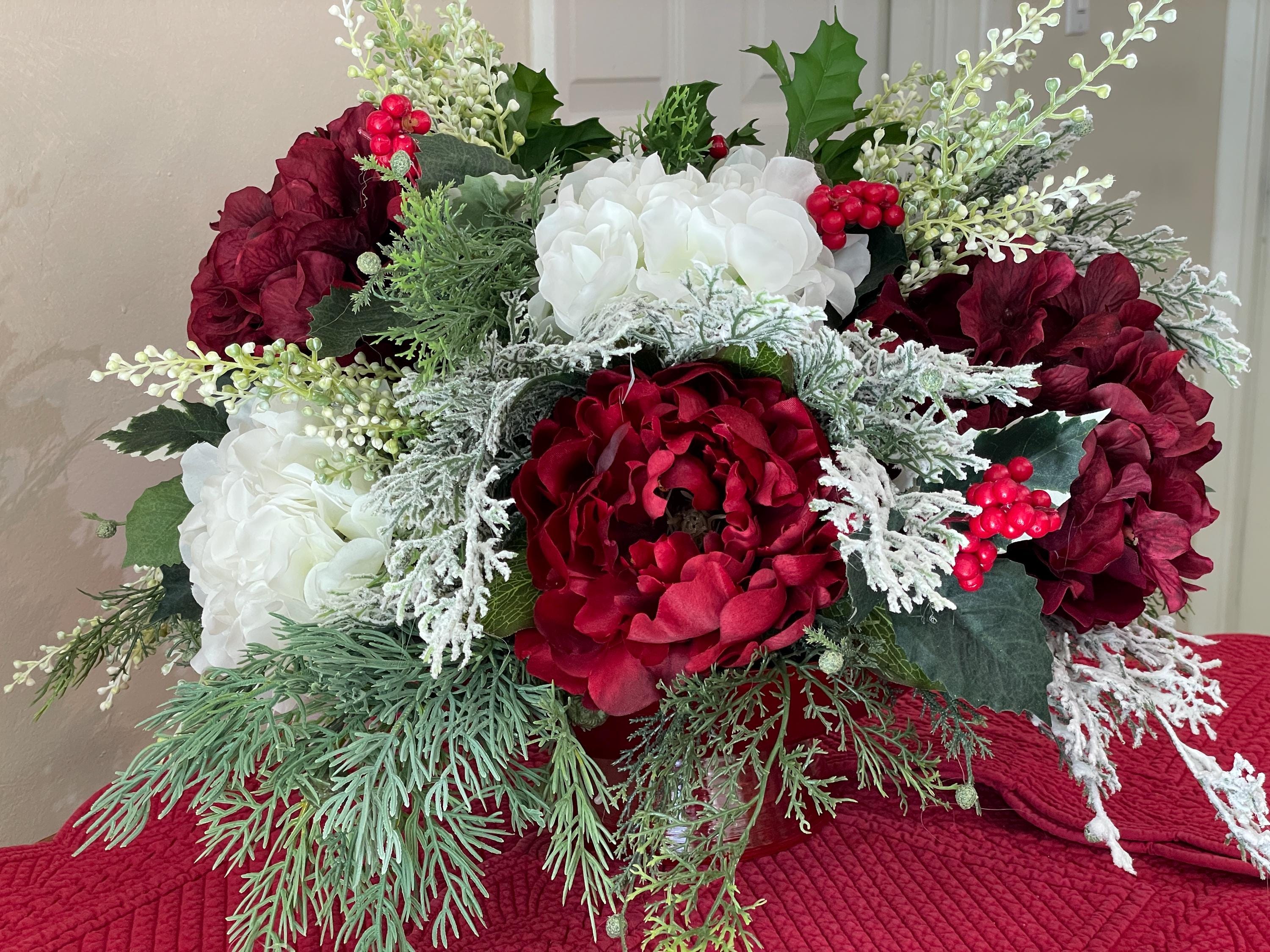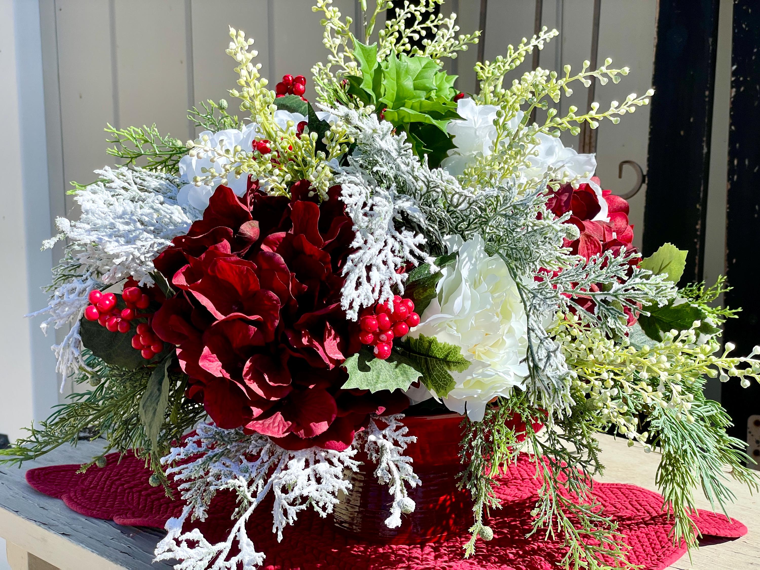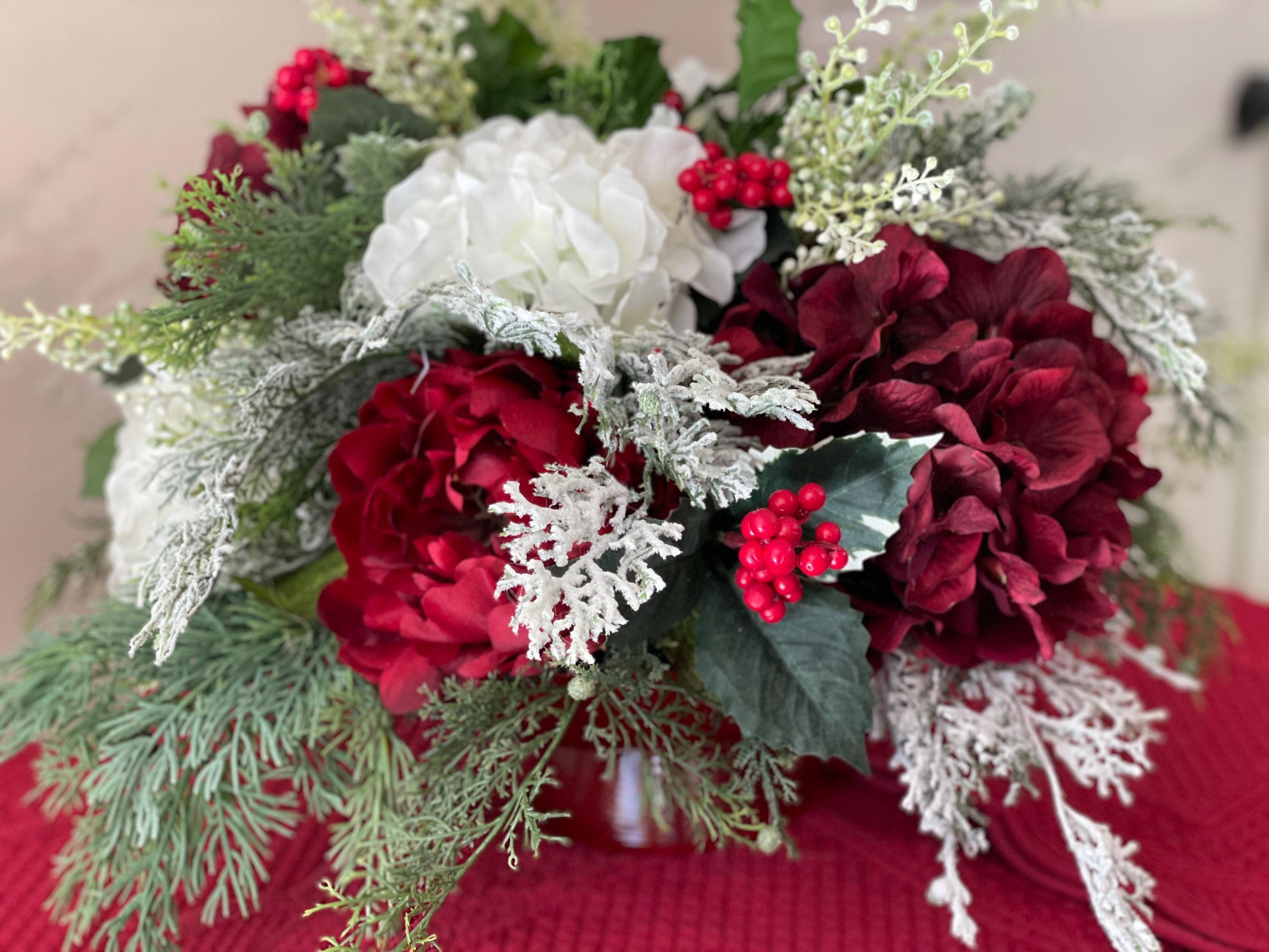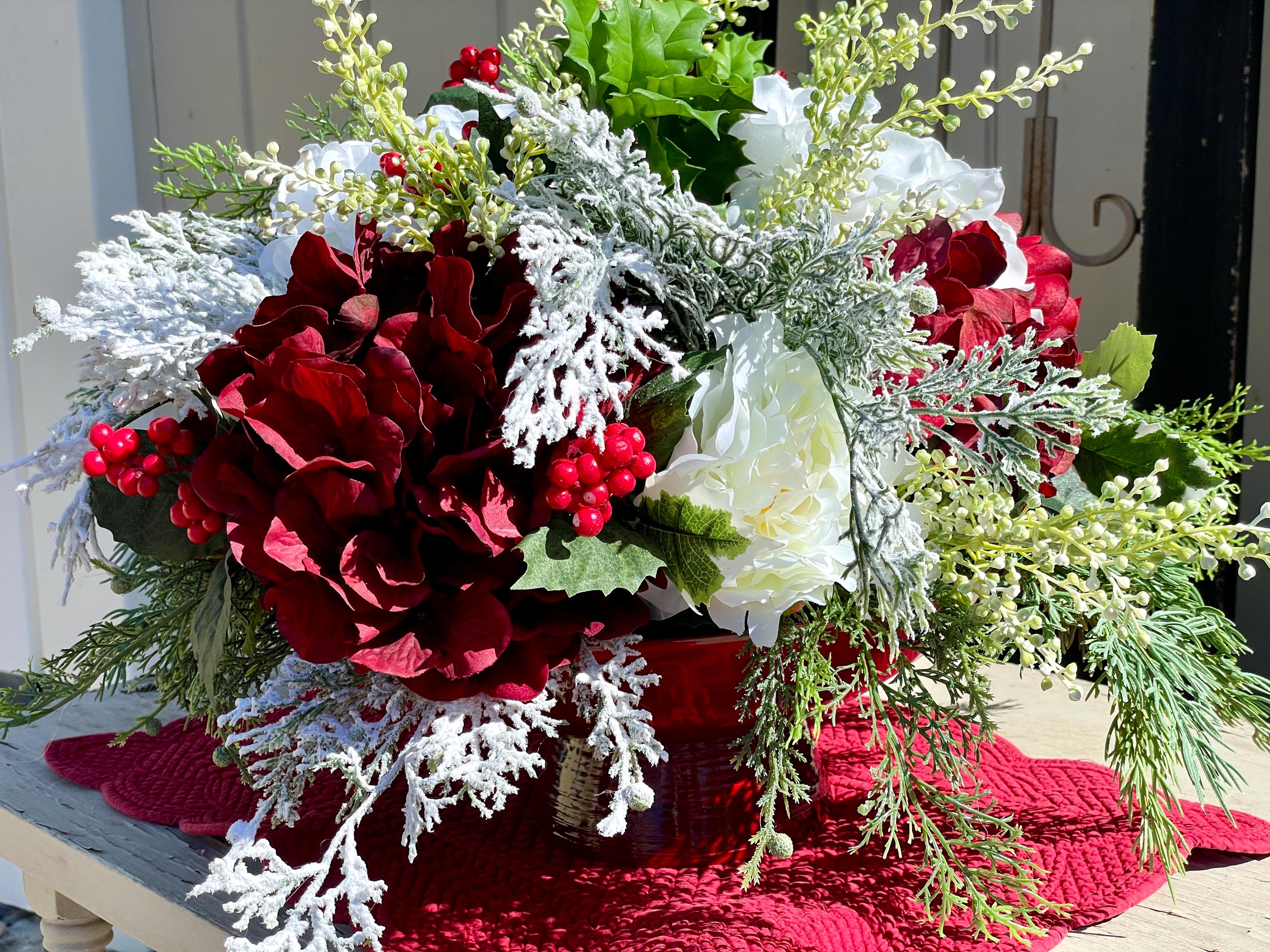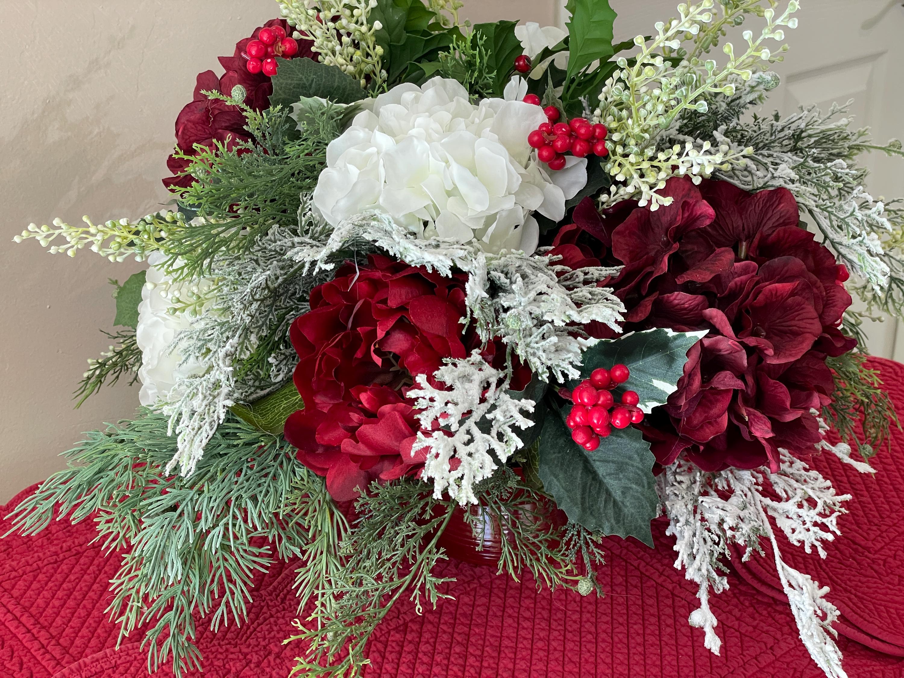 This is a gorgeous red, white and green winter arrangement for your dining table, entry, mantel, kitchen, coffee table or give as a special gift. This is very natural looking! Beautiful red and white hydrangeas, holly, berries, frosted cedar and set in a round red container.
