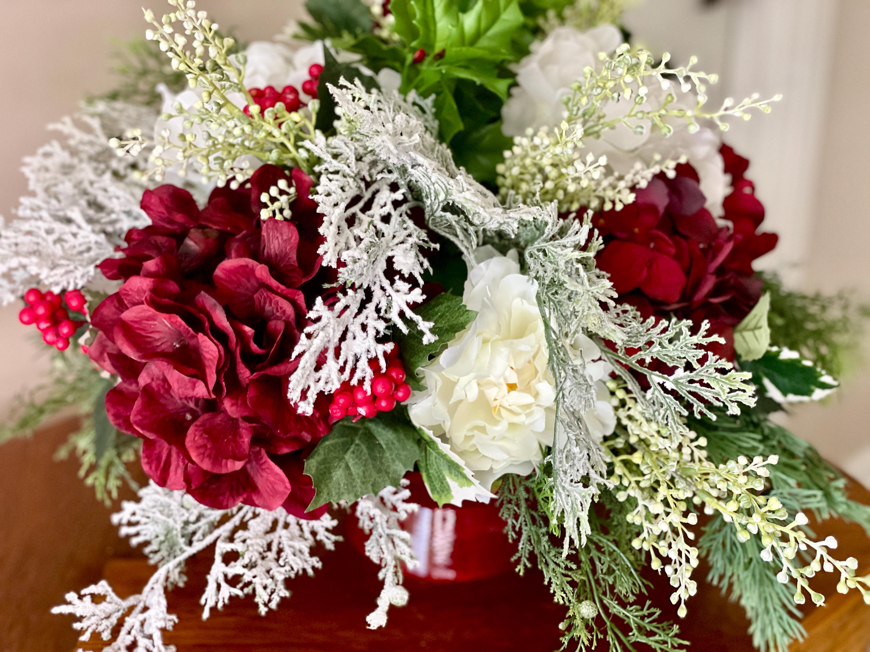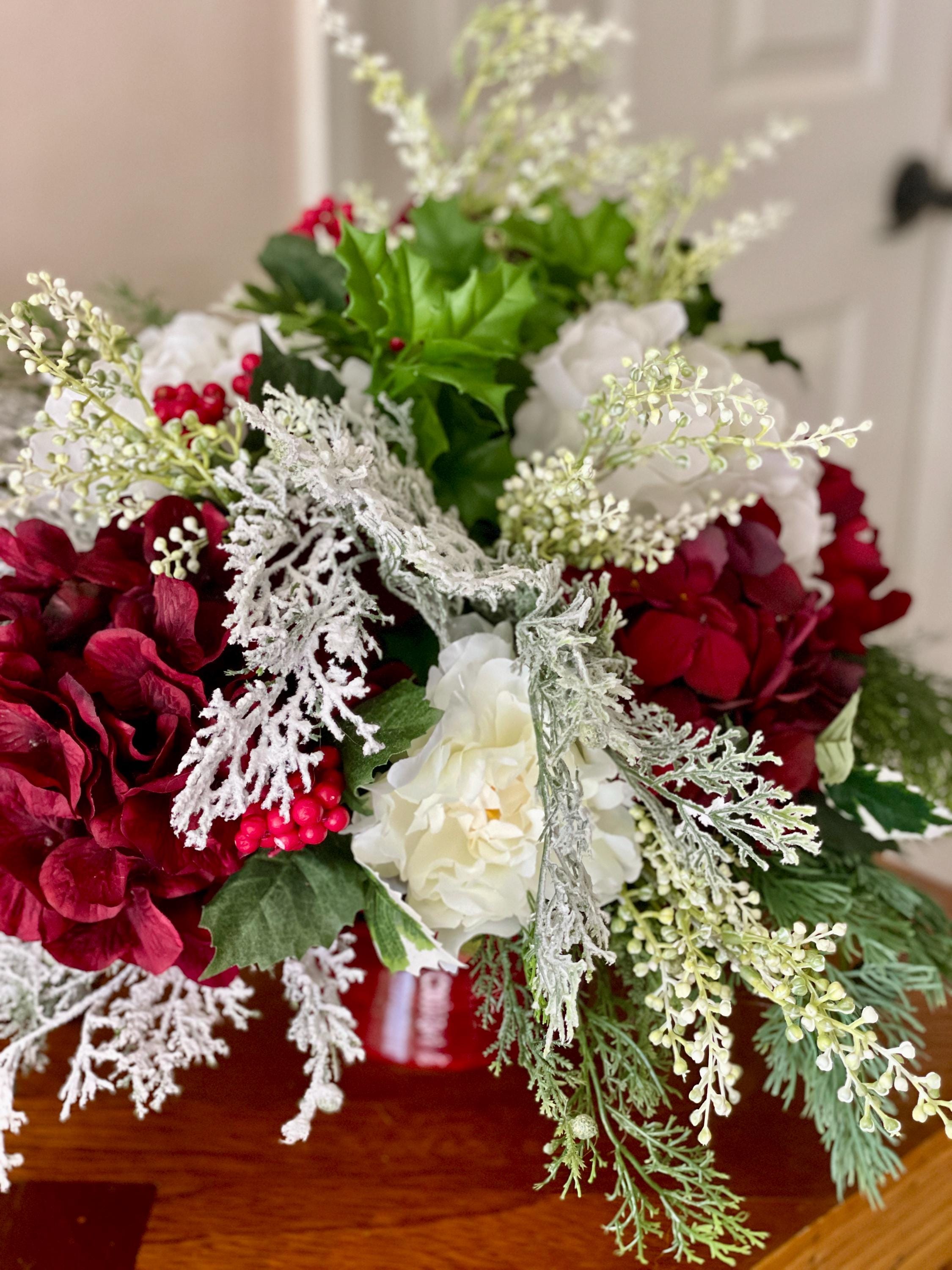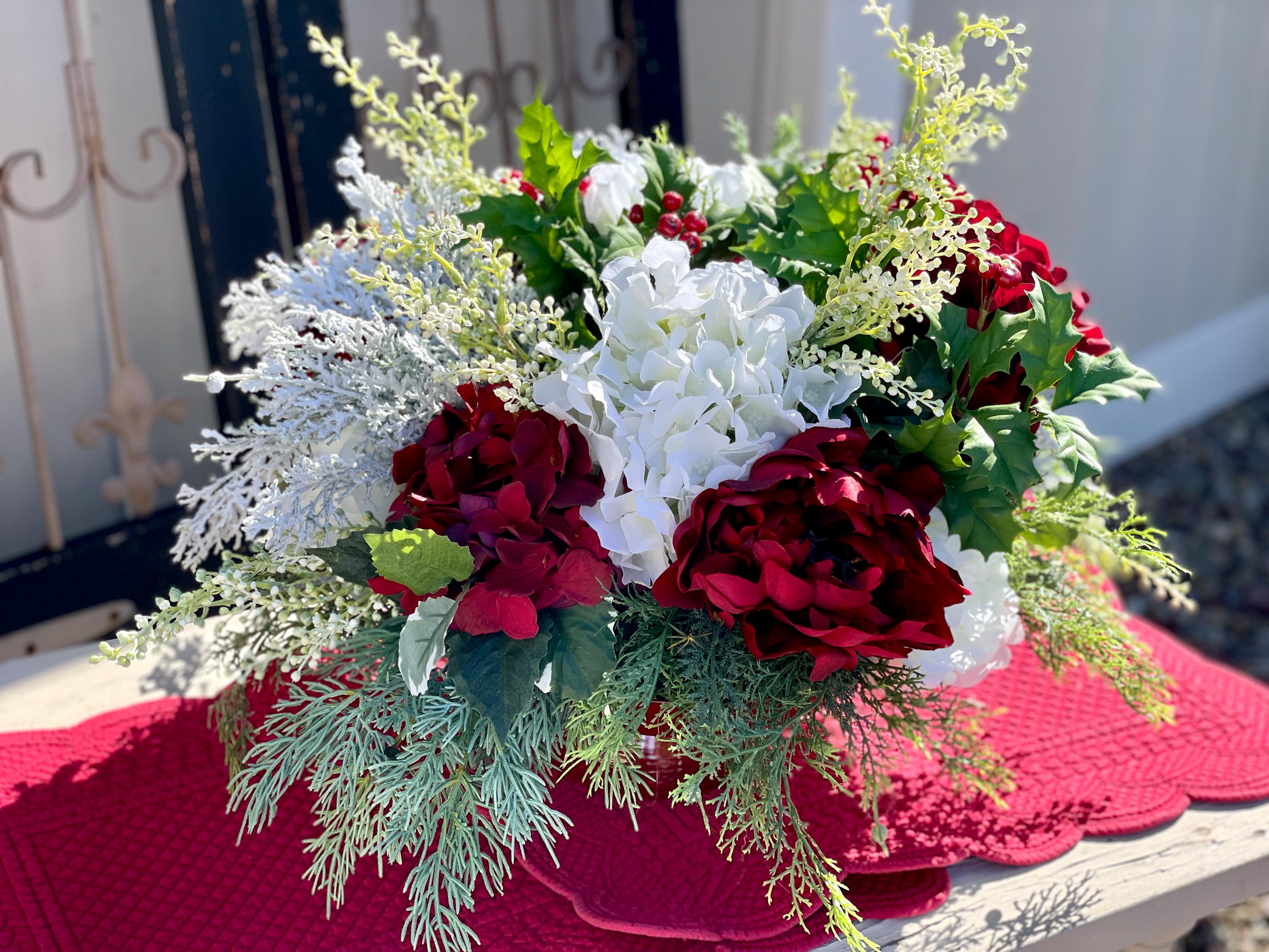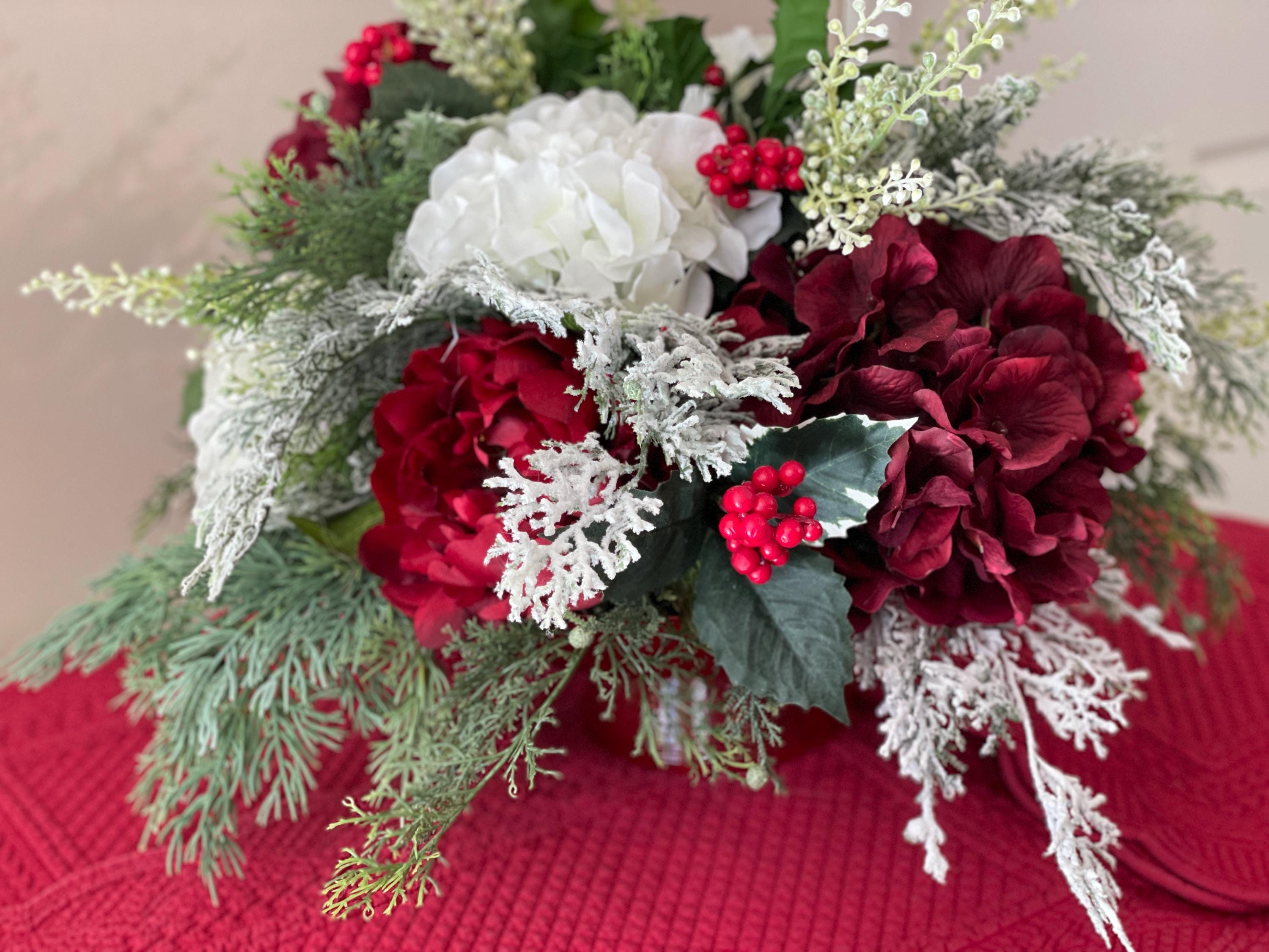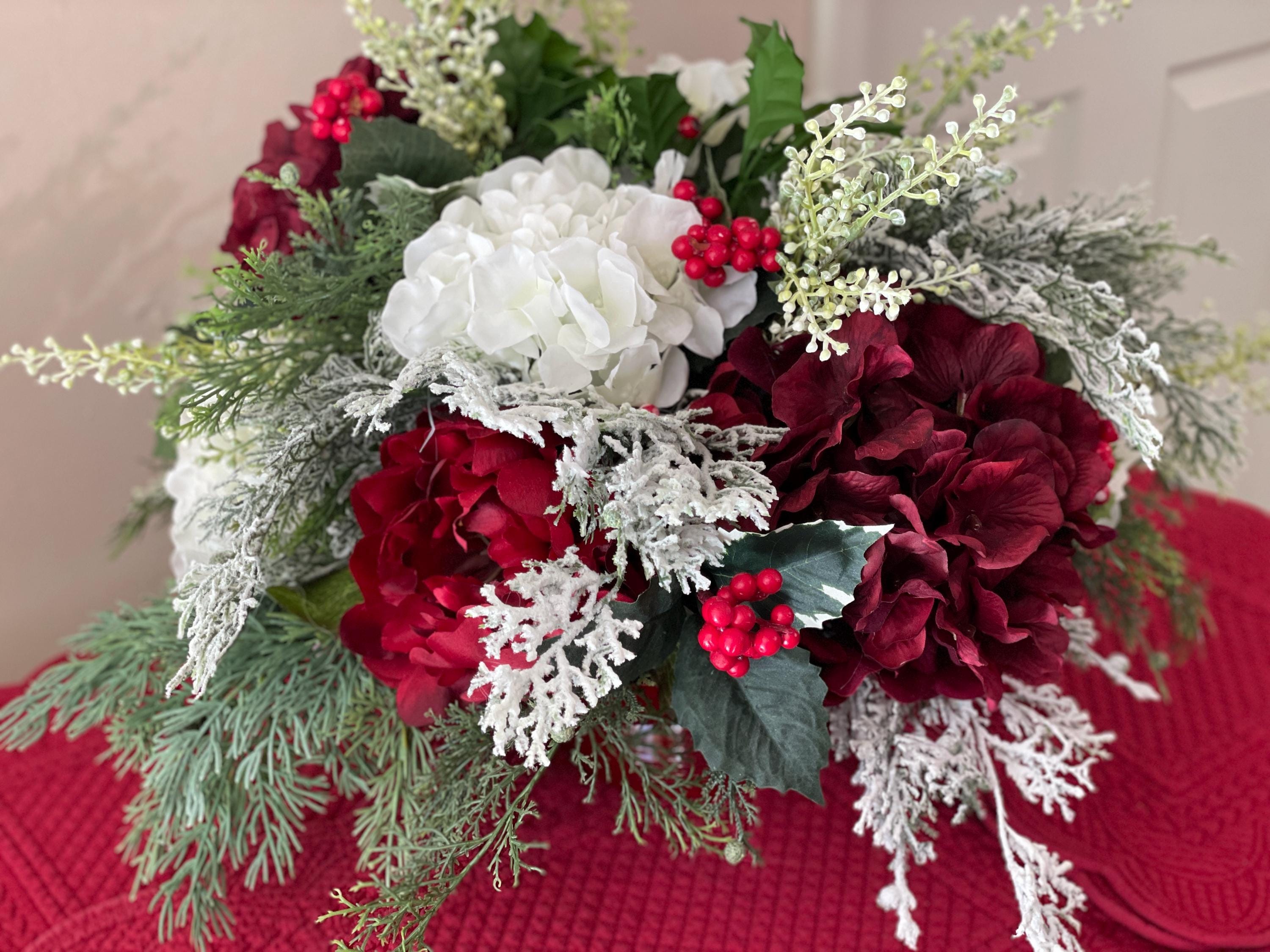 This is a gorgeous red, white and green winter arrangement for your dining table, entry, mantel, kitchen, coffee table or give as a special gift. This is very natural looking! Beautiful red and white hydrangeas, holly, berries, frosted cedar and set in a round red container.