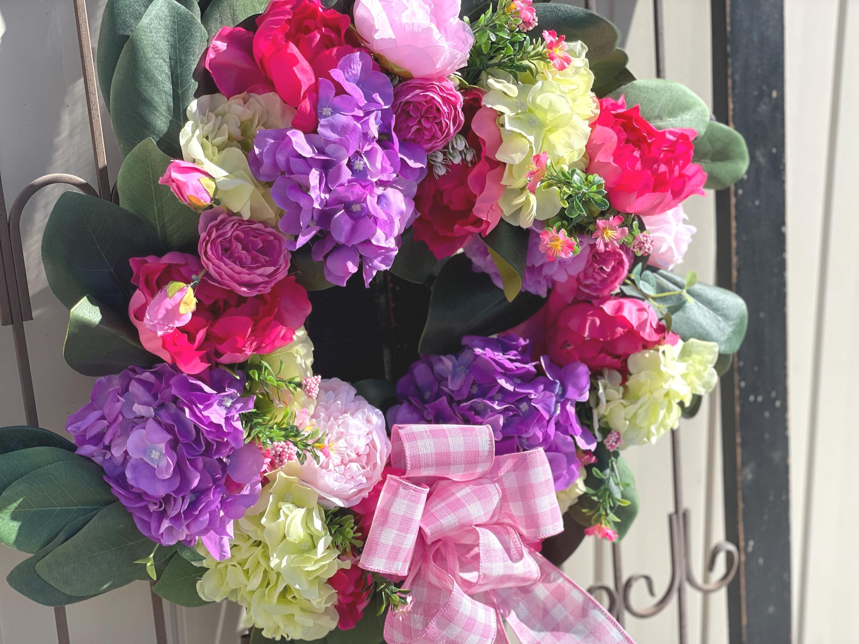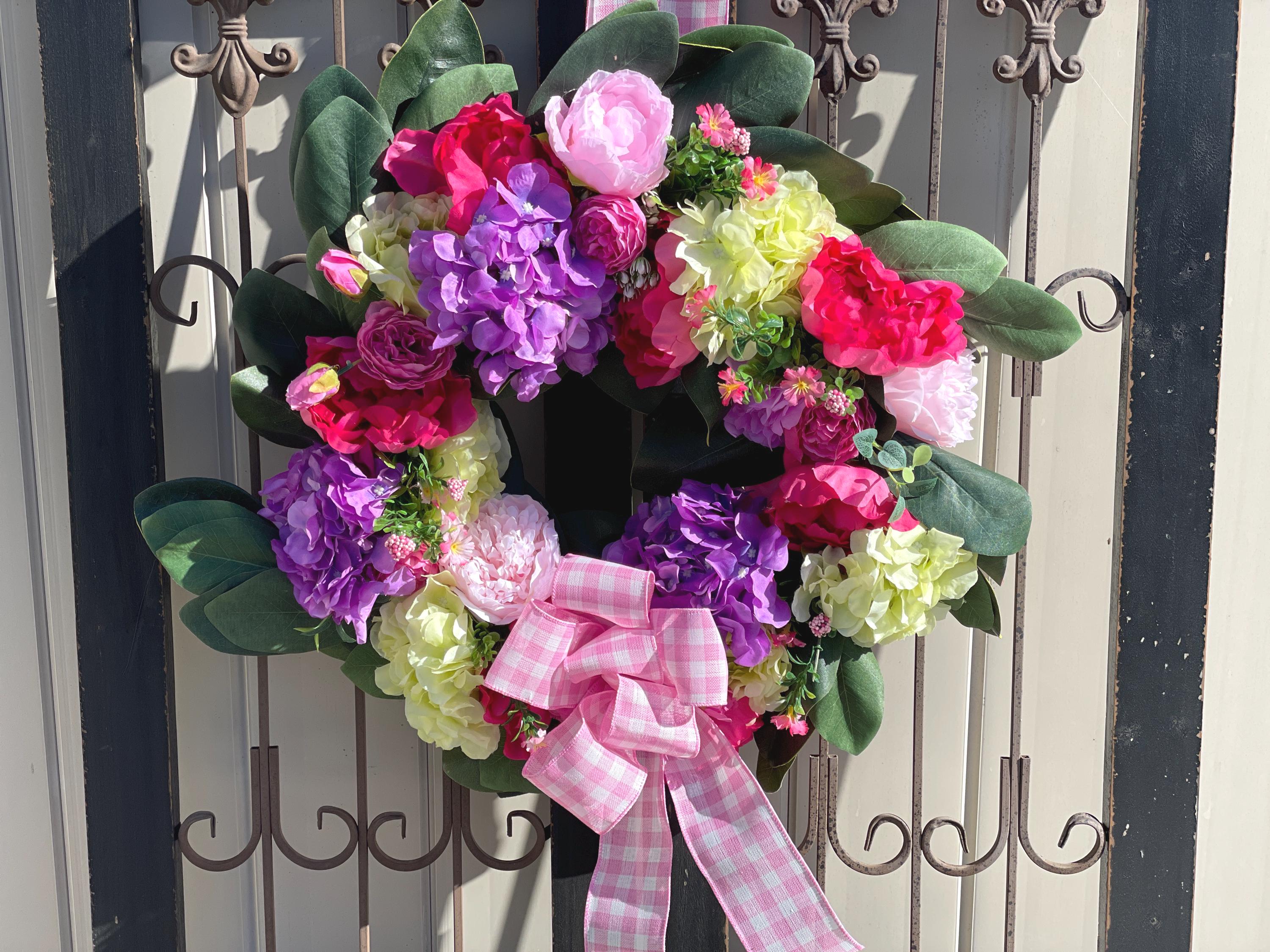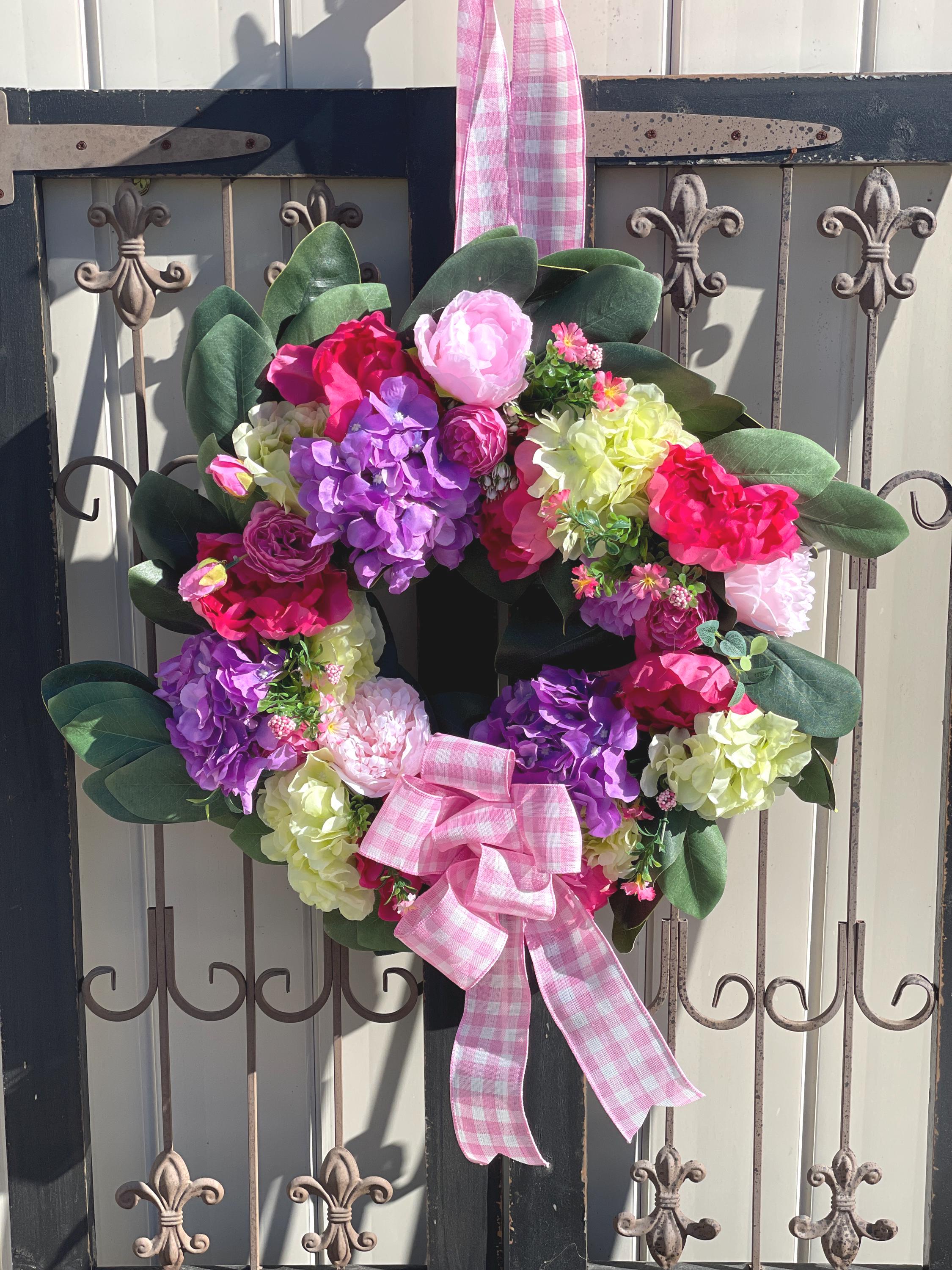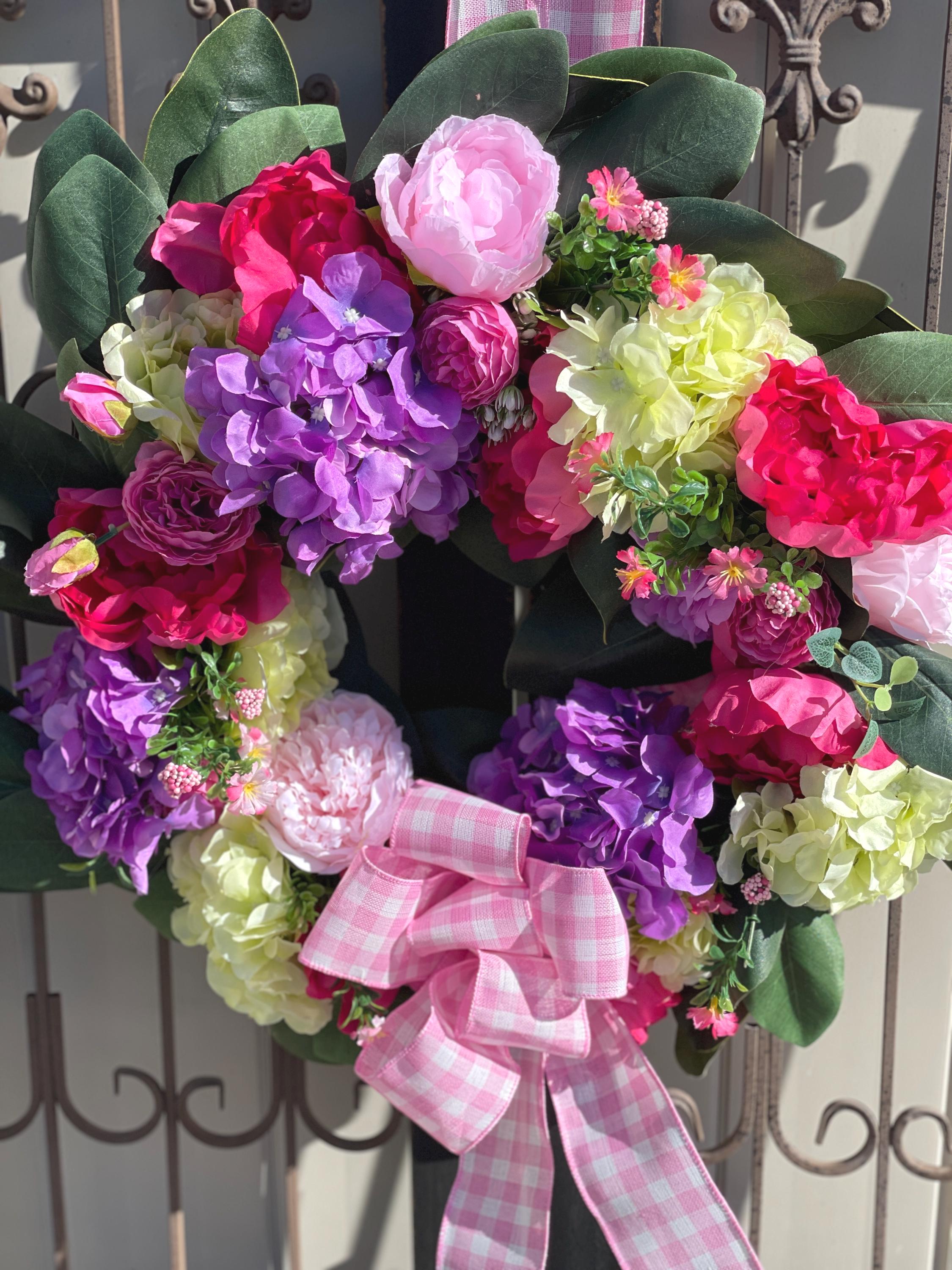 This Beautiful wreath is loaded with bright colors of purple, fuchsia, green, pink and magnolia leaves. A large pink and white bow is at the bottom along with the same designer ribbon at the top for hanging the wreath. This is so gorgeous! If you love hydrangea and peony this is the one for you.