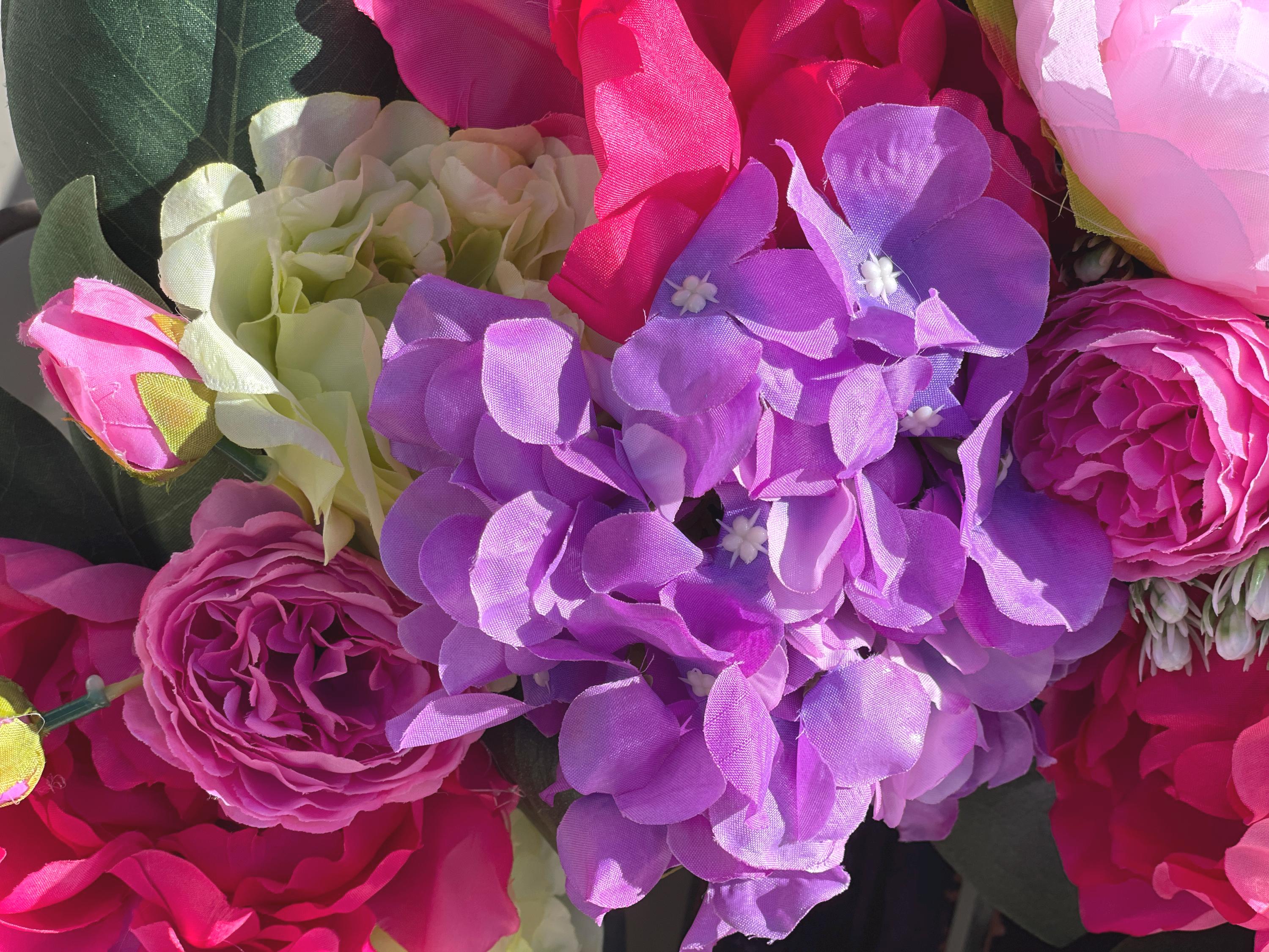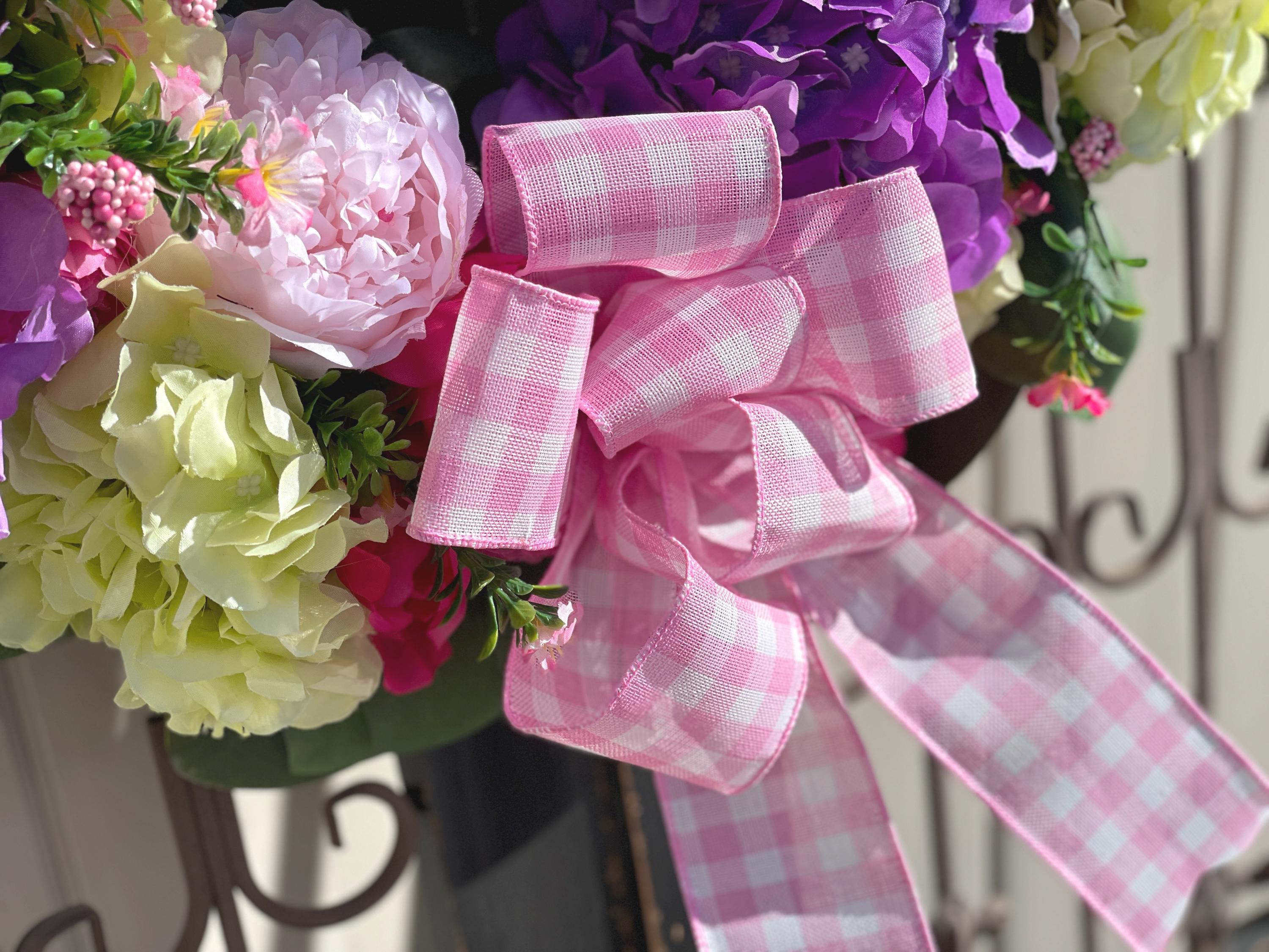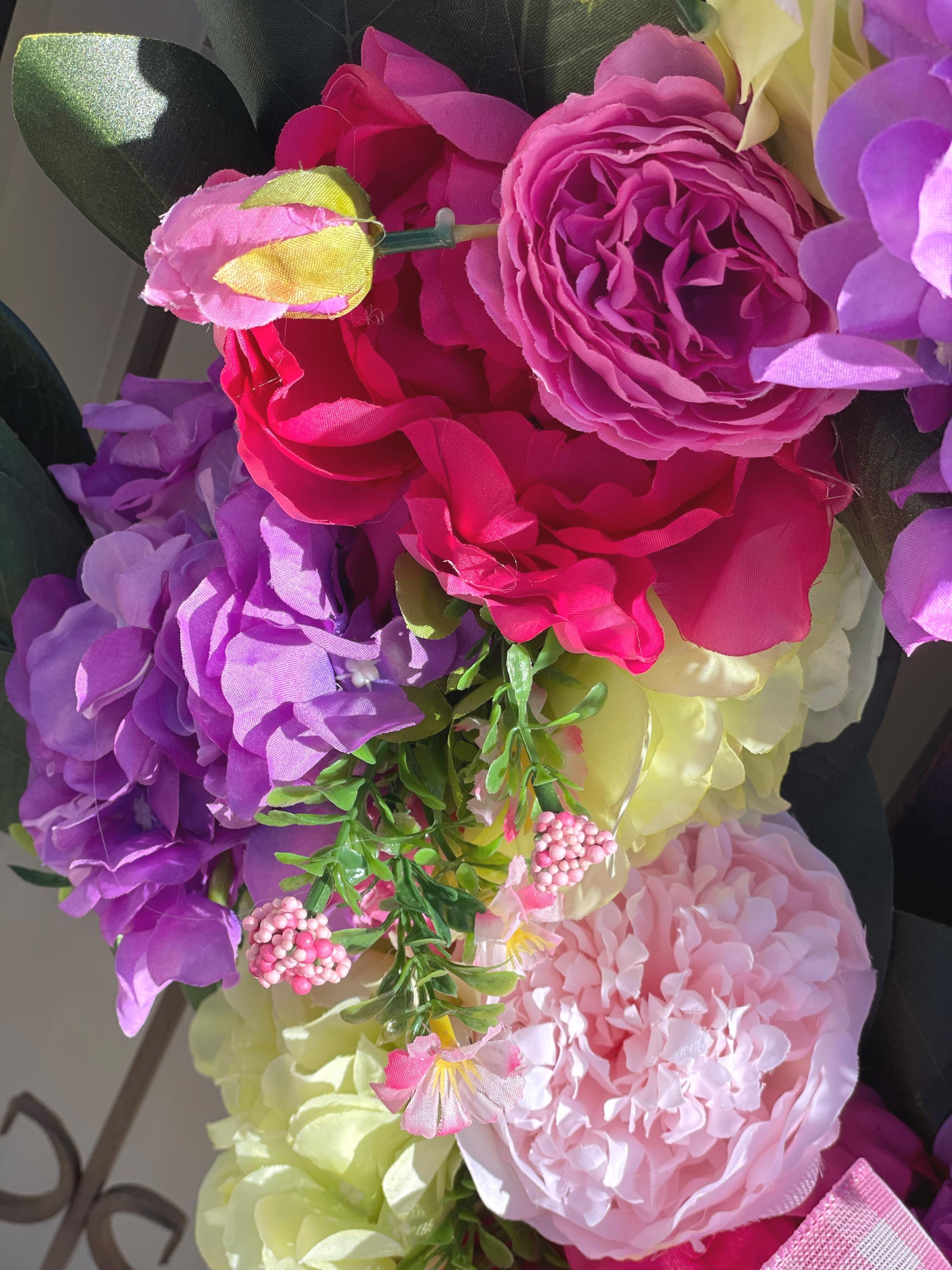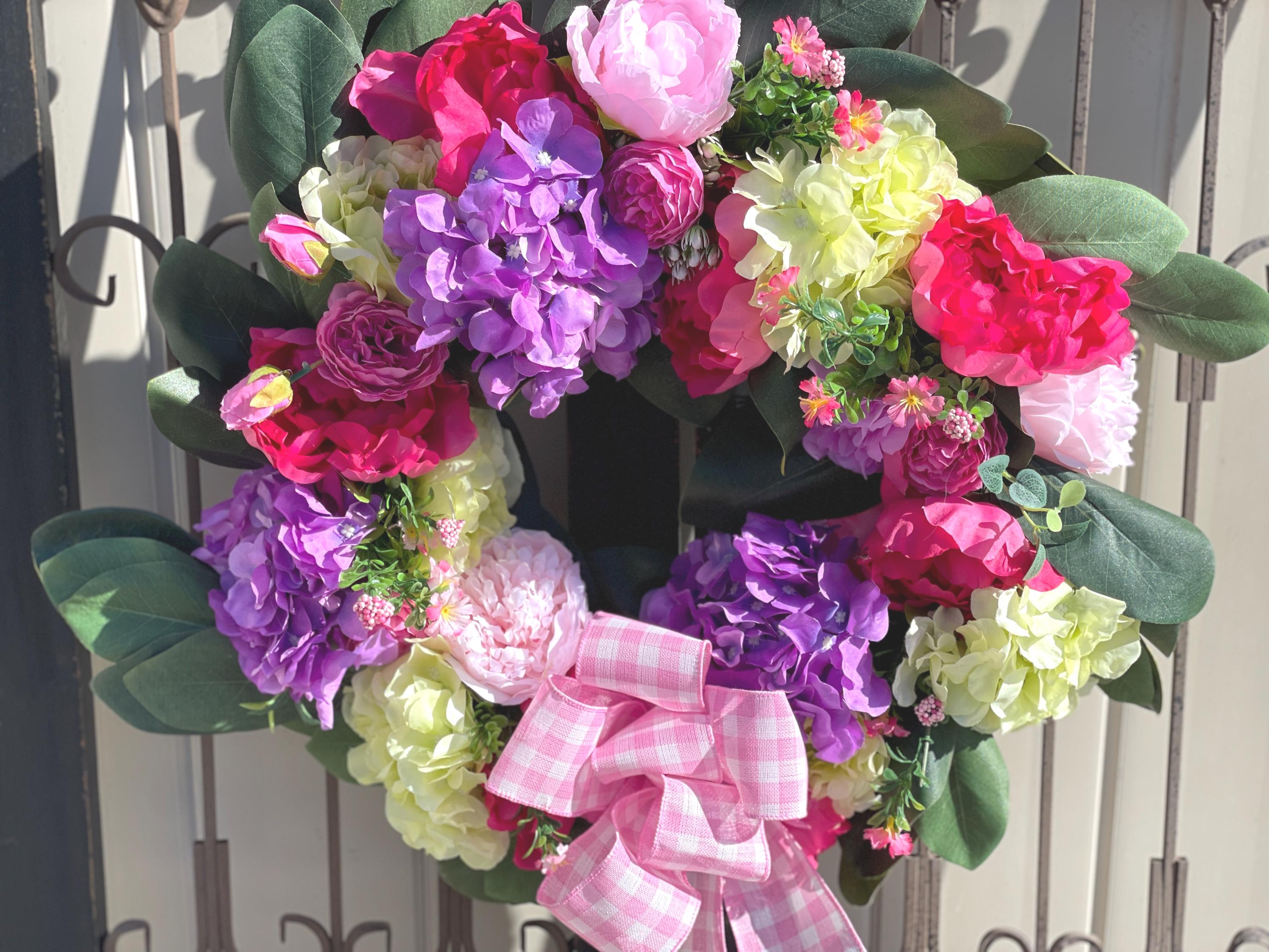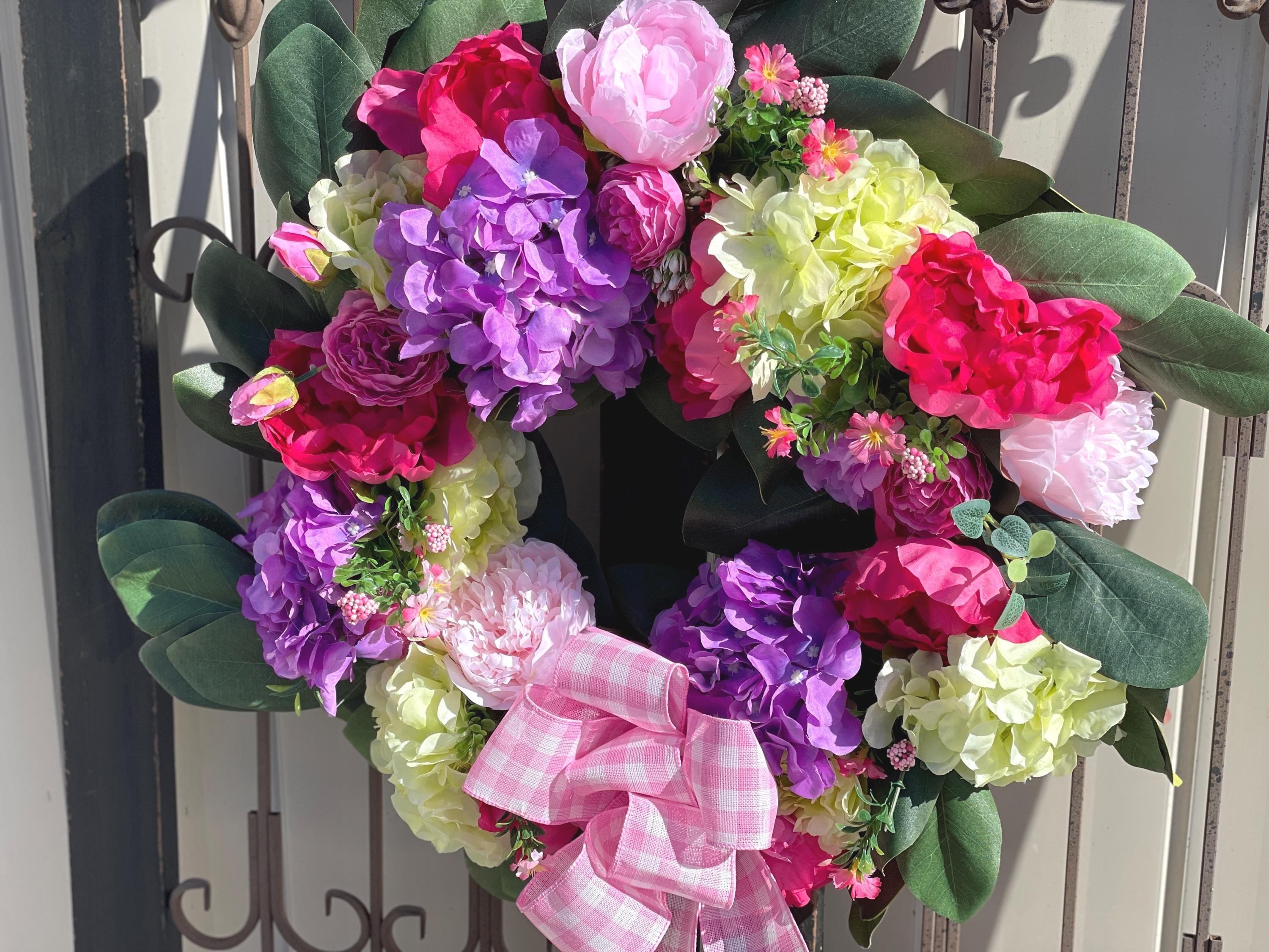 This Beautiful wreath is loaded with bright colors of purple, fuchsia, green, pink and magnolia leaves. A large pink and white bow is at the bottom along with the same designer ribbon at the top for hanging the wreath. This is so gorgeous! If you love hydrangea and peony this is the one for you.