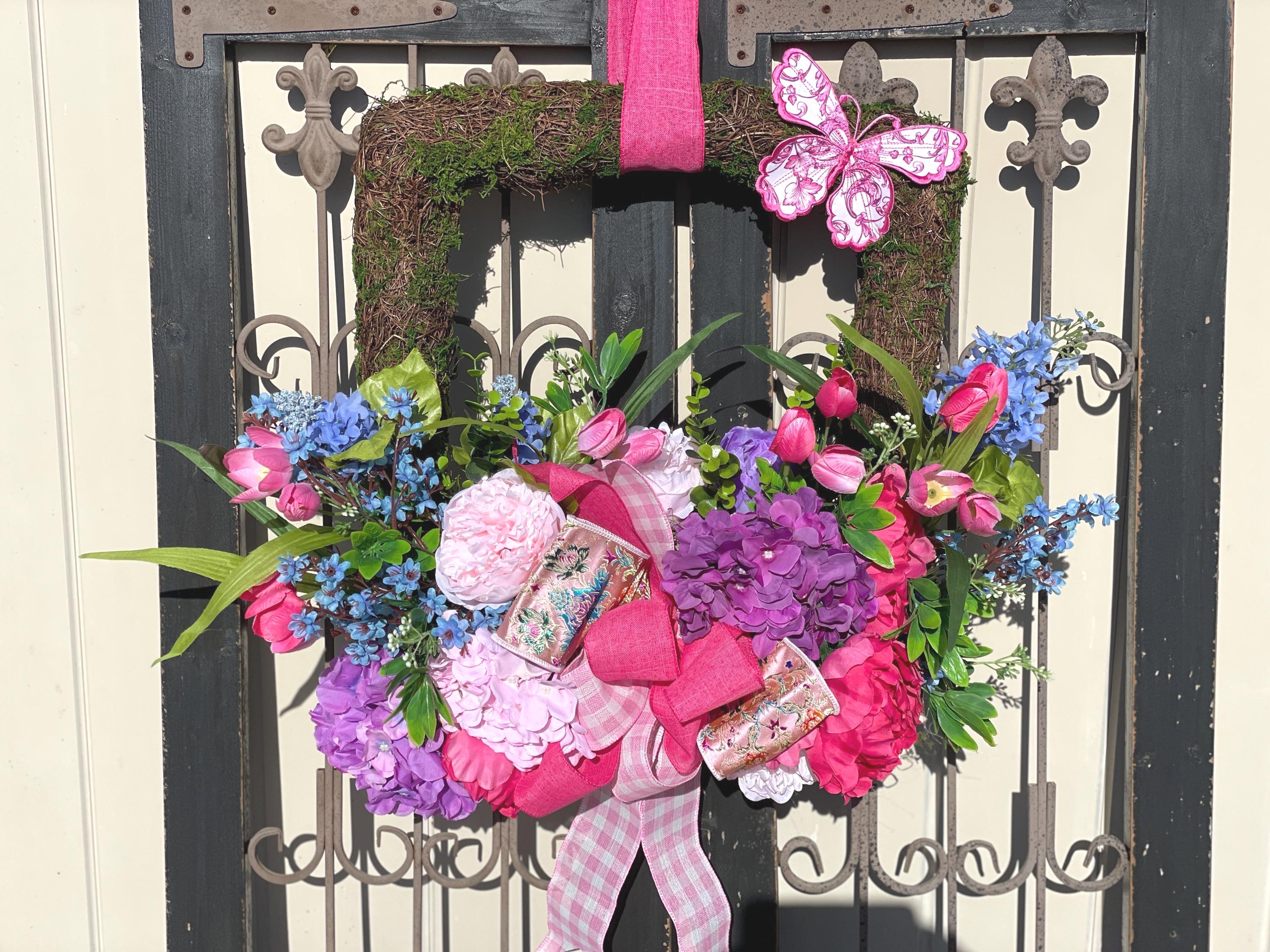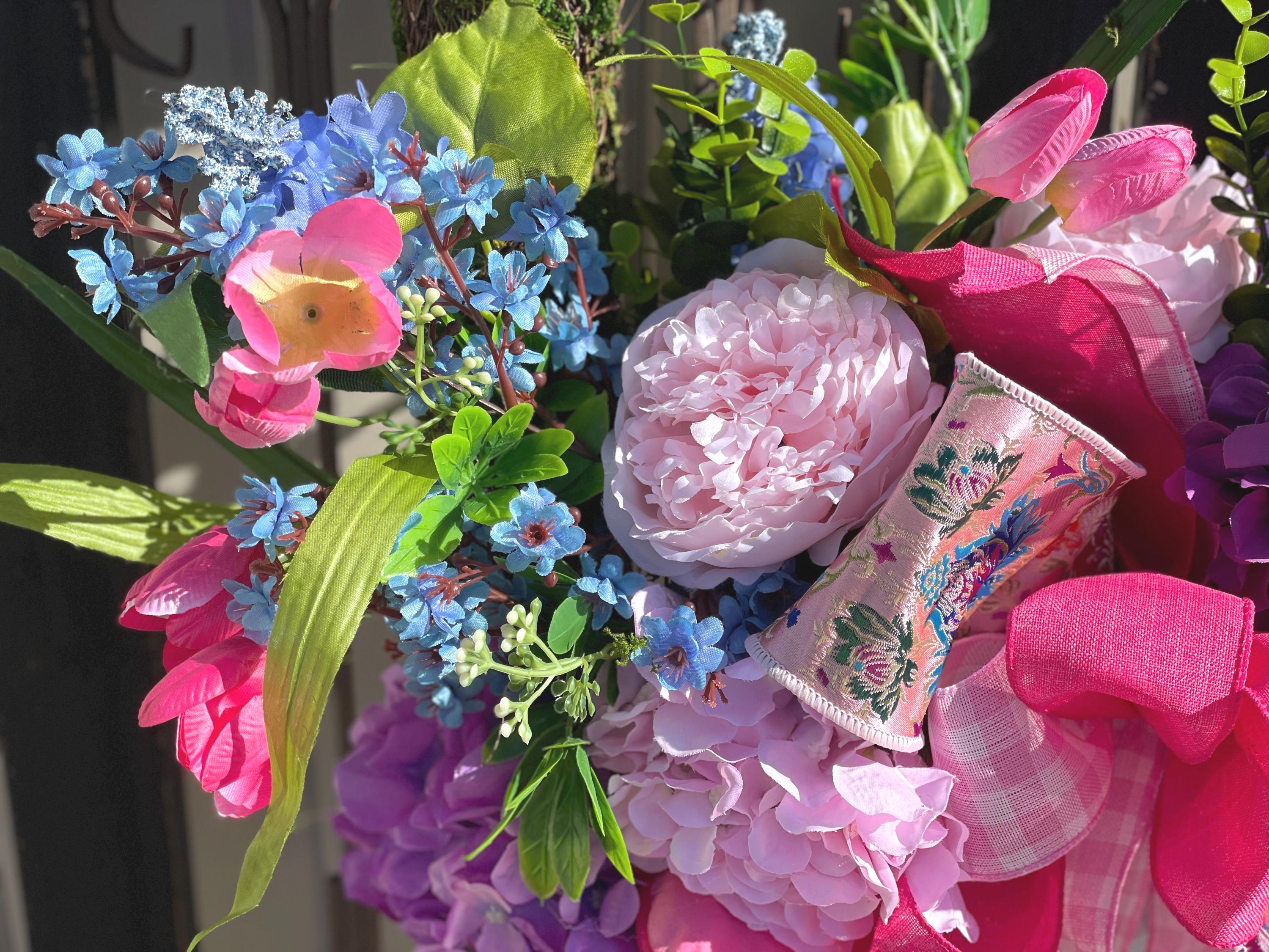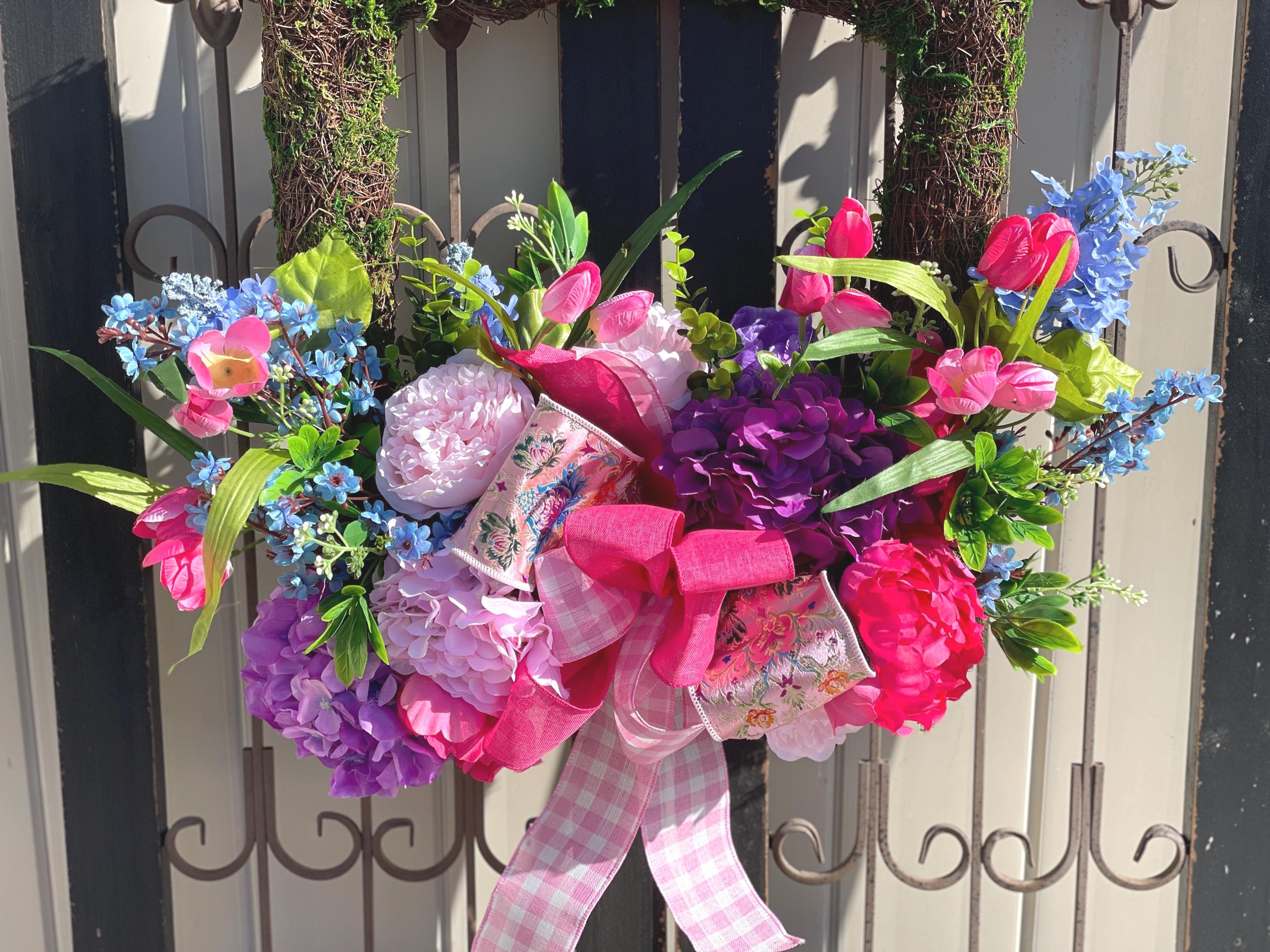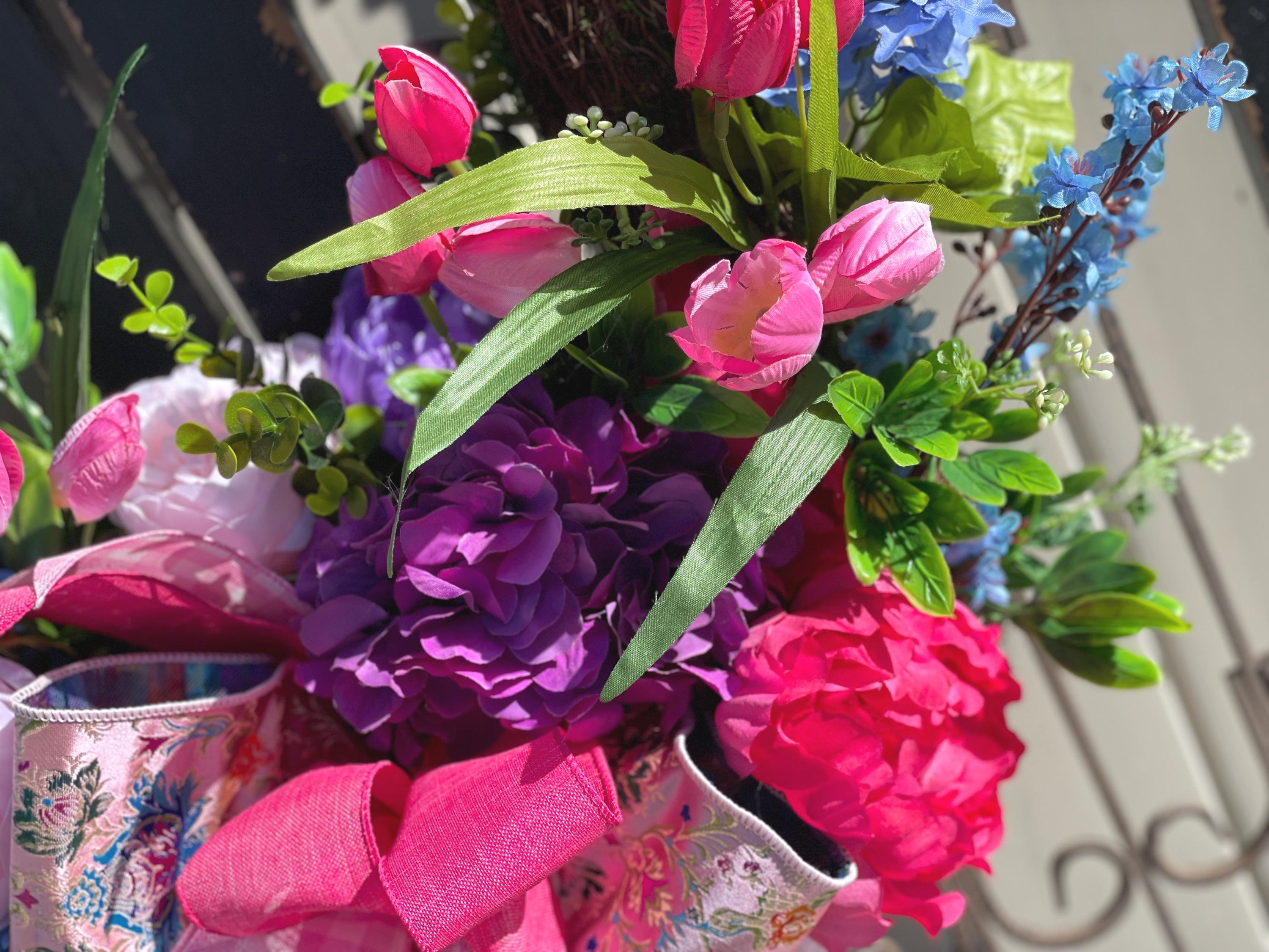 This Stunning wreath defiantly has the WOW factor! Set on a square moss wreath and filled with peony, hydrangea, tulips, spring flowers, designer ribbon and greens. Bright and colorful with pinks, blues, purples and fuchsias. This is such a beautiful wreath and perfect for your front door, or inside your home. Each design is one of a kind, the one in picture is the one you will receive. Ready to ship:)