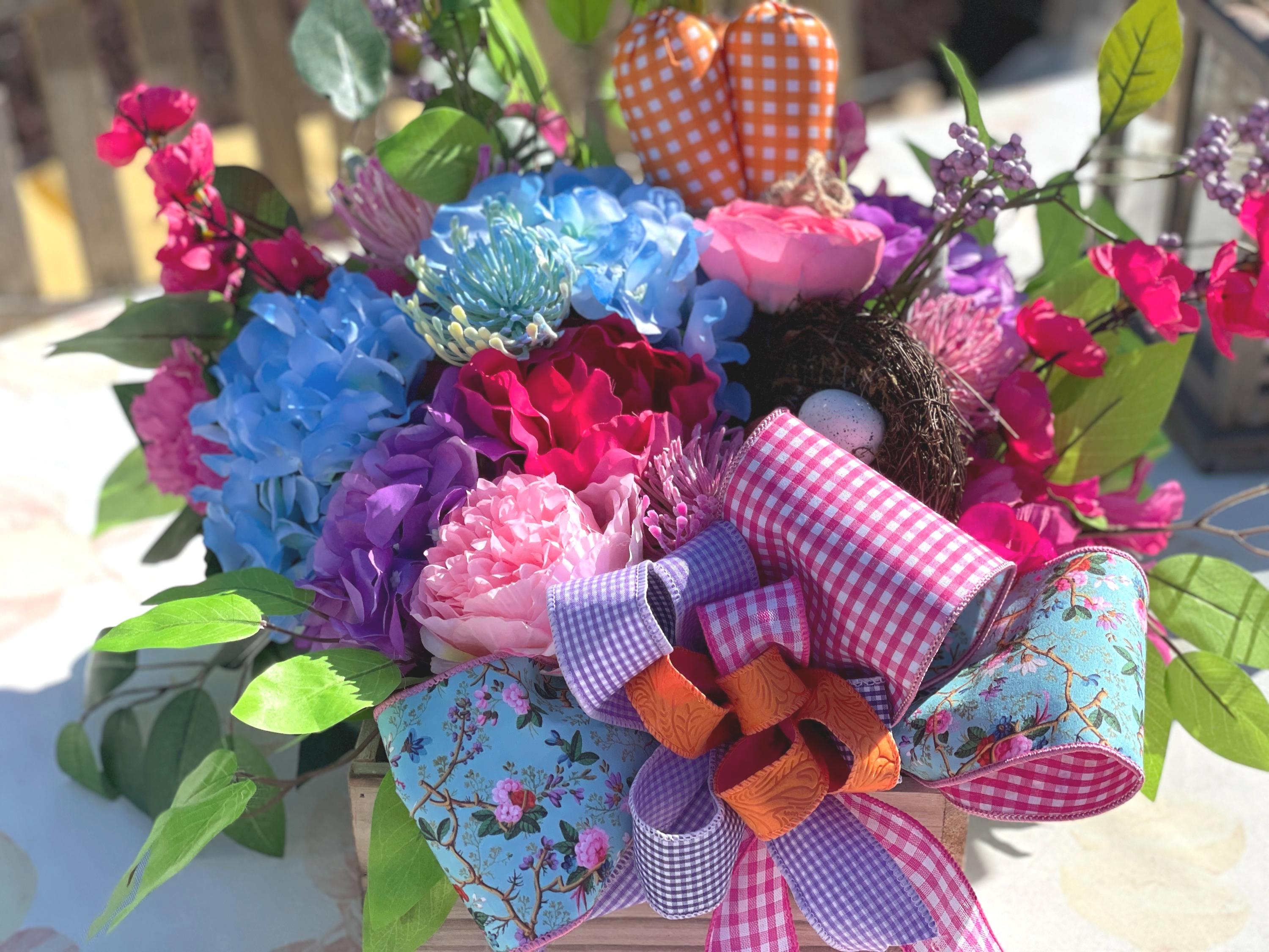 This beautiful spring arrangement is filled with designer ribbons, beautiful spring flowers of hydrangeas, peony, bright green leaves, various bright flowers and seeds. This is so bright and colorful! Perfect for your dining table, entry table, side table, kitchen, coffee table or give as a special gift.