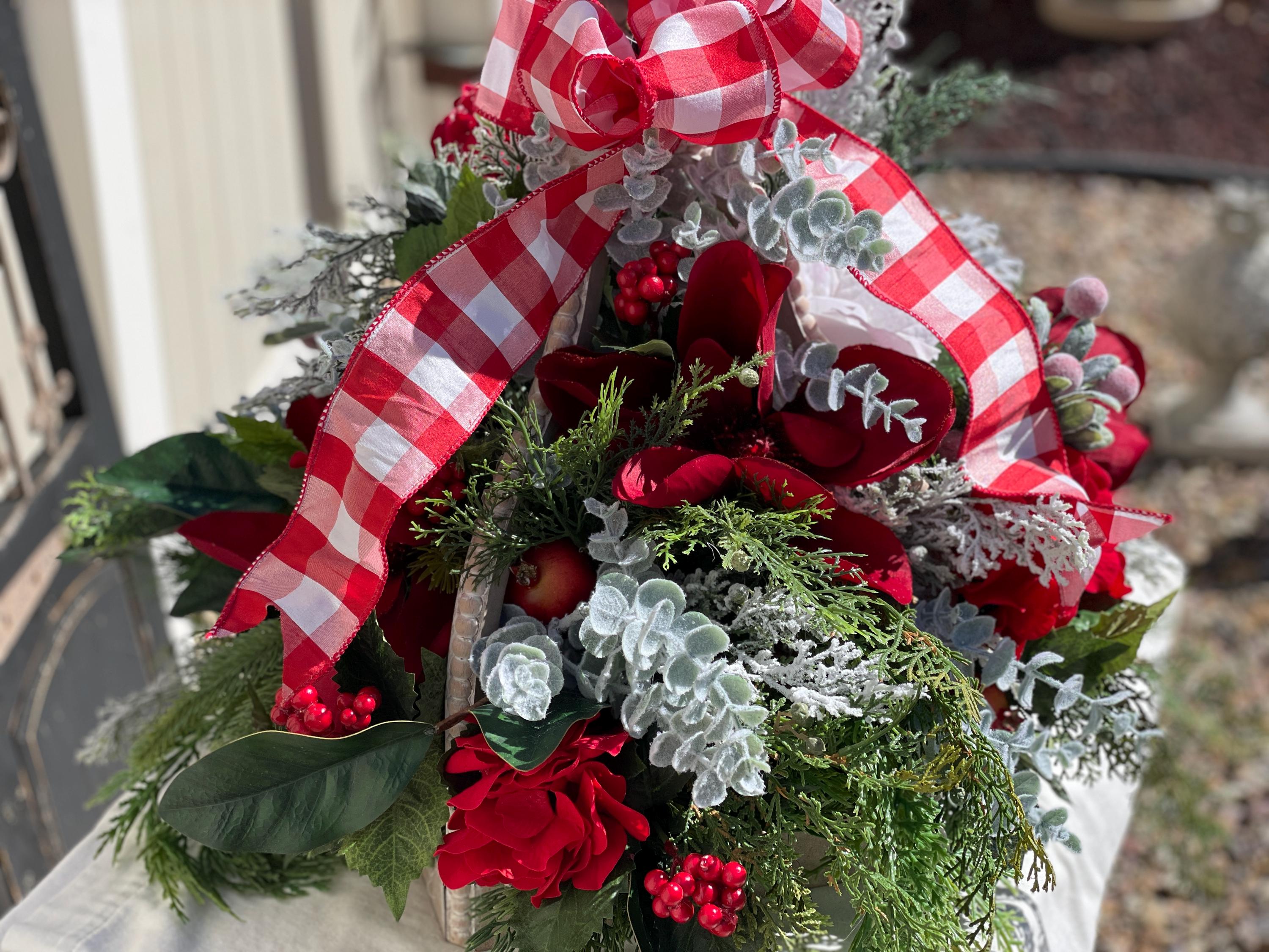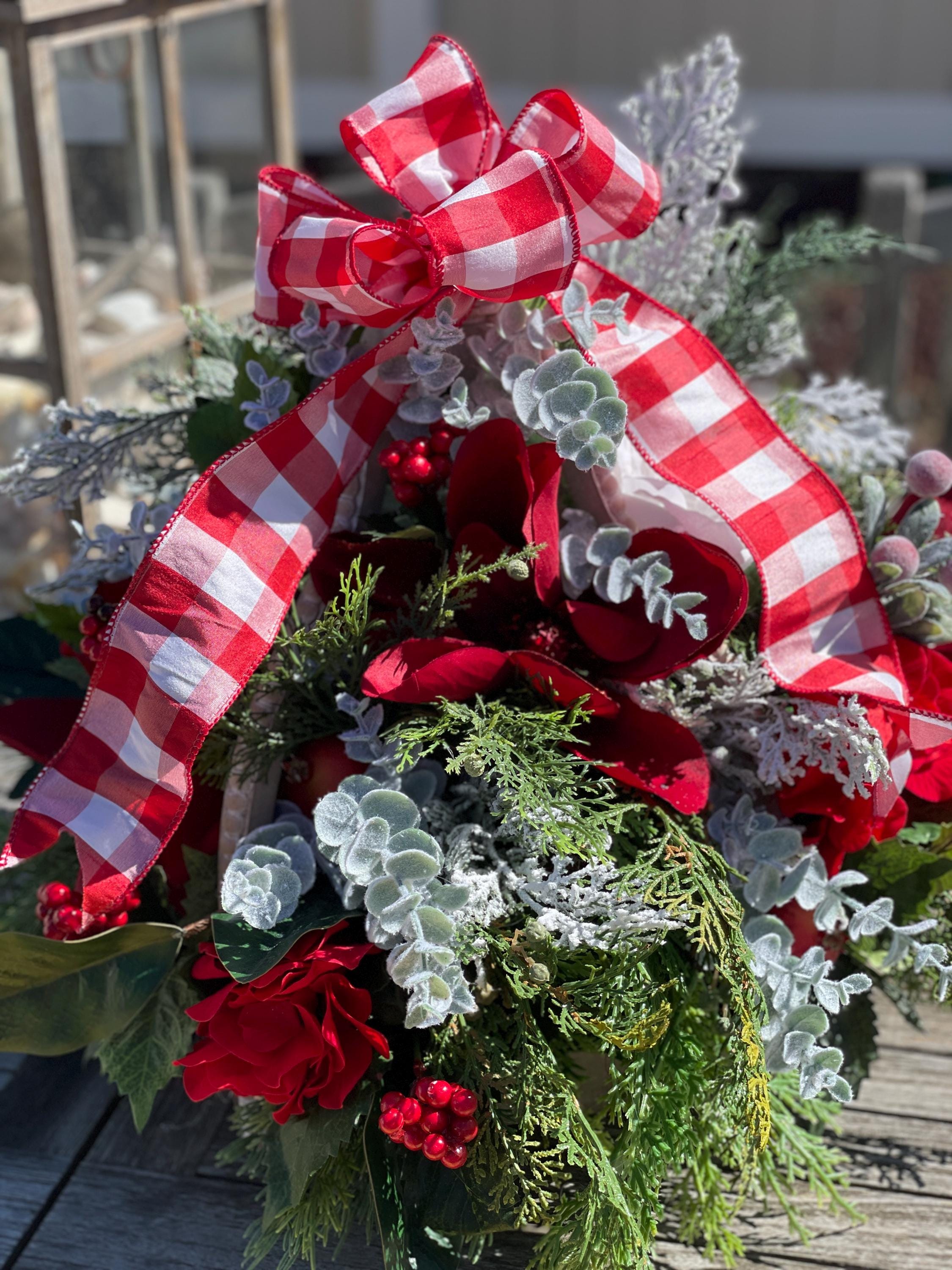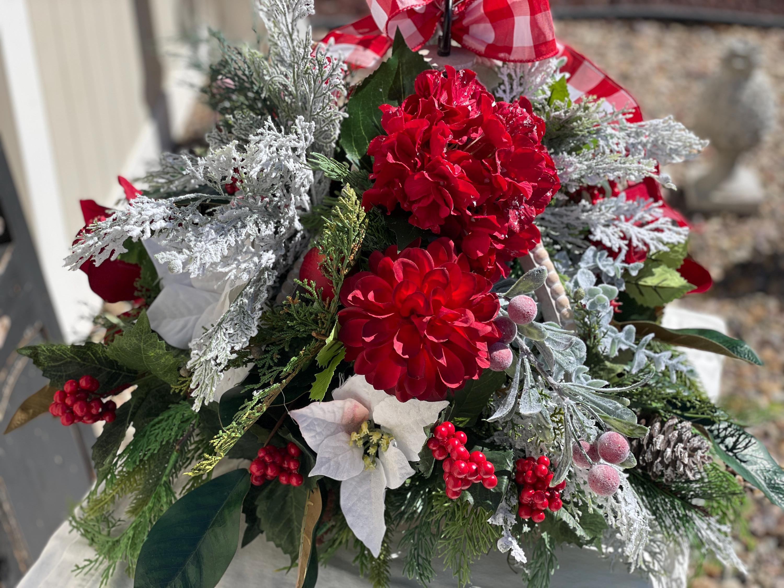 This large lantern is filled with winter greens, poinsettias, red hydrangeas, pomegranates, winter berries and a beautiful d stevens ribbon on top. It's perfect for your winter decor, dining table, entry table, coffee table, kitchen island or to give as a special gift. It's a stunning piece!