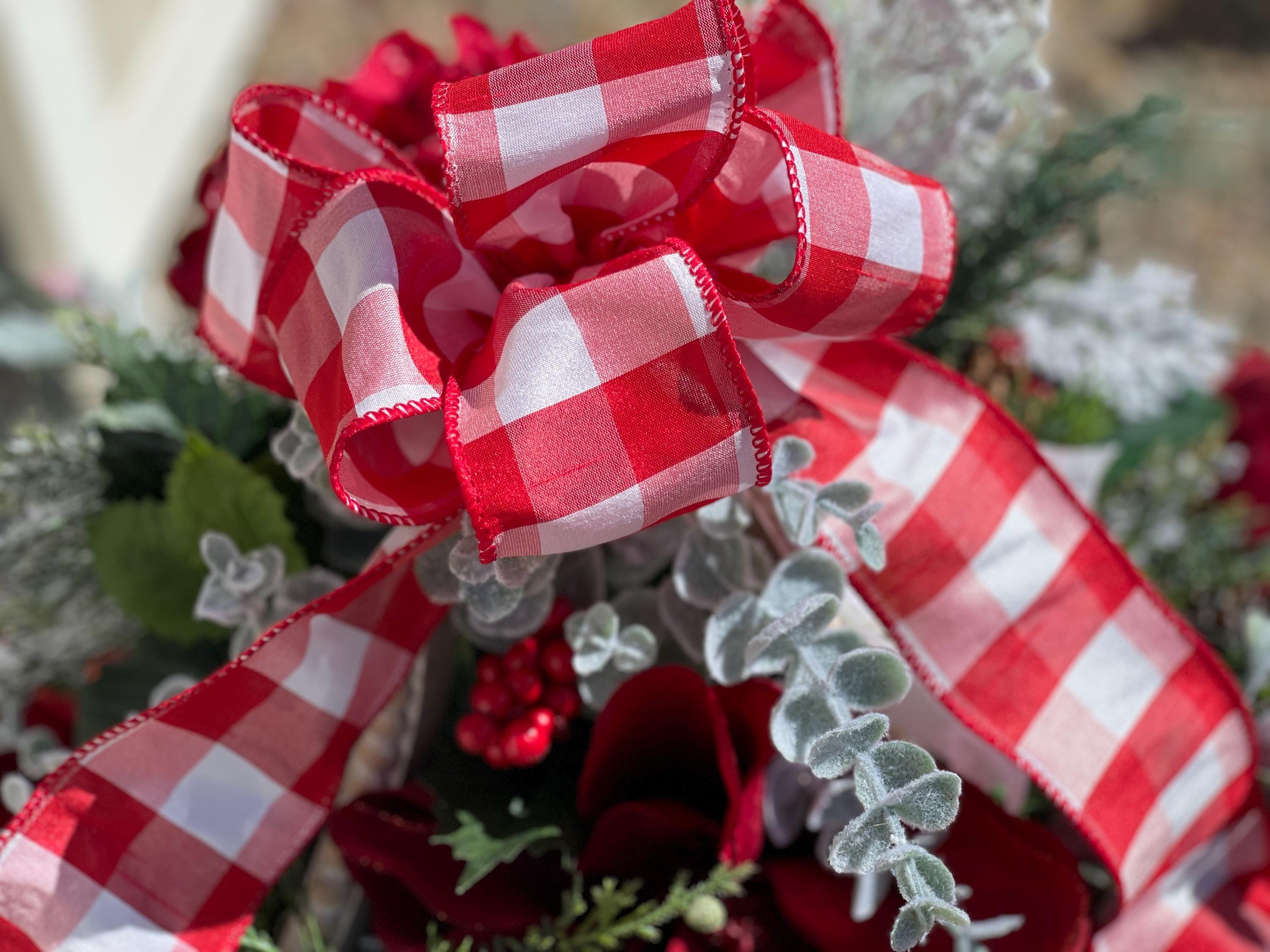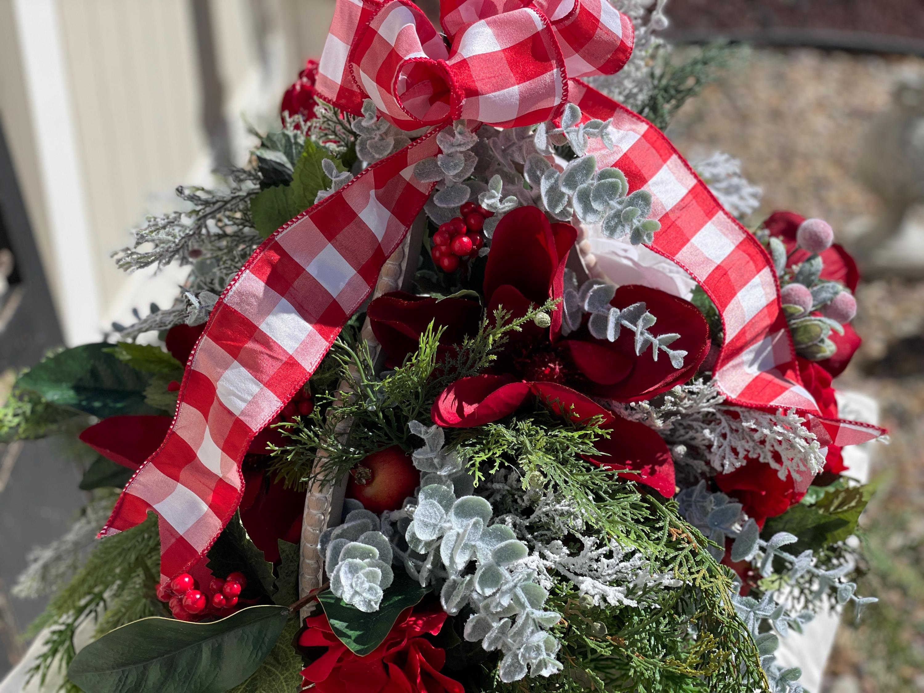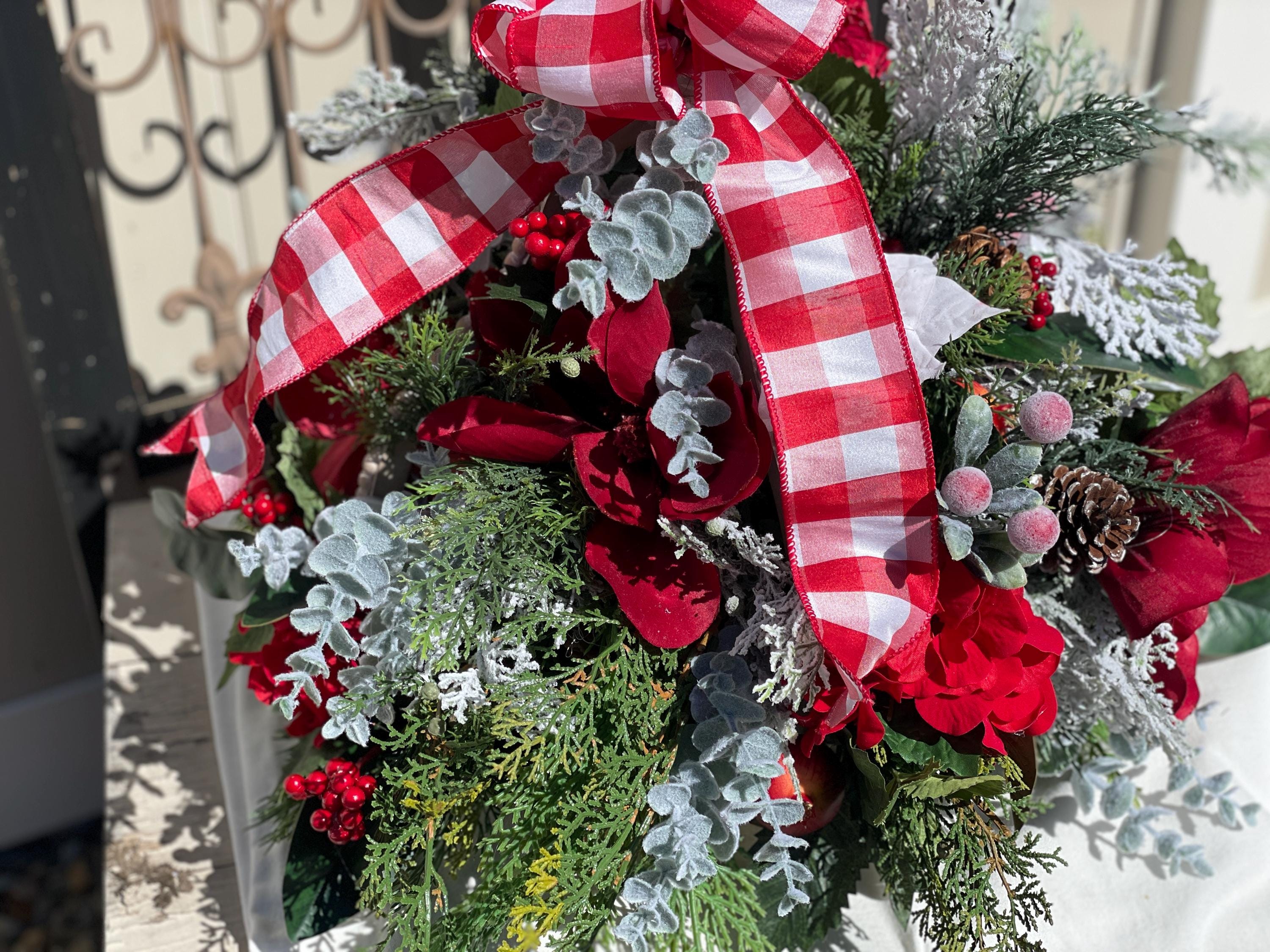 This large lantern is filled with winter greens, poinsettias, red hydrangeas, pomegranates, winter berries and a beautiful d stevens ribbon on top. It's perfect for your winter decor, dining table, entry table, coffee table, kitchen island or to give as a special gift. It's a stunning piece!