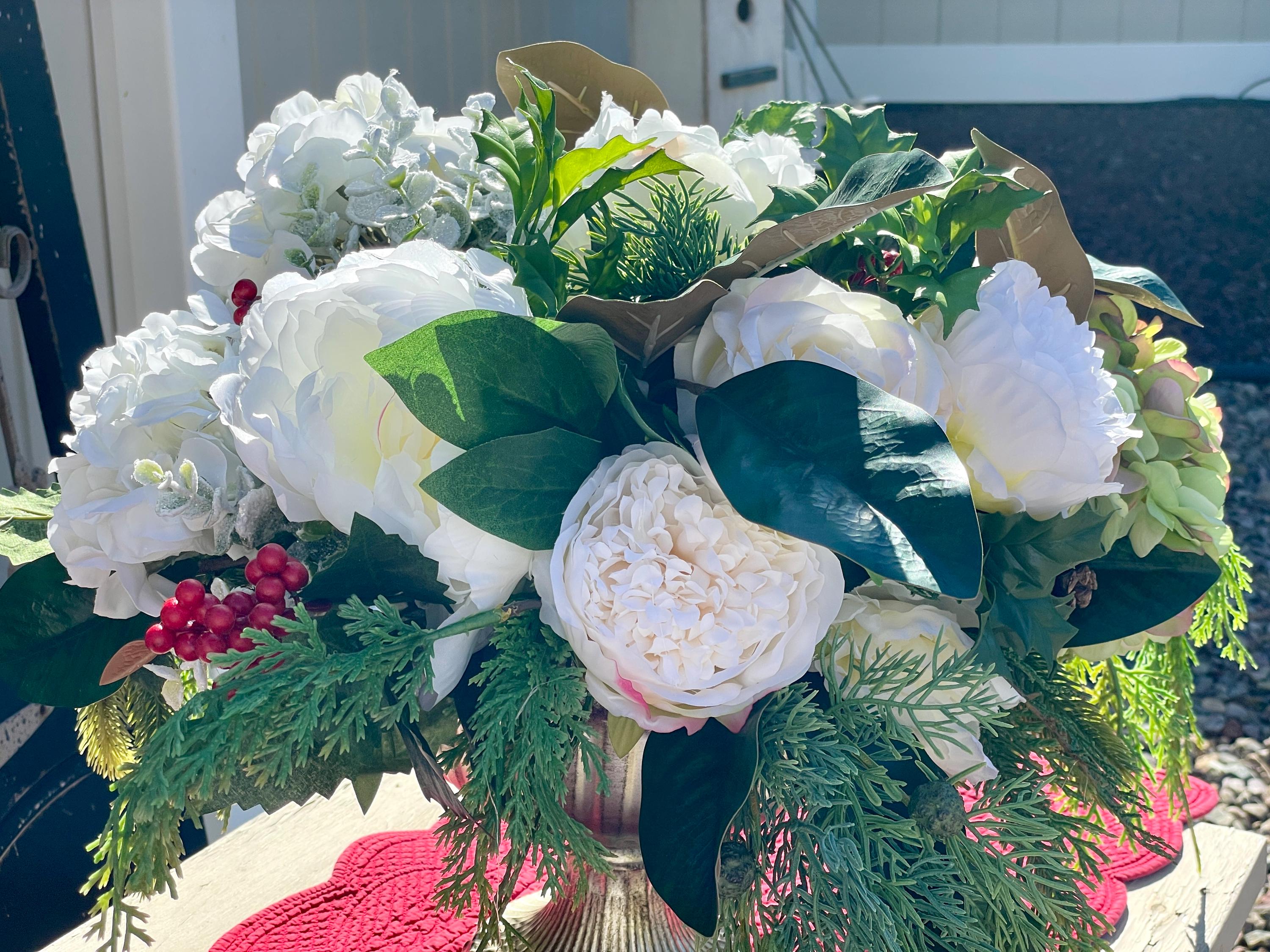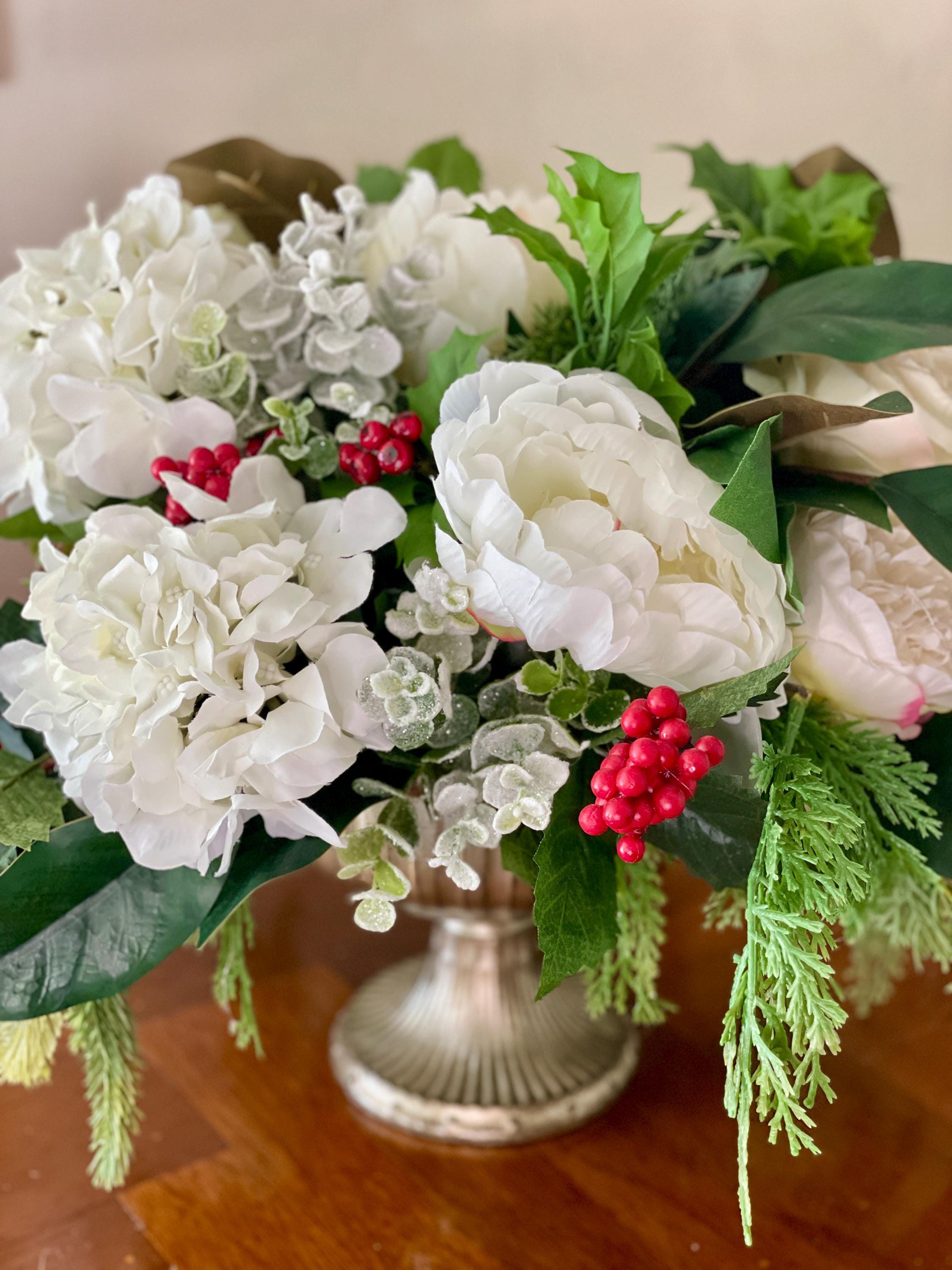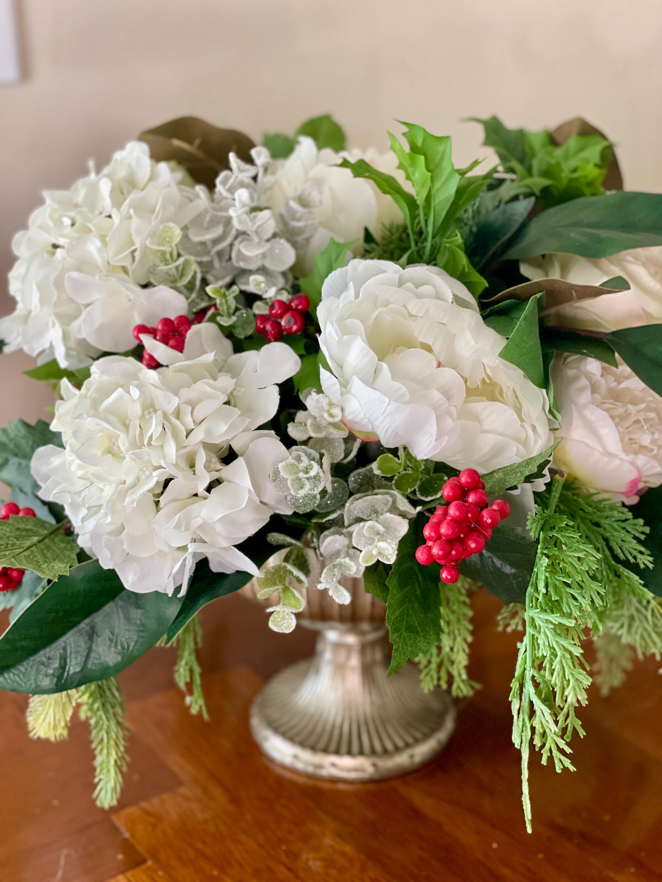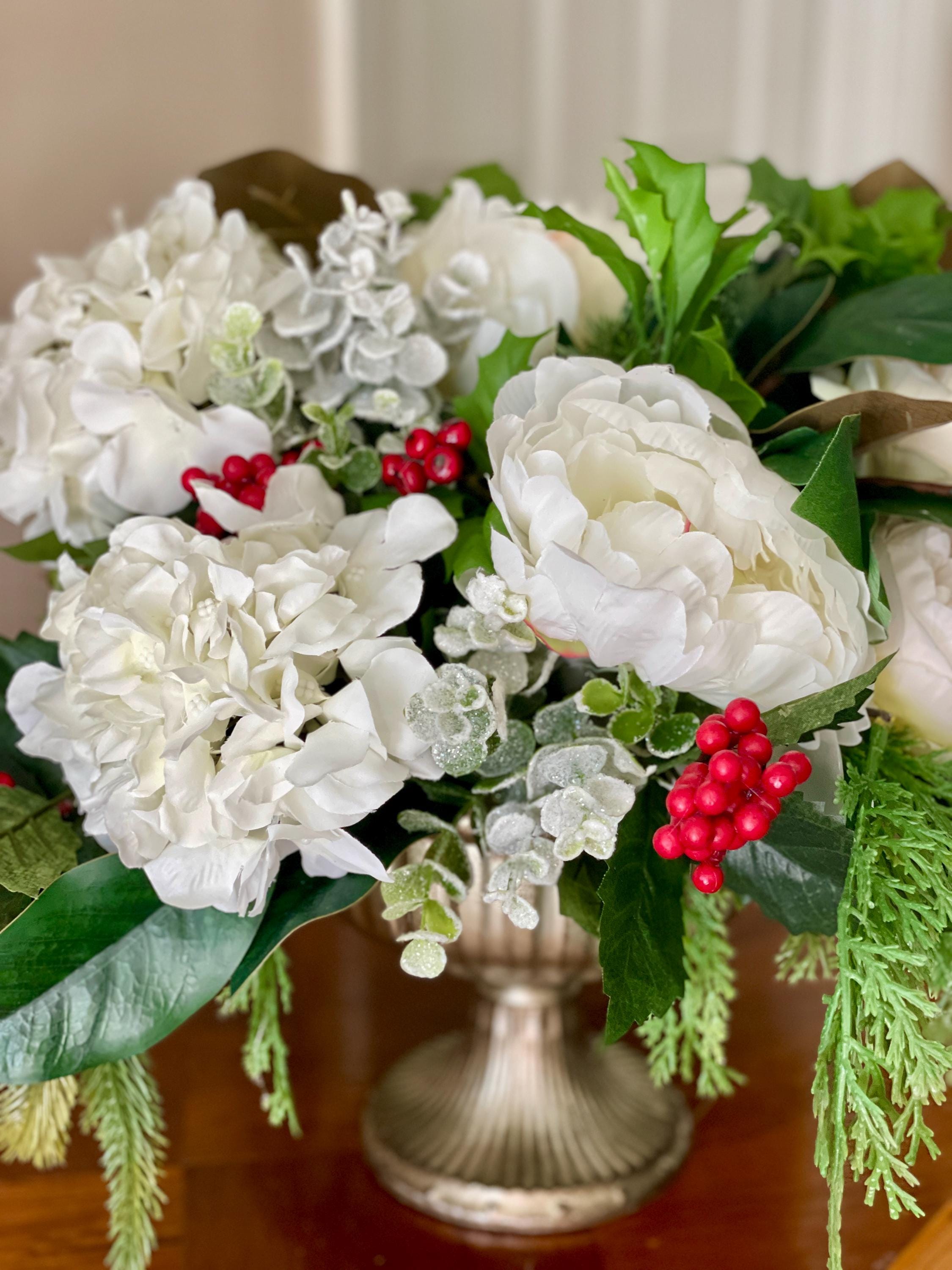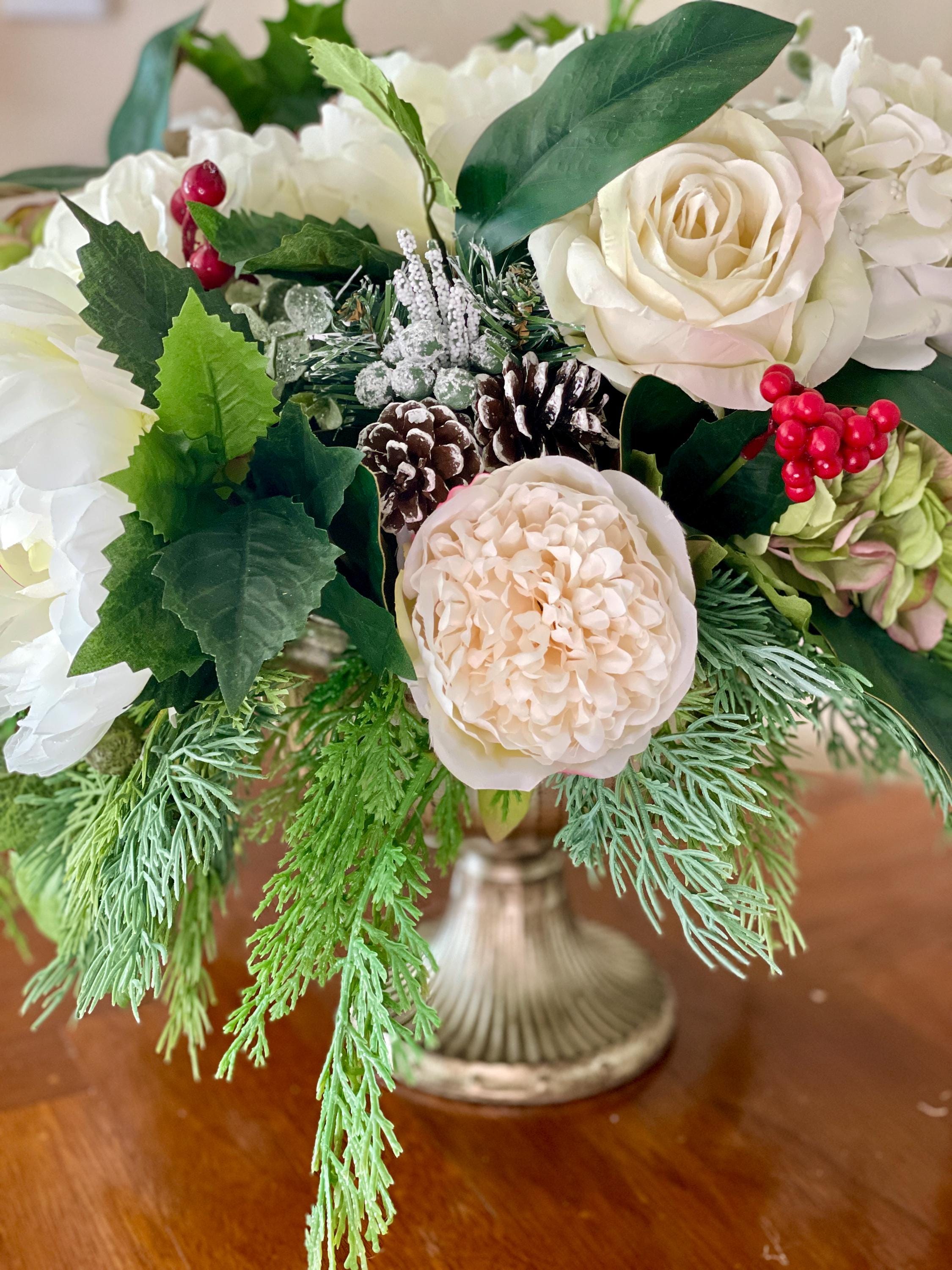 This stunning winter floral arrangement is perfect for the Winter Season! Filled with white peony, hydrangea, rose, winter greens, magnolia, berries, pinecones and set in a beautiful pedestal container. Perfect for your dining table, entry table, kitchen island, coffee table, side table or give as a special gift. This will go with many types of decor:):)