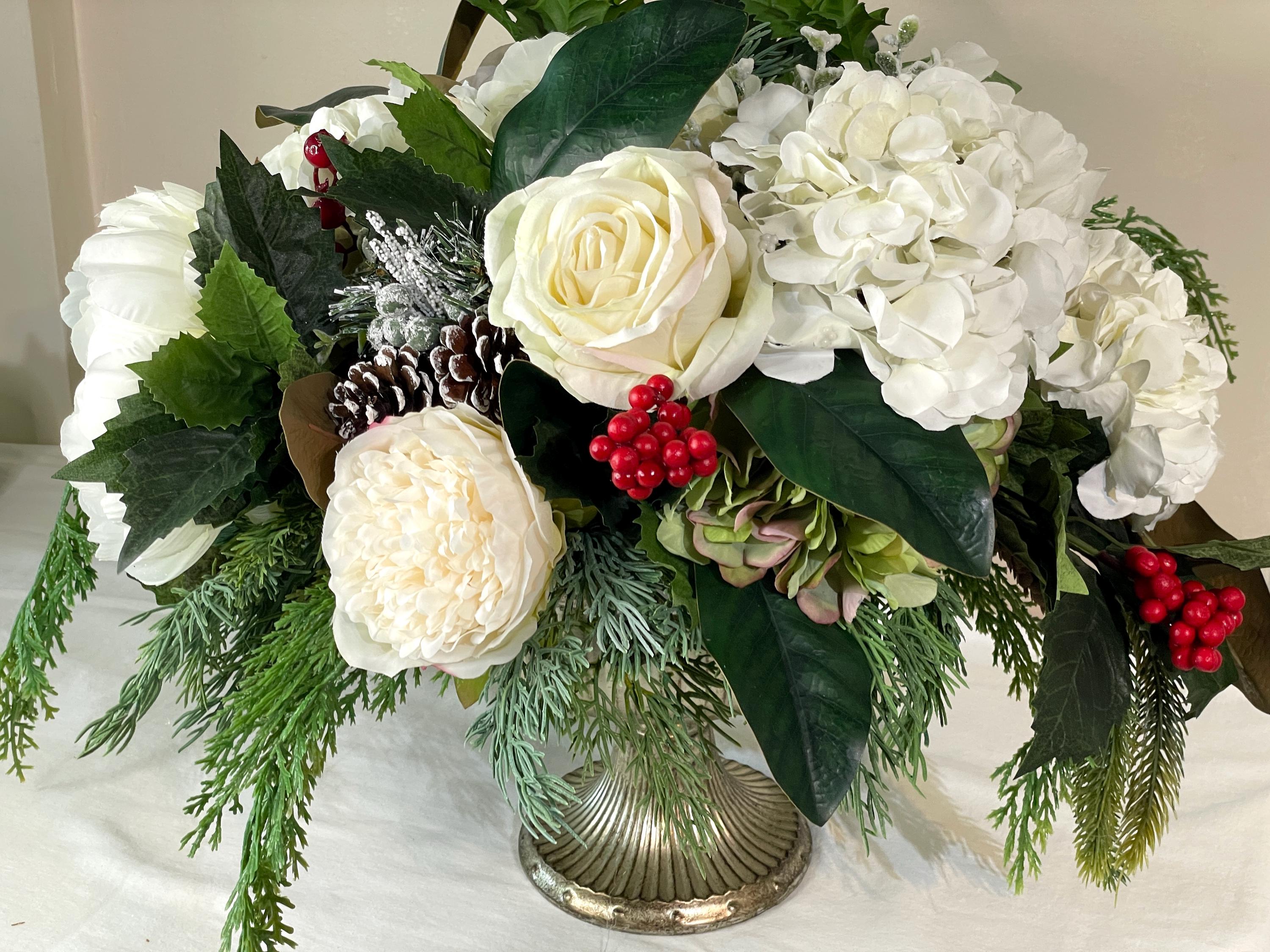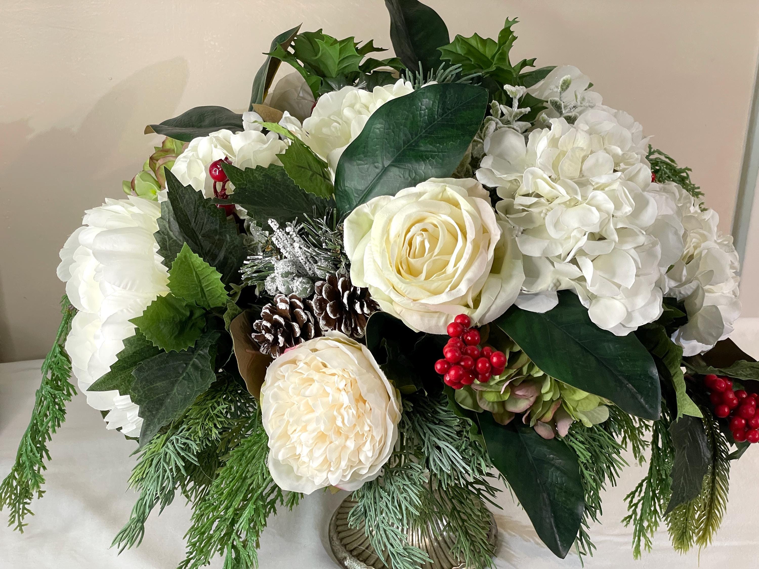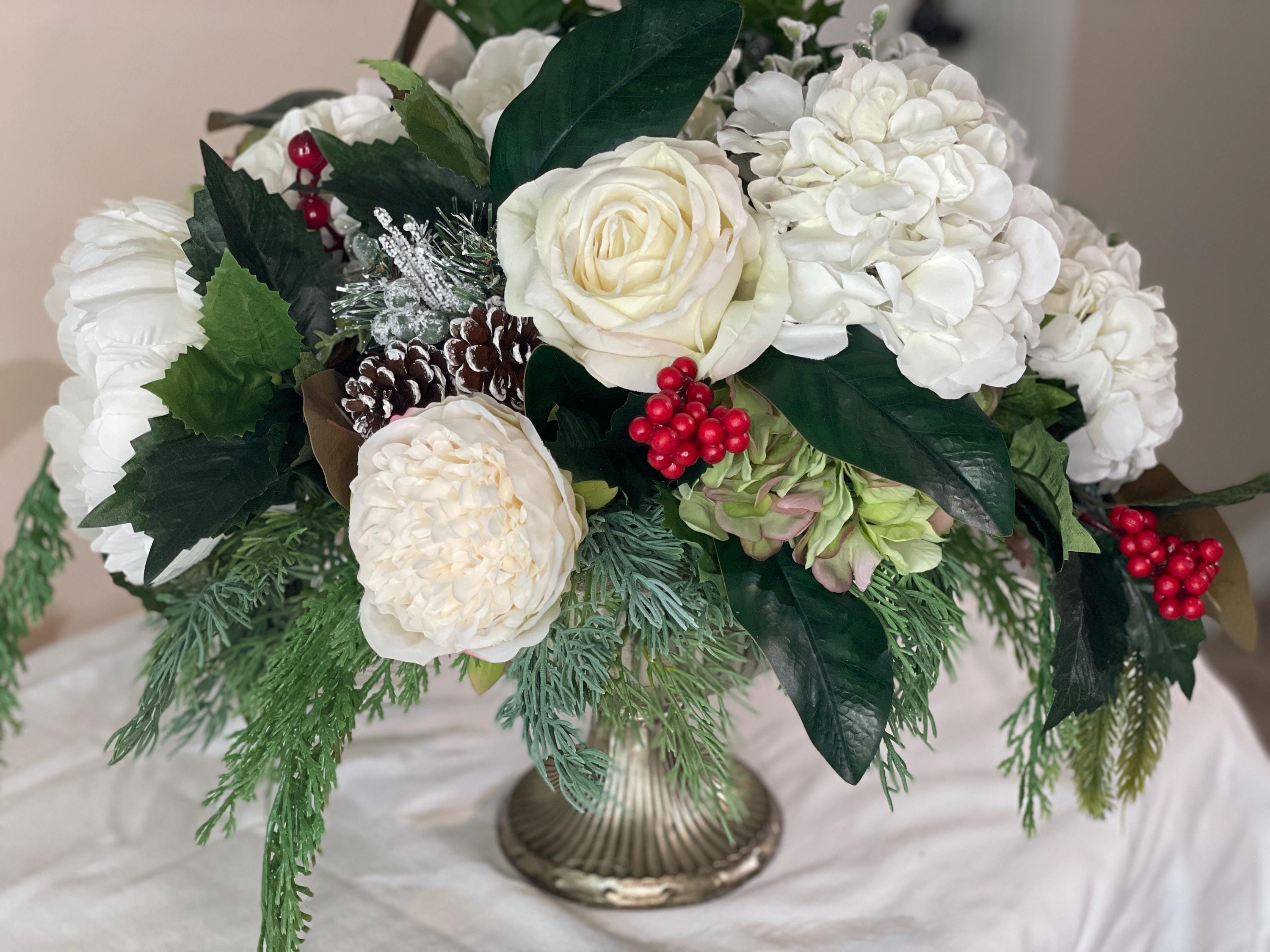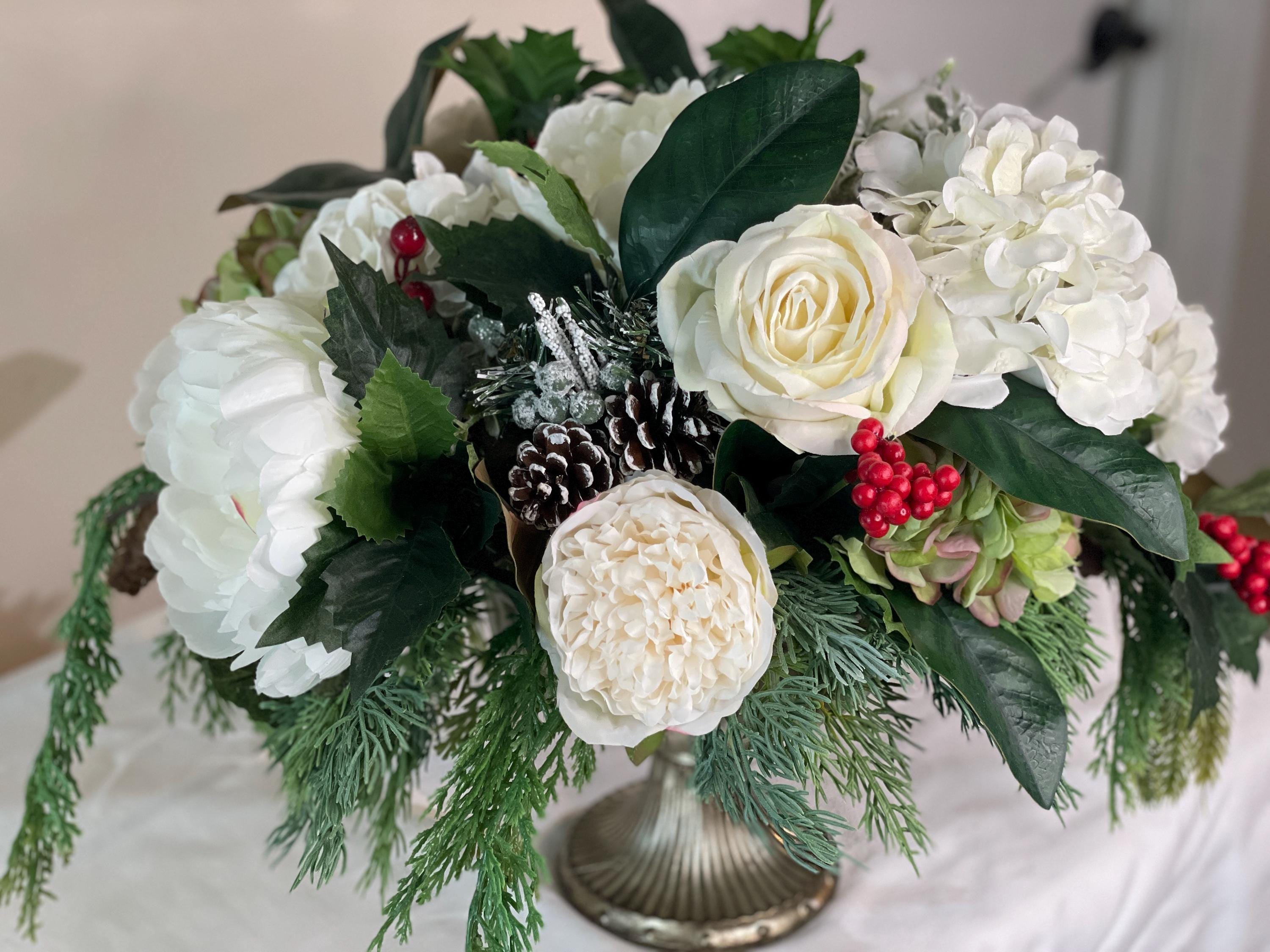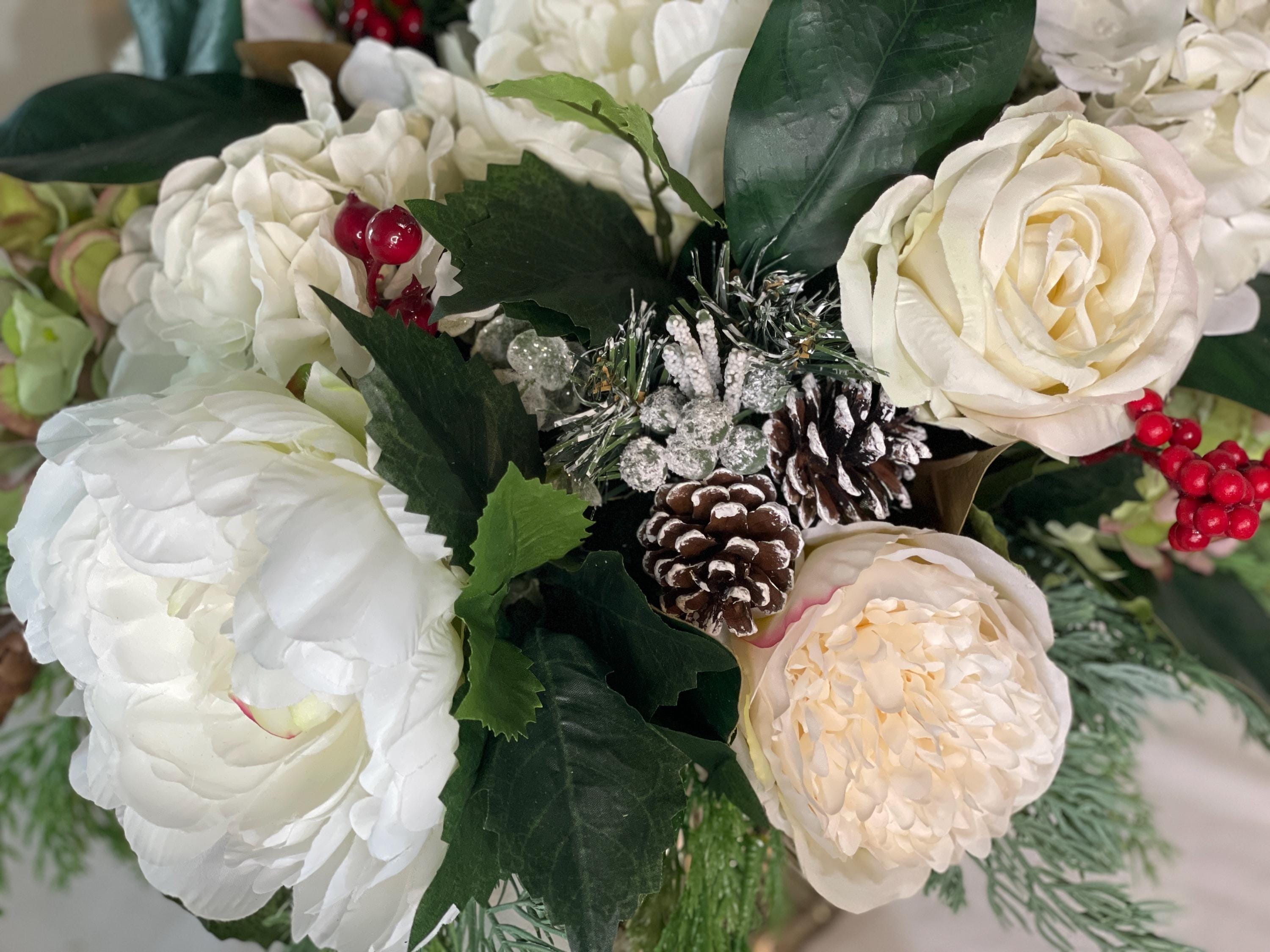 This stunning winter floral arrangement is perfect for the Winter Season! Filled with white peony, hydrangea, rose, winter greens, magnolia, berries, pinecones and set in a beautiful pedestal container. Perfect for your dining table, entry table, kitchen island, coffee table, side table or give as a special gift. This will go with many types of decor:):)