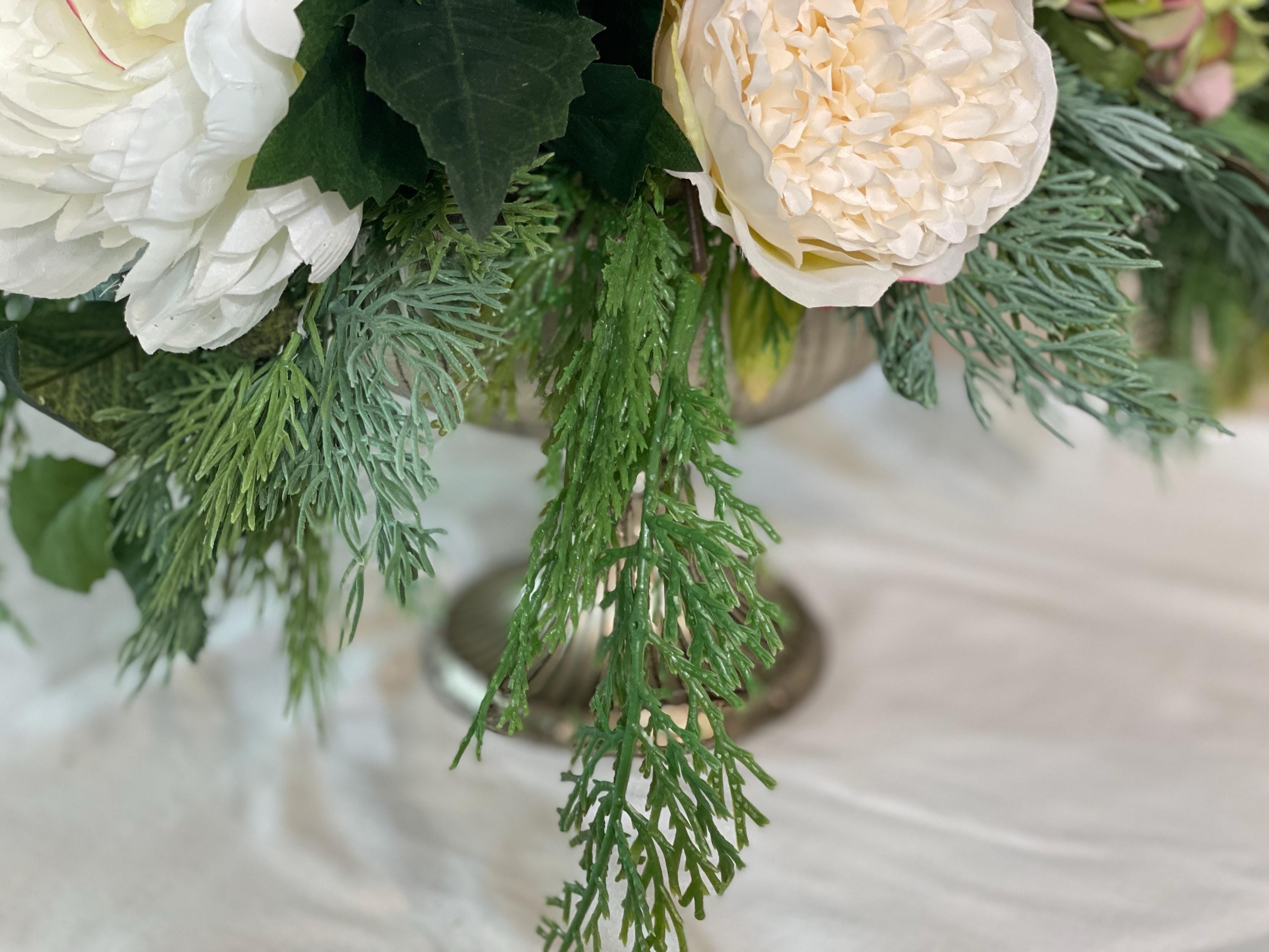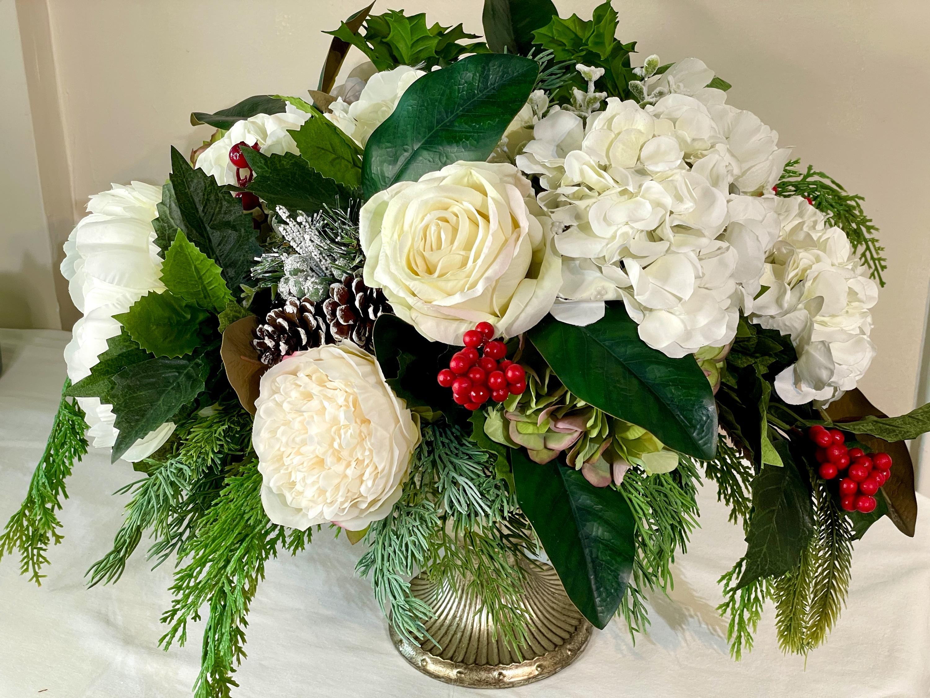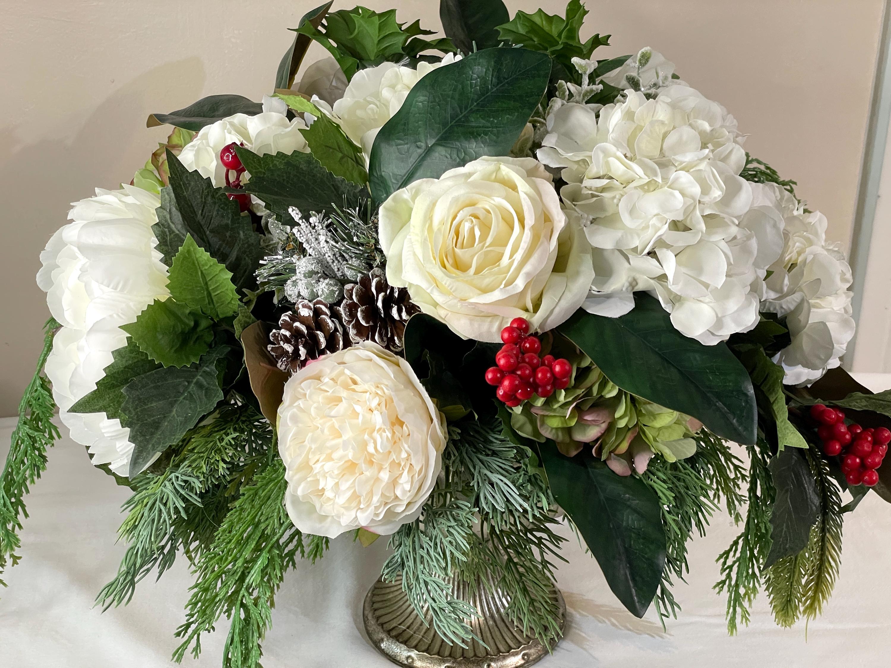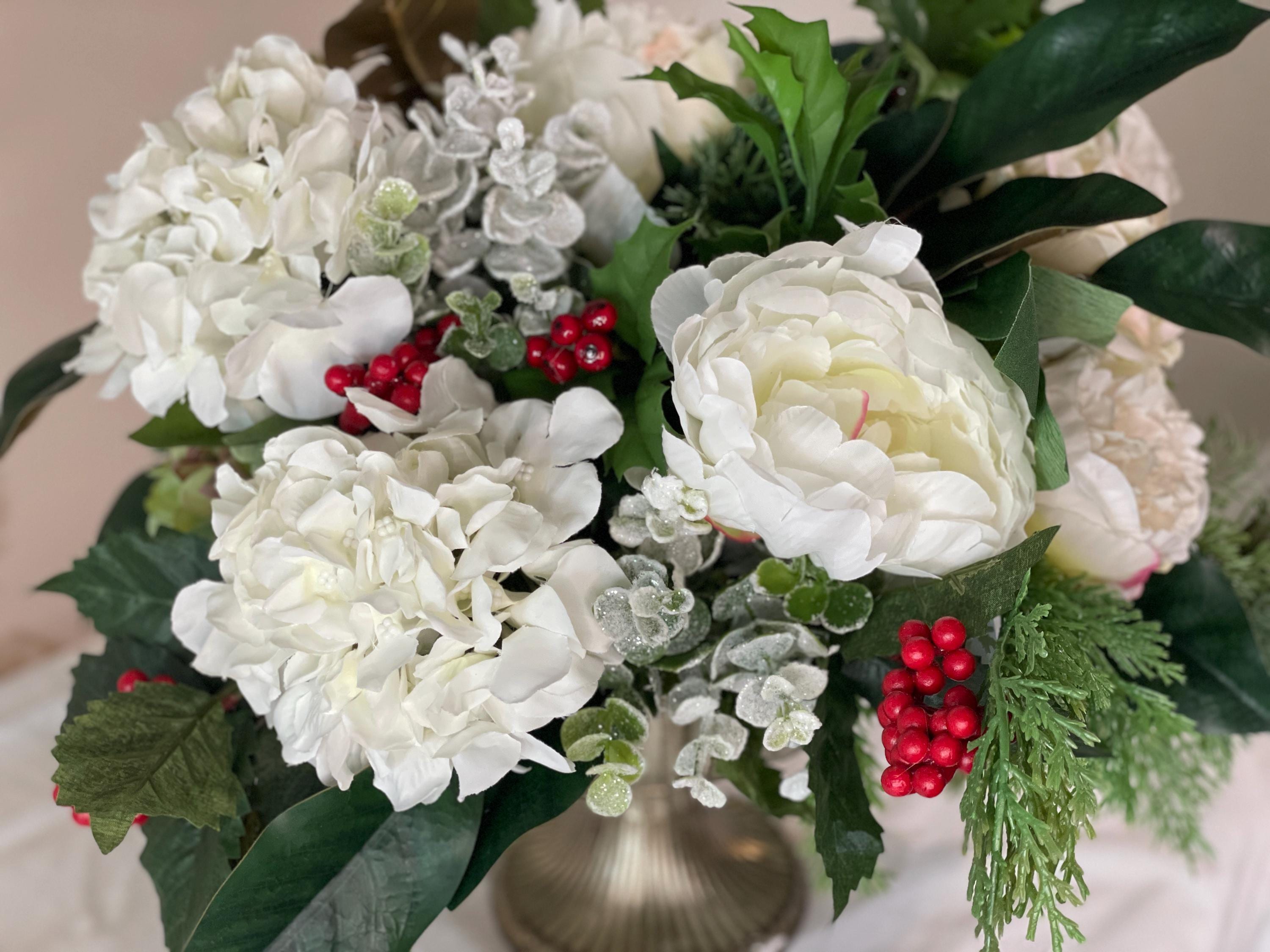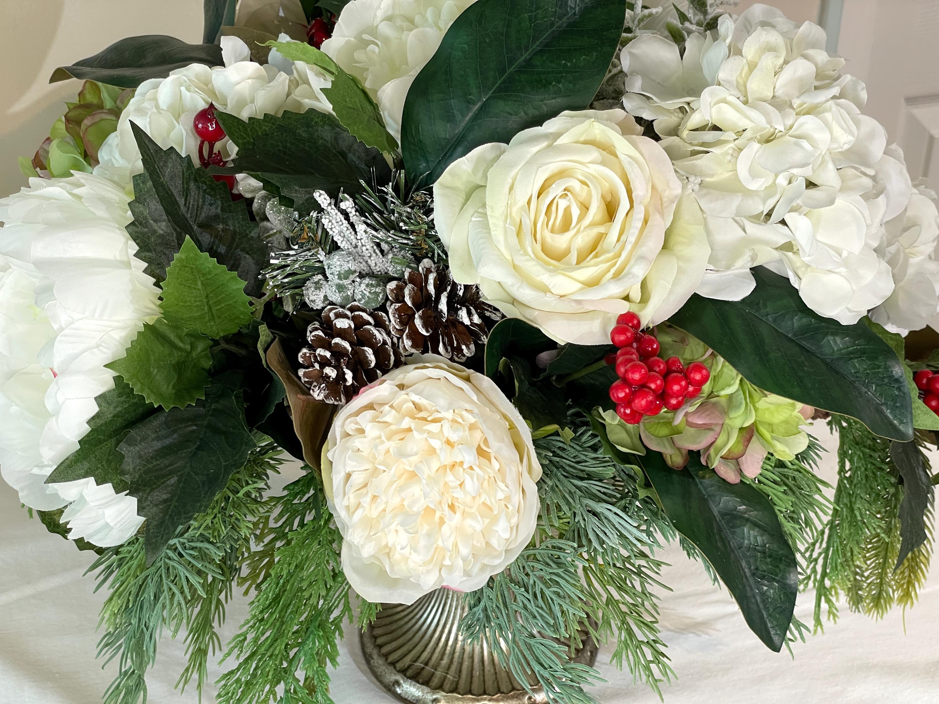 This stunning winter floral arrangement is perfect for the Winter Season! Filled with white peony, hydrangea, rose, winter greens, magnolia, berries, pinecones and set in a beautiful pedestal container. Perfect for your dining table, entry table, kitchen island, coffee table, side table or give as a special gift. This will go with many types of decor:):)