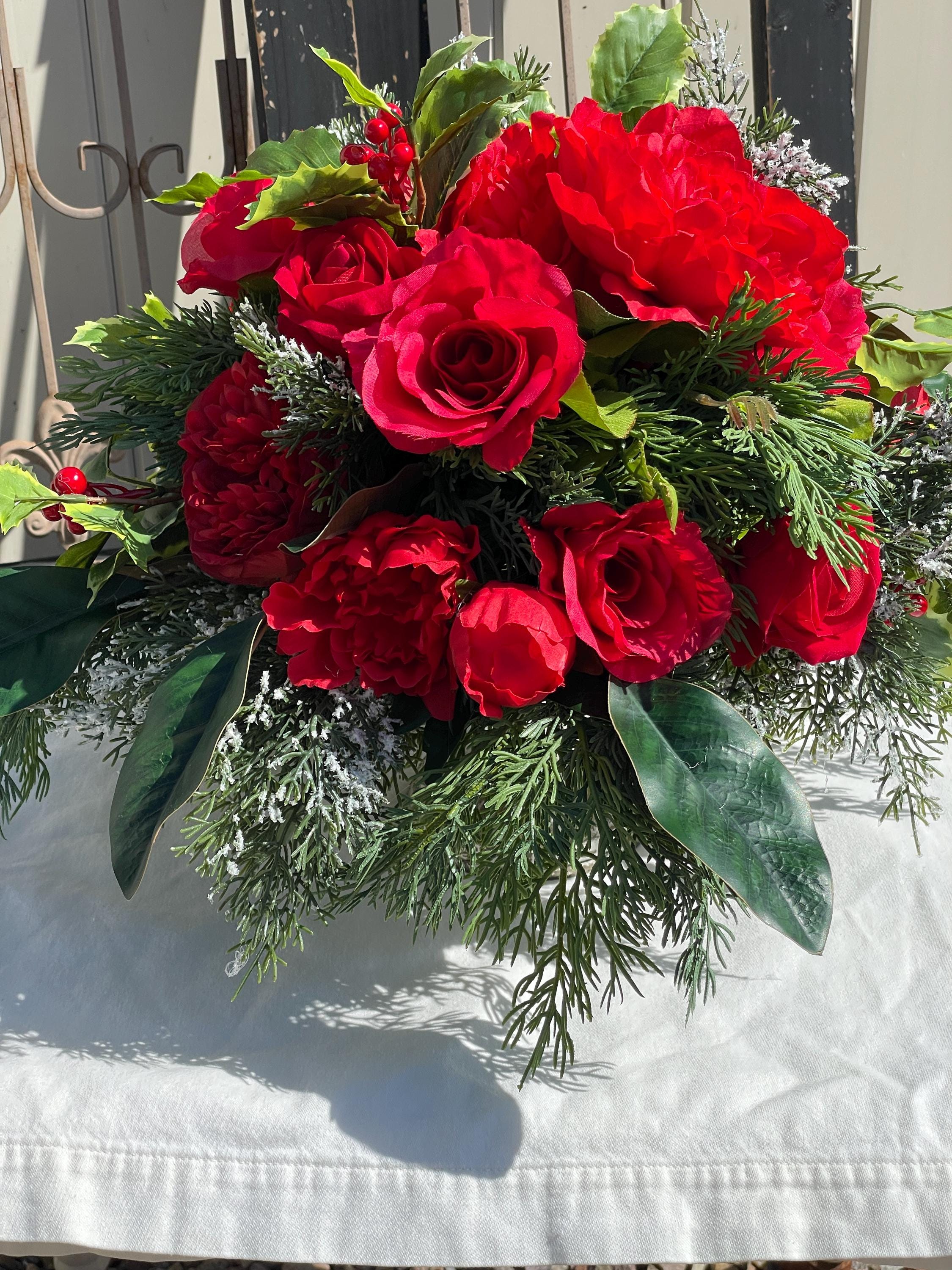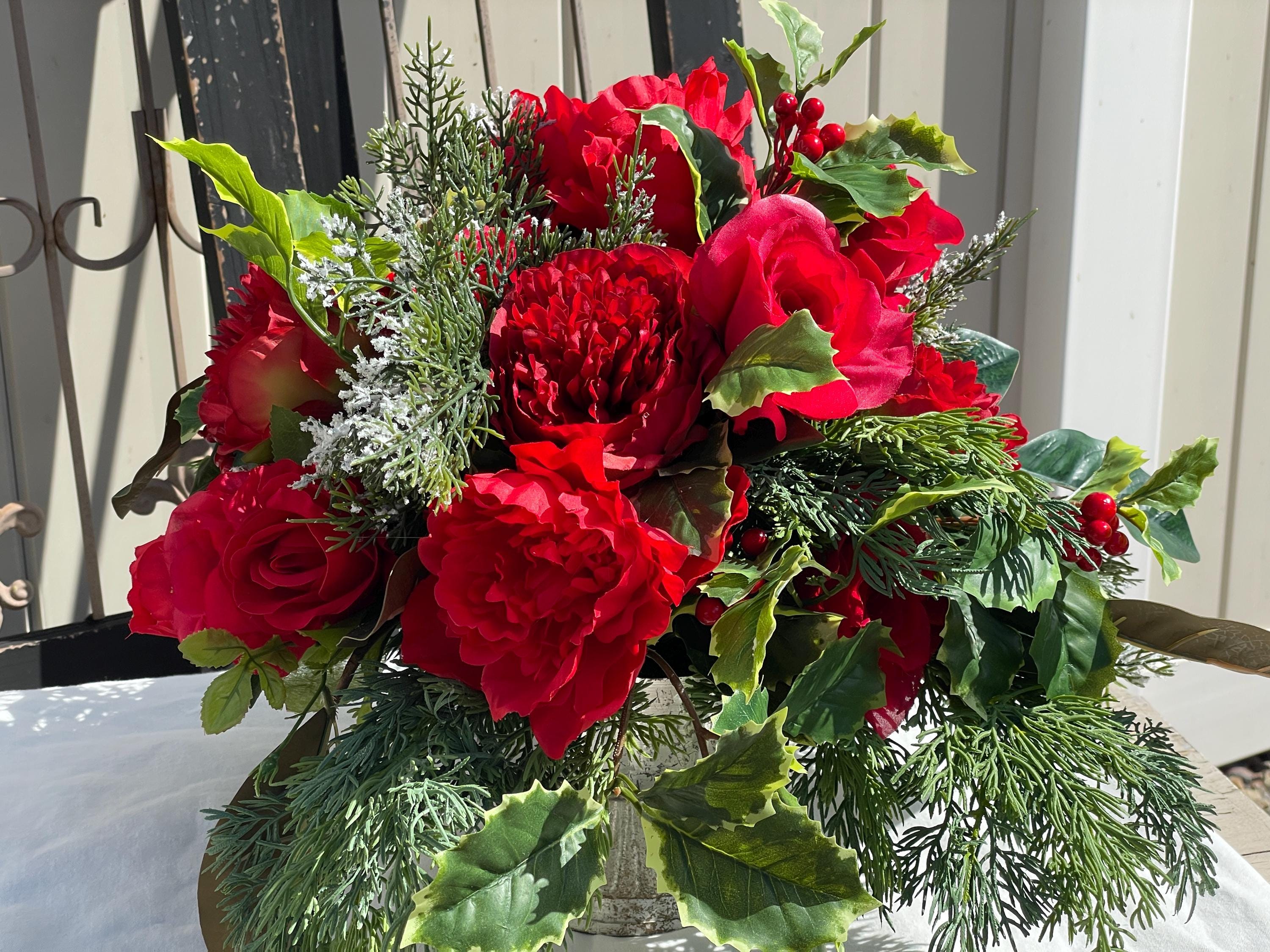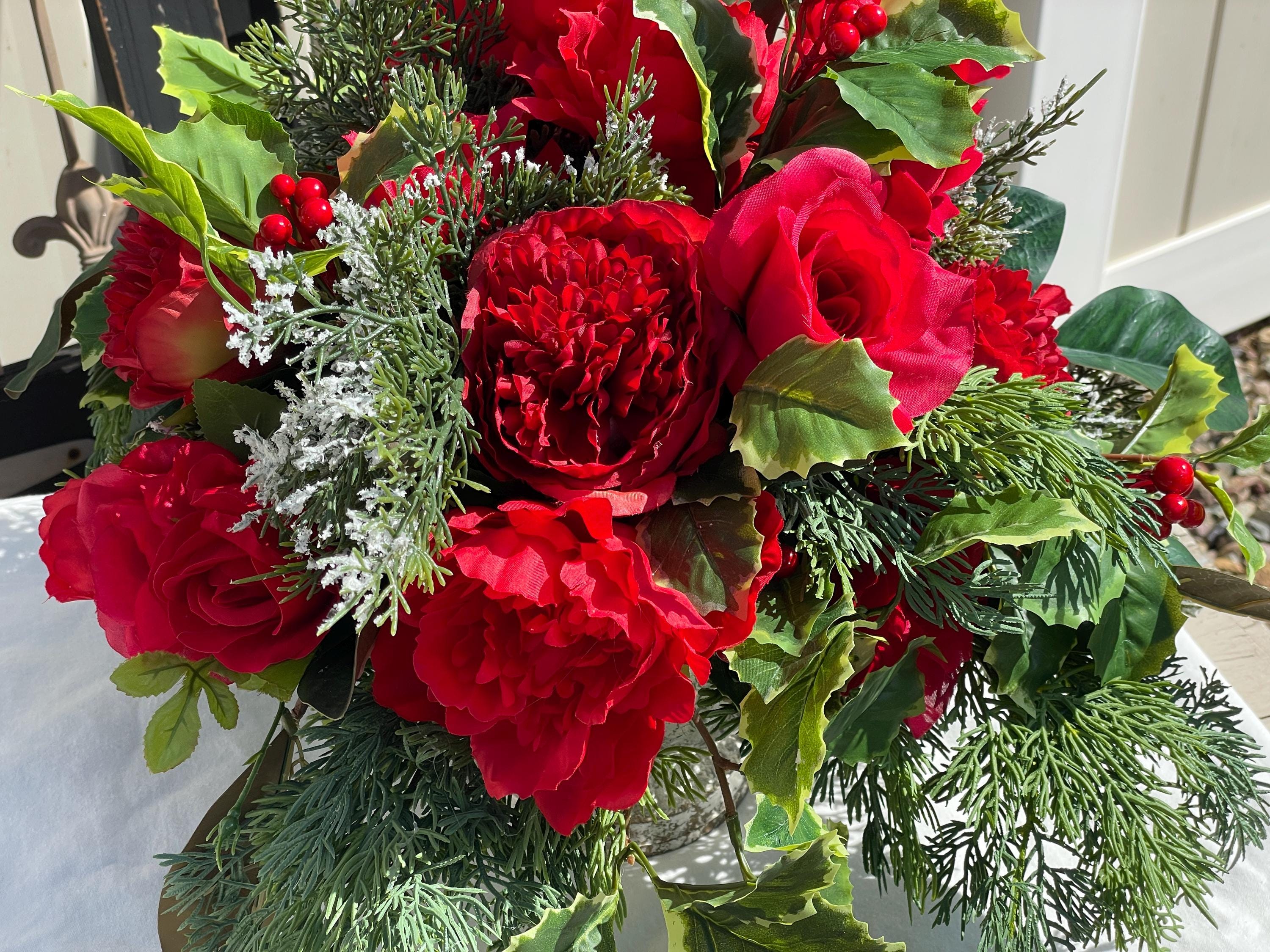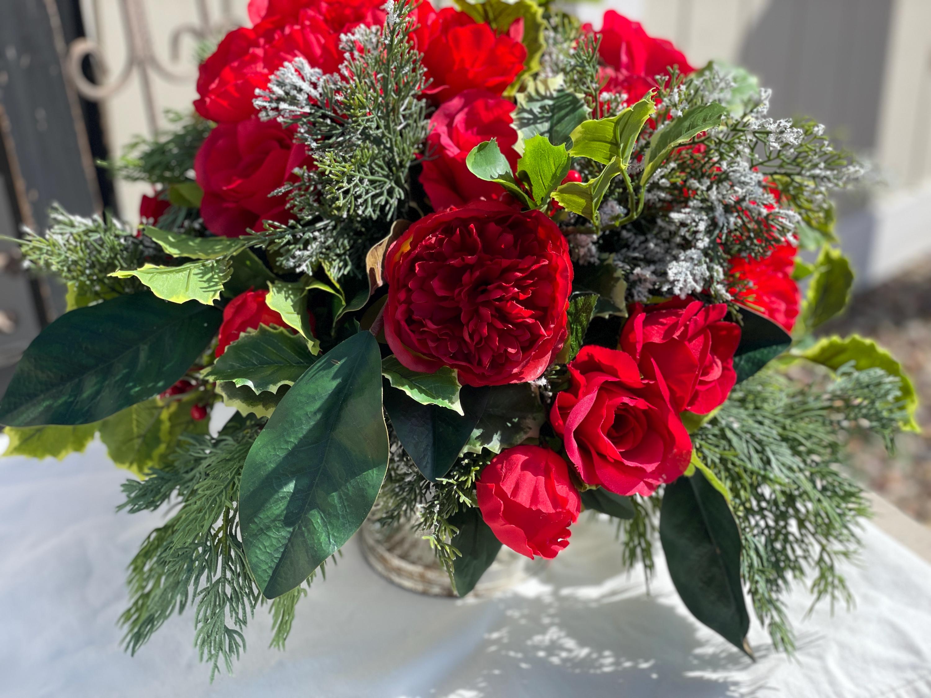 This stunning winter arrangement is filled with holly, magnolia leaves, roses peony, cedar leaves, frosted evergreens and set in a silver pedestal container. It's so pretty with all the red roses and green leaves! Perfect for all winter or enjoy all year.