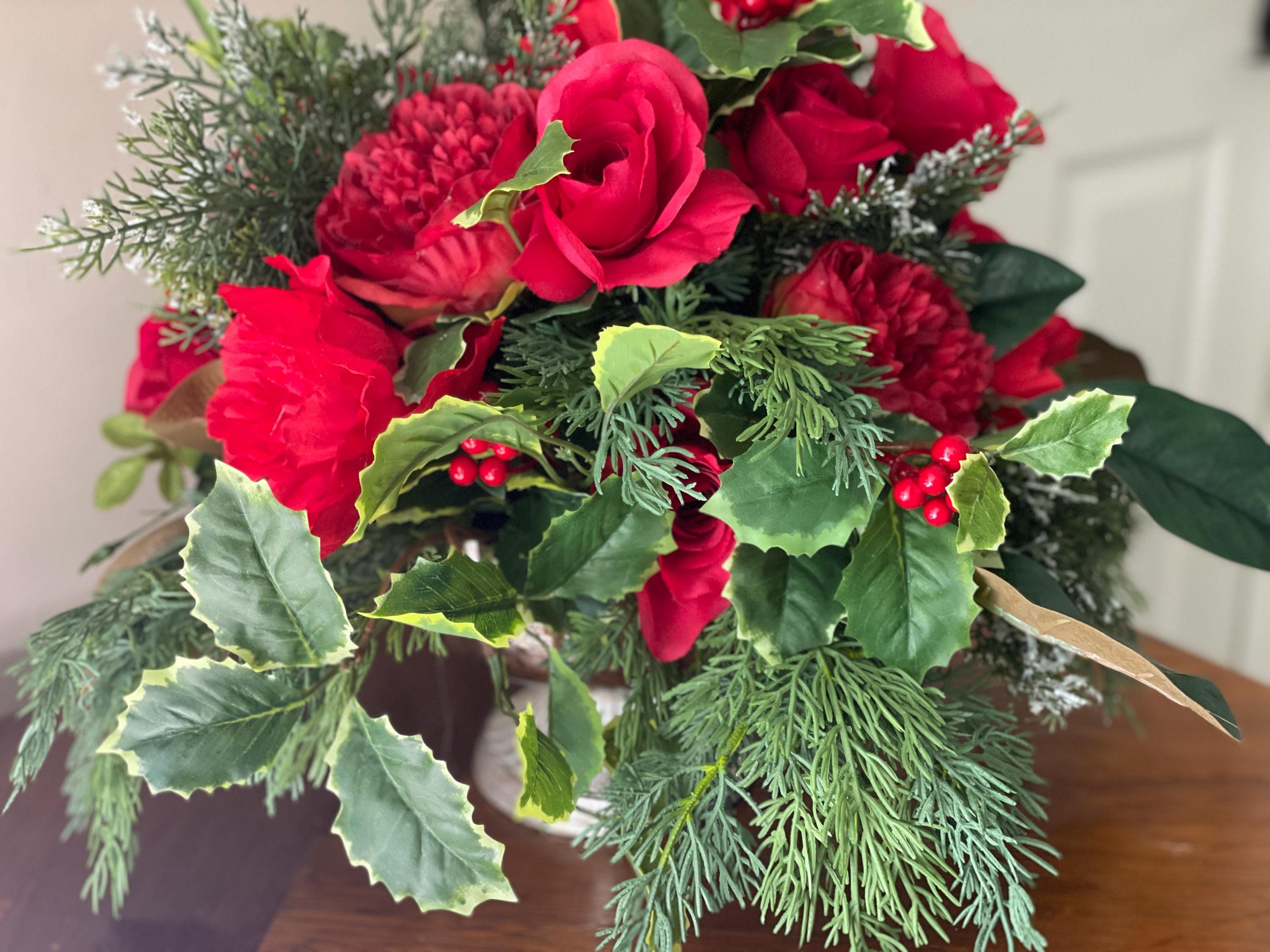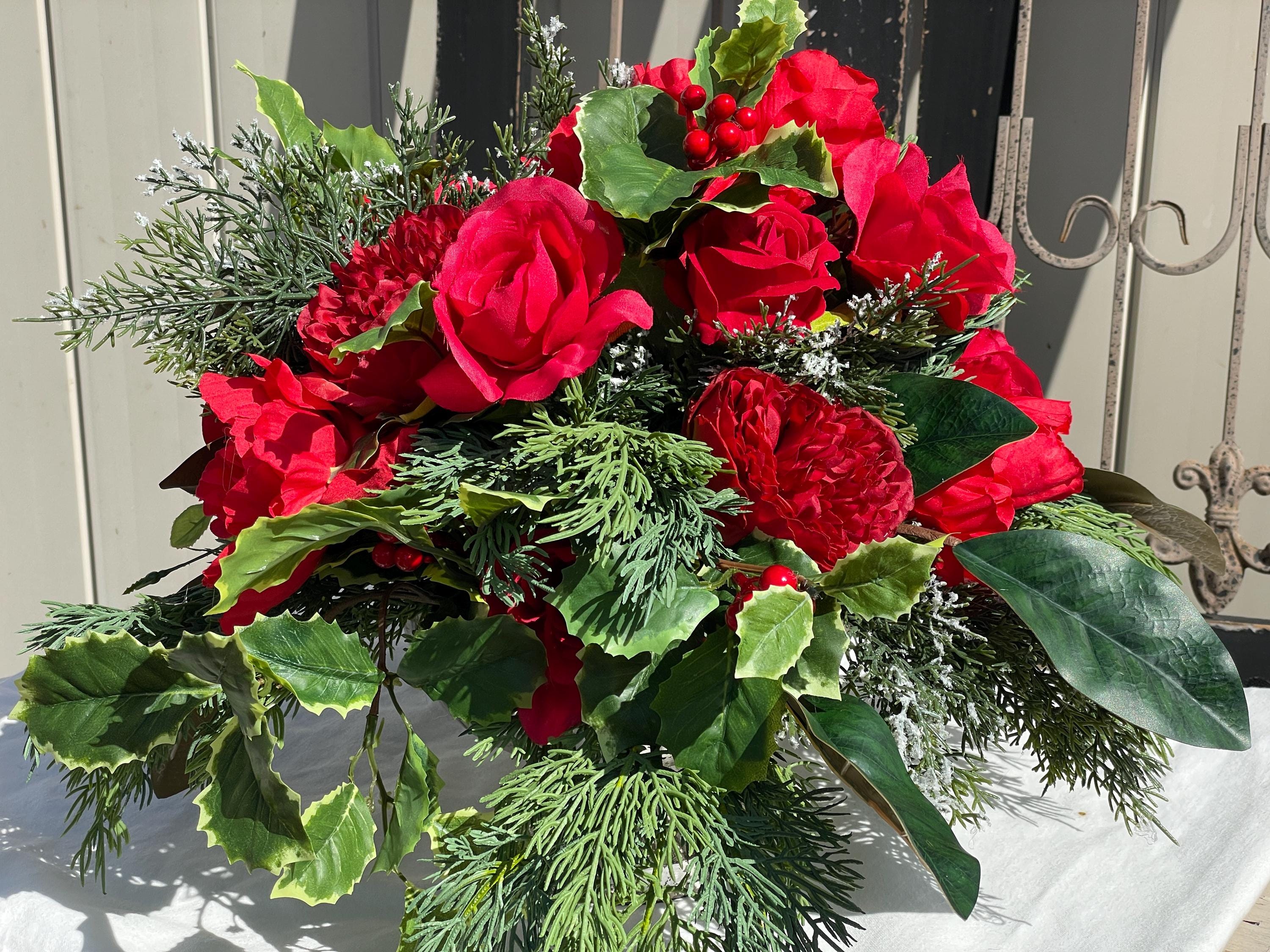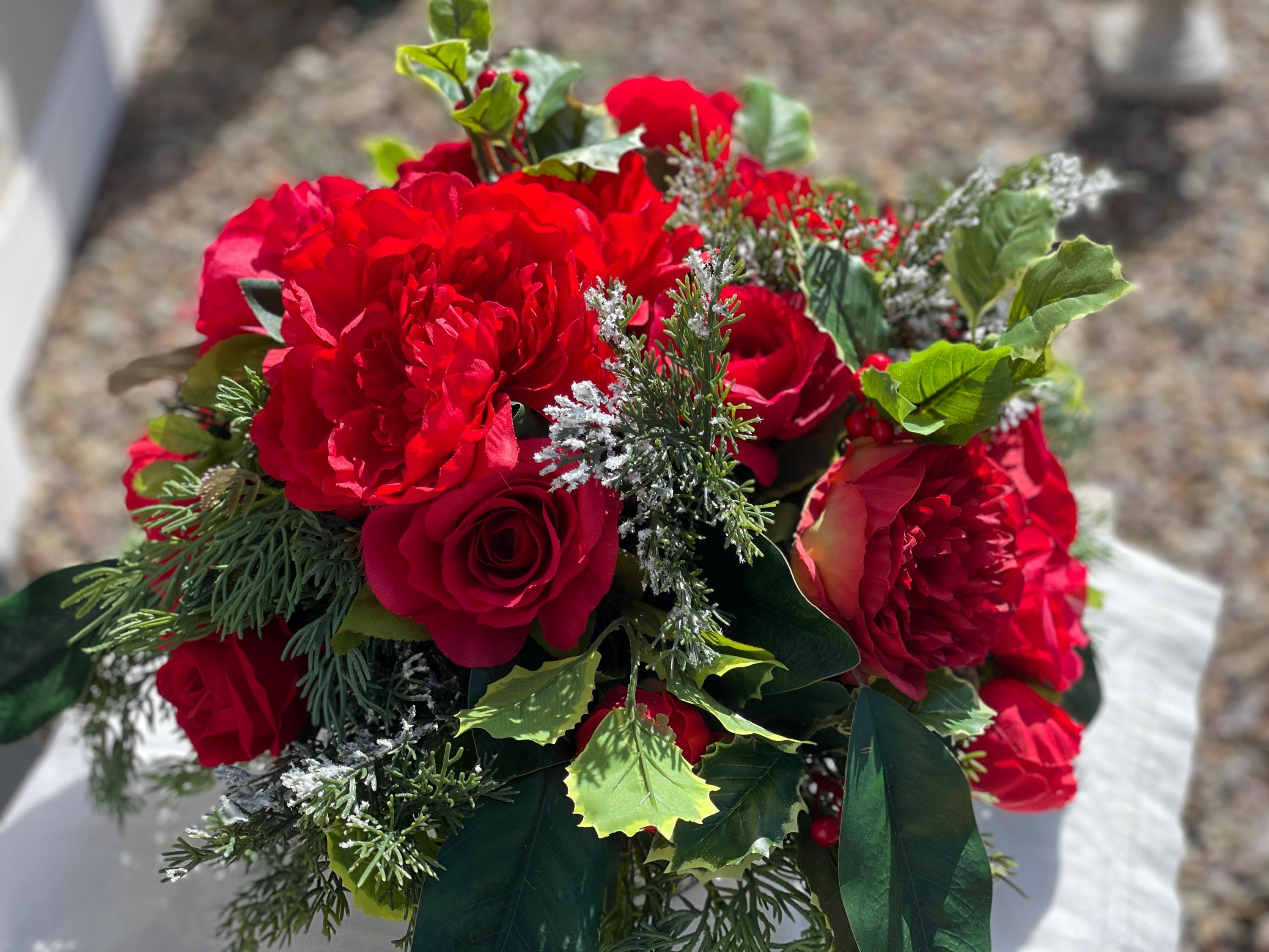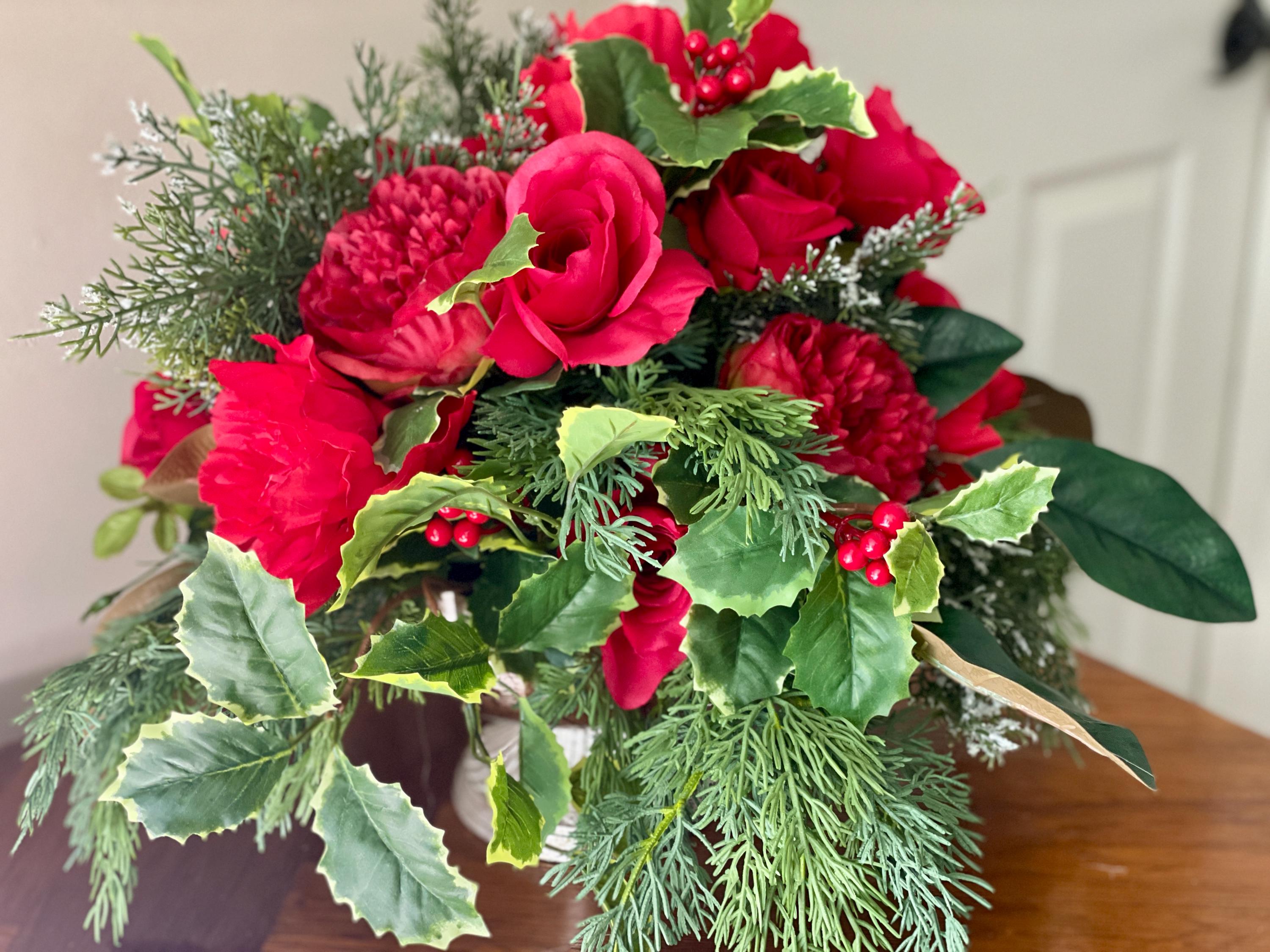 This stunning winter arrangement is filled with holly, magnolia leaves, roses peony, cedar leaves, frosted evergreens and set in a silver pedestal container. It's so pretty with all the red roses and green leaves! Perfect for all winter or enjoy all year.
