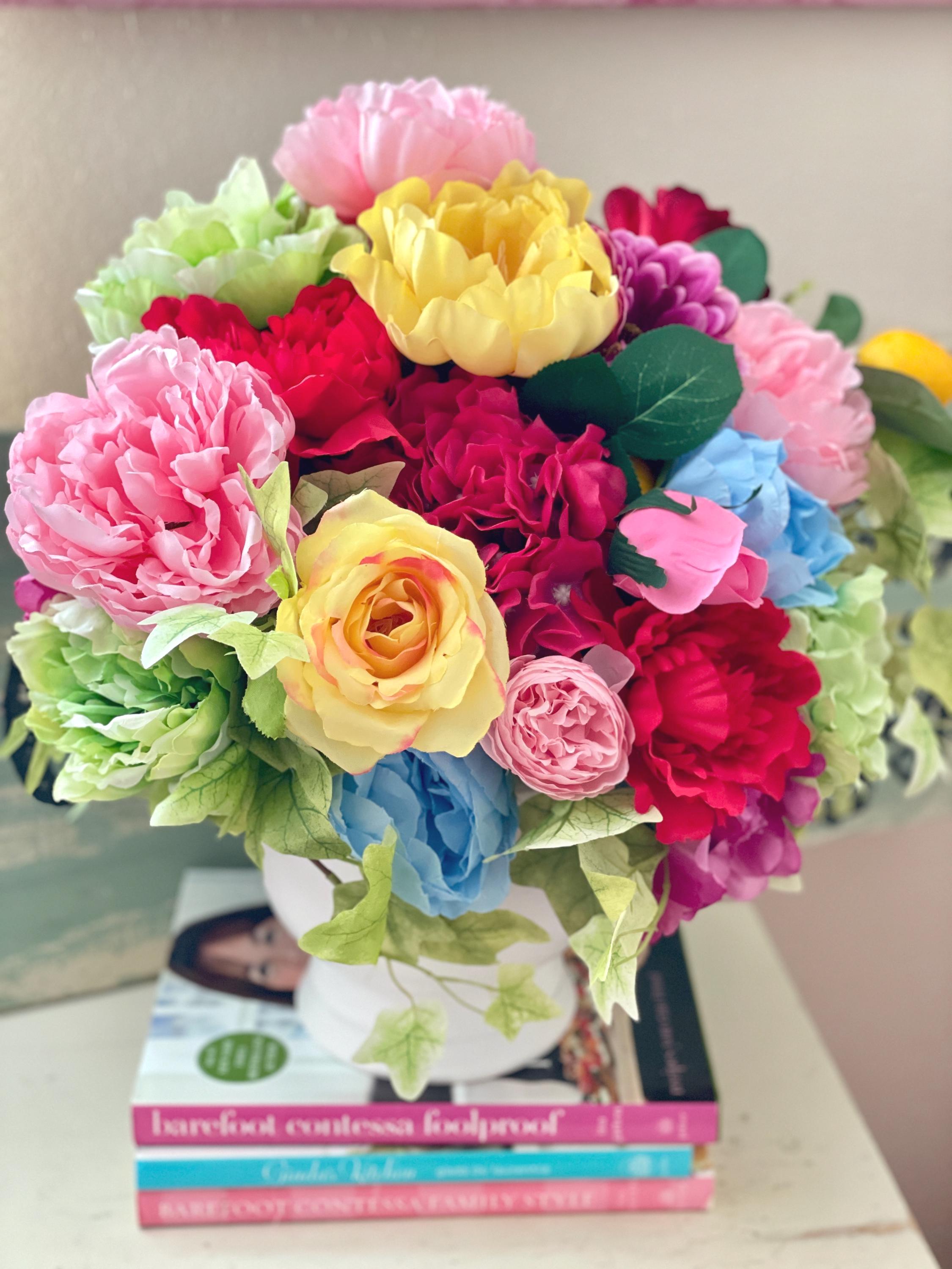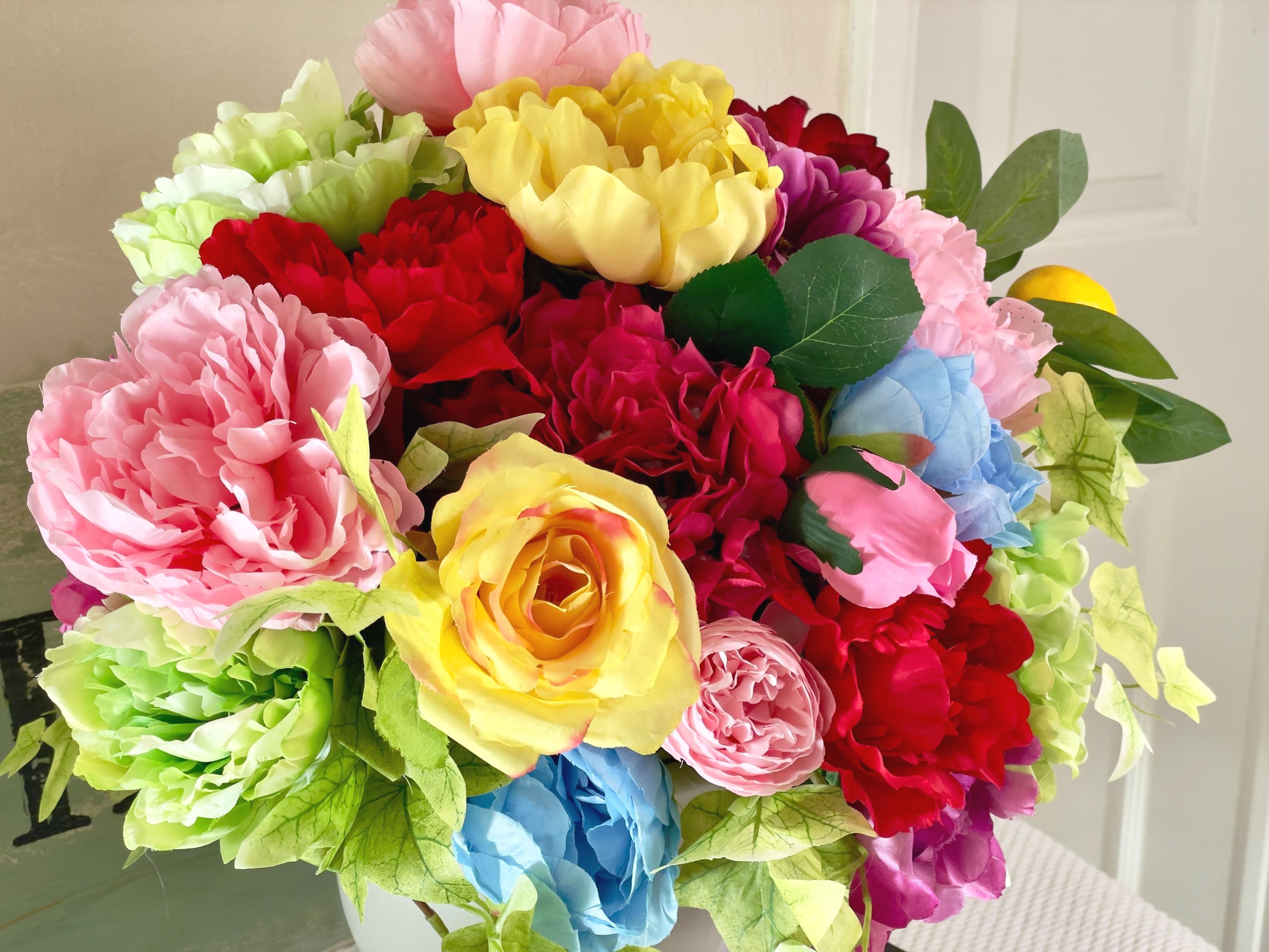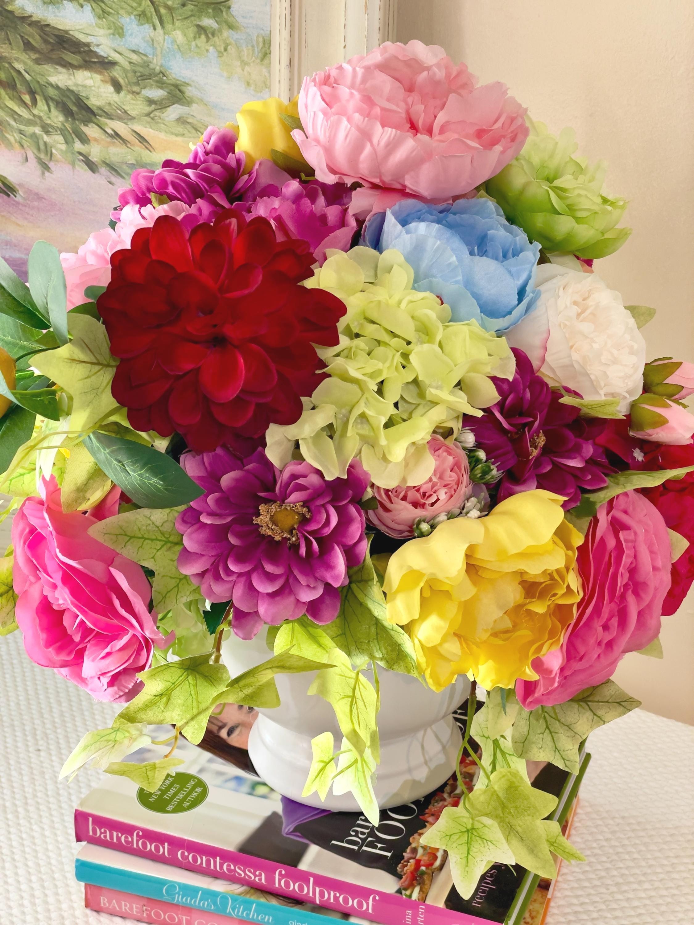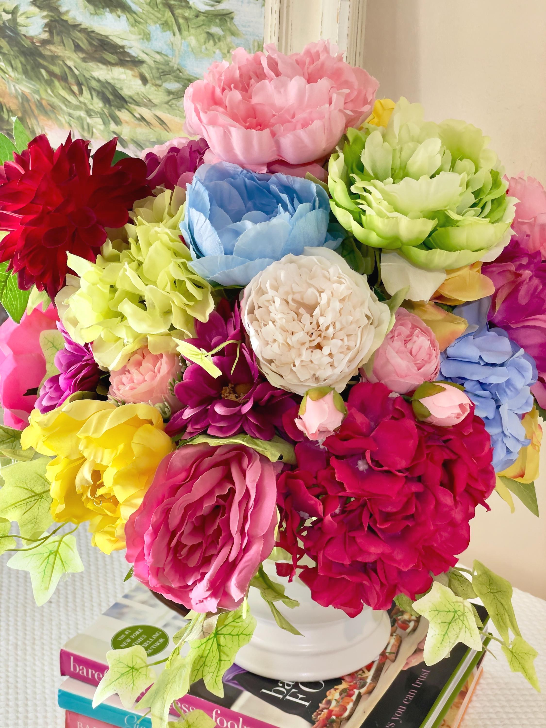 This stunning floral arrangement is filled with bright hydrangeas, roses, ivy, peony, and various bright flowers. Set in a large white pedestal vase. Beautiful bright colors of green, pink, red, blue, white, deep purple. This would look stunning on your entry table, coffee table, side table, bedroom kitchen island or anywhere you want a beautiful floral arrangement. This would also make a wonderful gift.