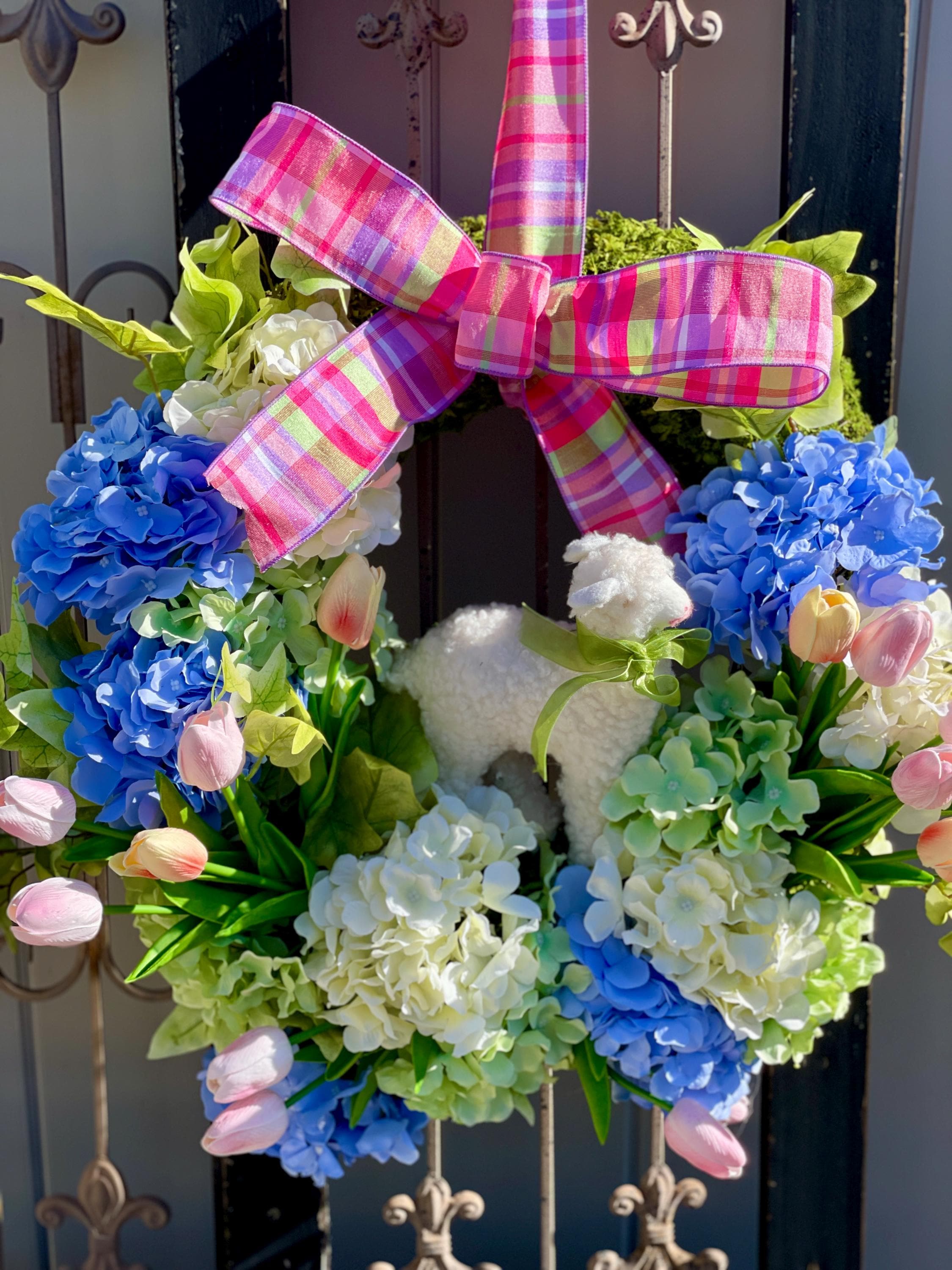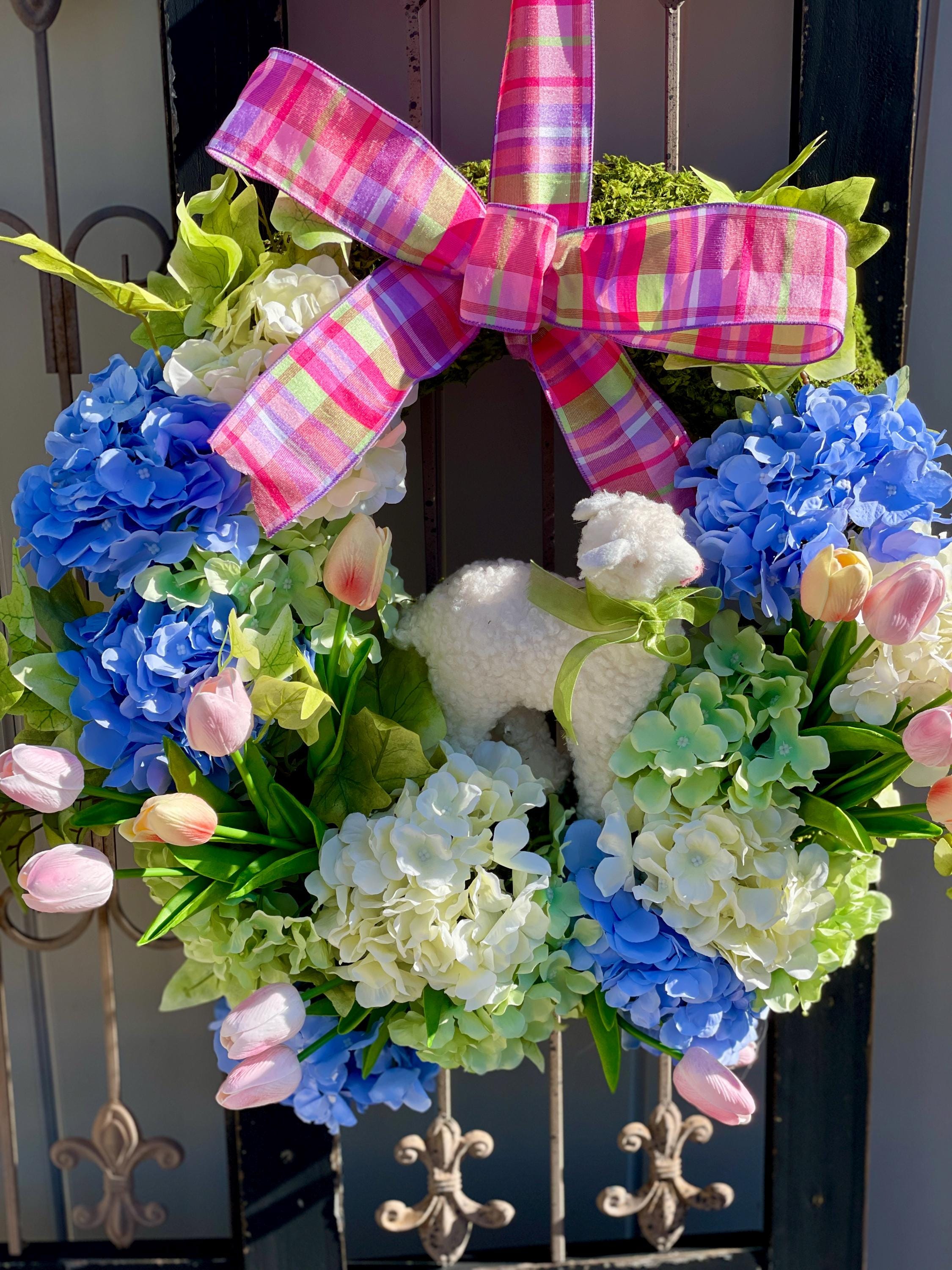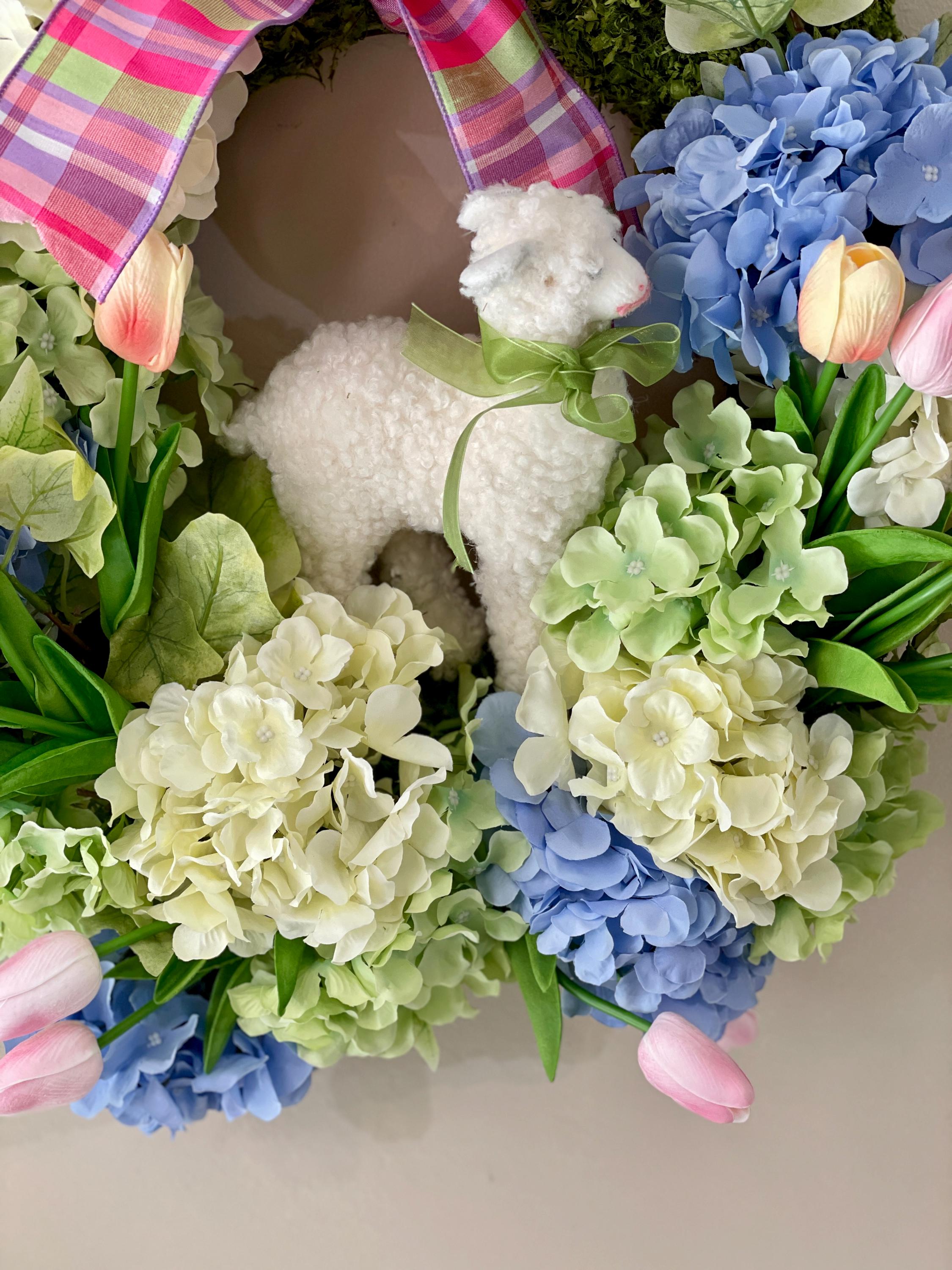 This stunning wreath with designer ribbon from d stephens is filled with hydrangeas and tulips. Set on a moss wire base. This cutie with spring lamb and bright spring flowers would be perfect for your front door or hang inside on your wall or door. This wreath is so darling!