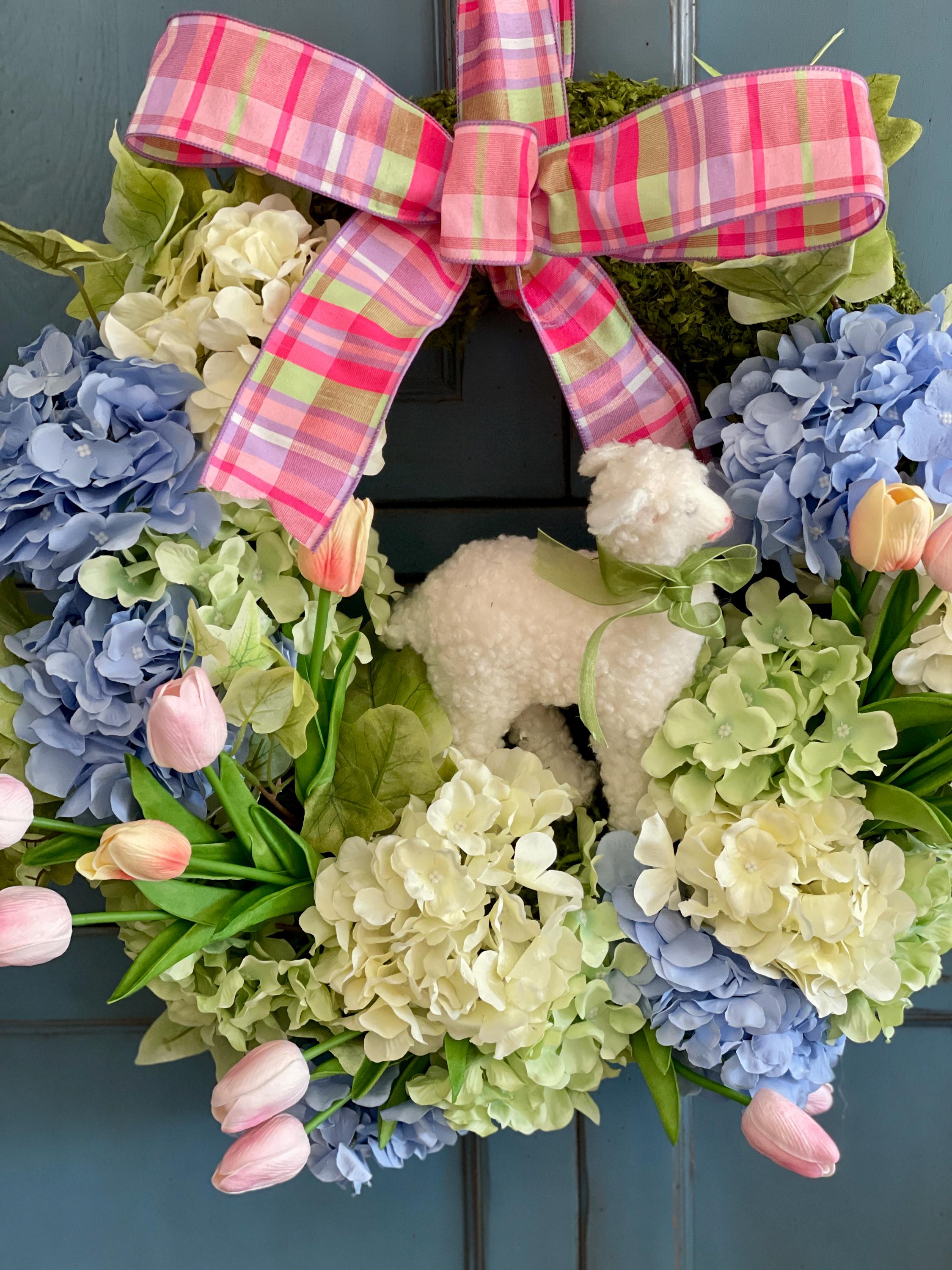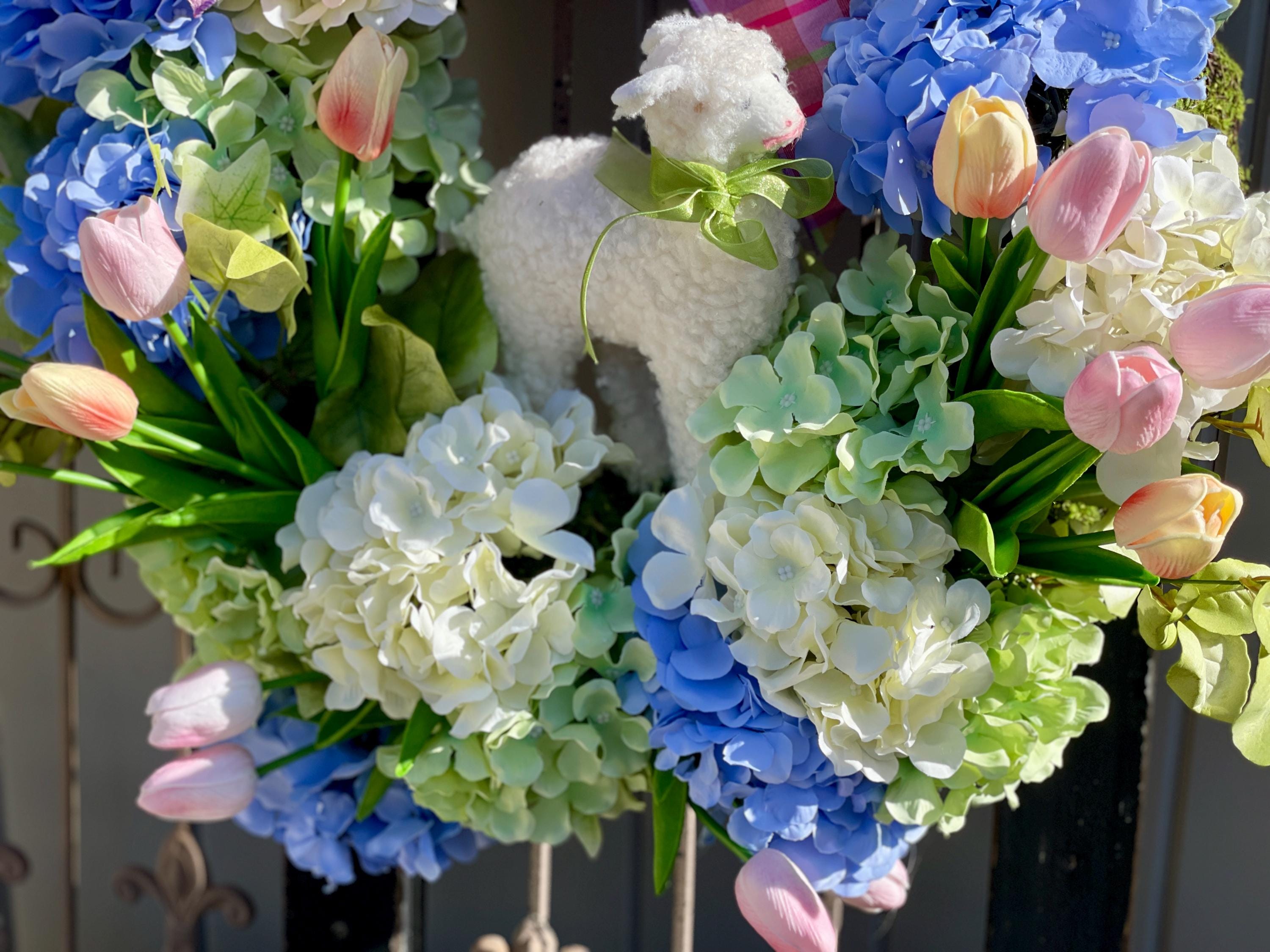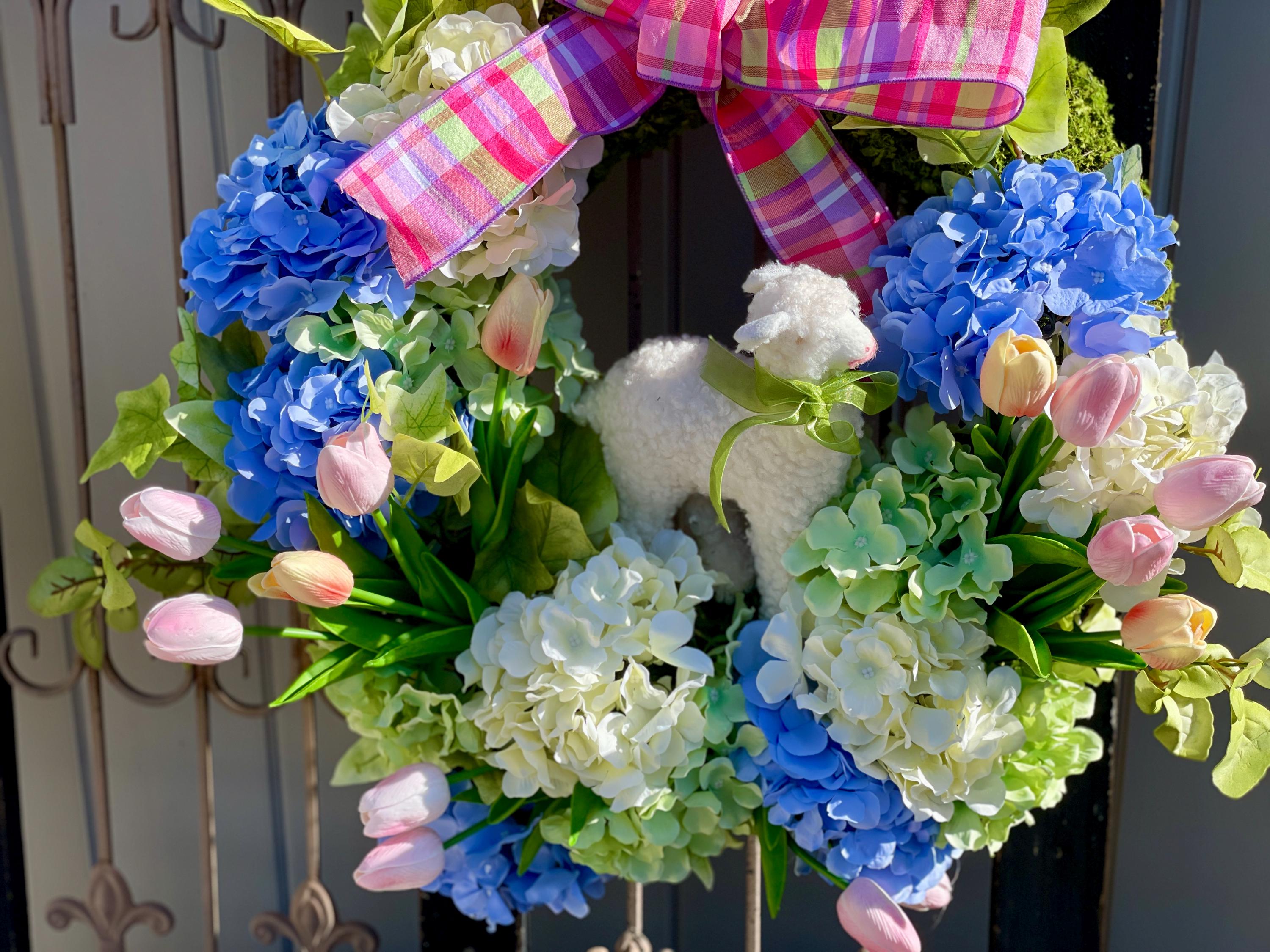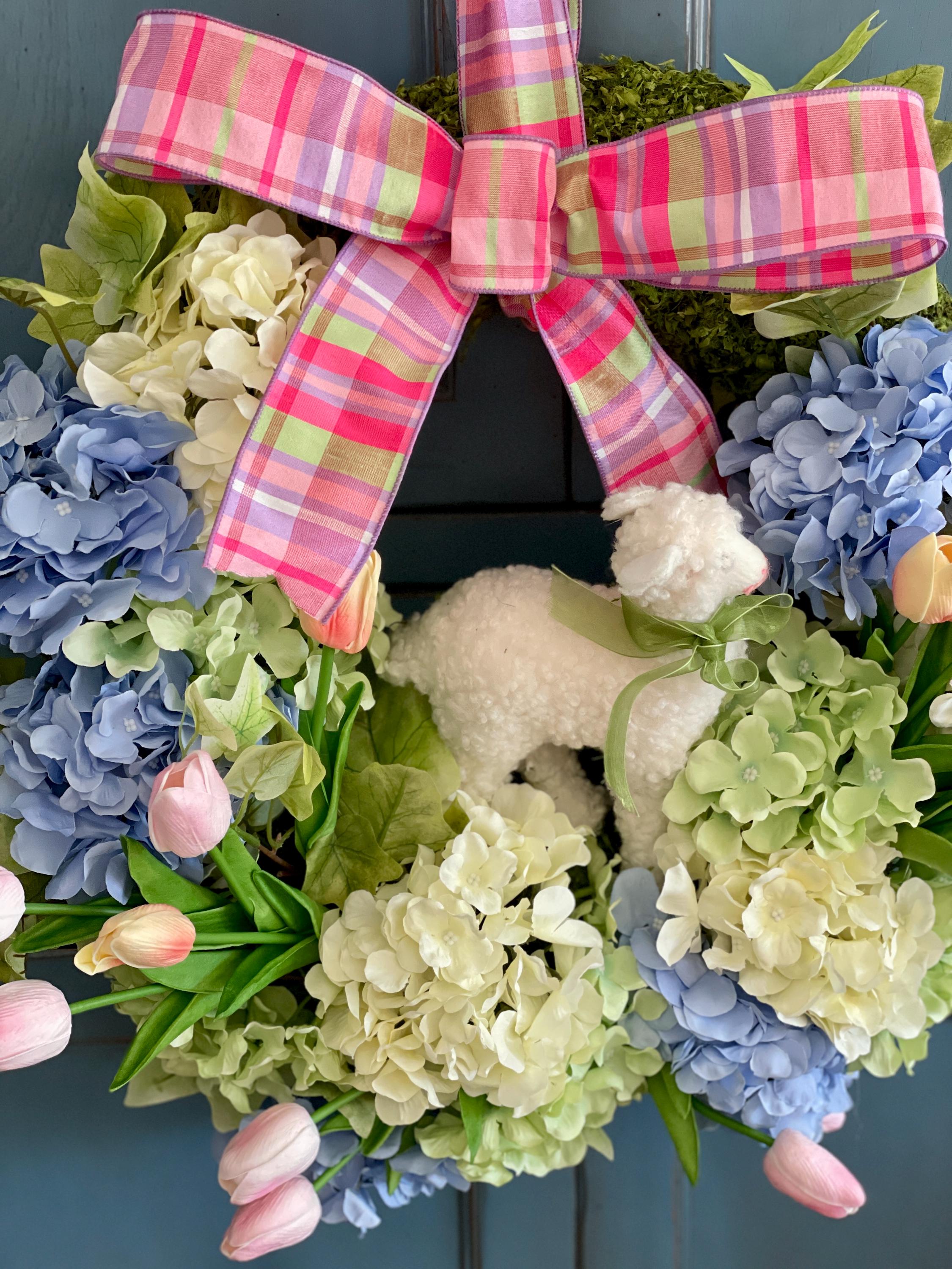 This stunning wreath with designer ribbon from d stephens is filled with hydrangeas and tulips. Set on a moss wire base. This cutie with spring lamb and bright spring flowers would be perfect for your front door or hang inside on your wall or door. This wreath is so darling!
