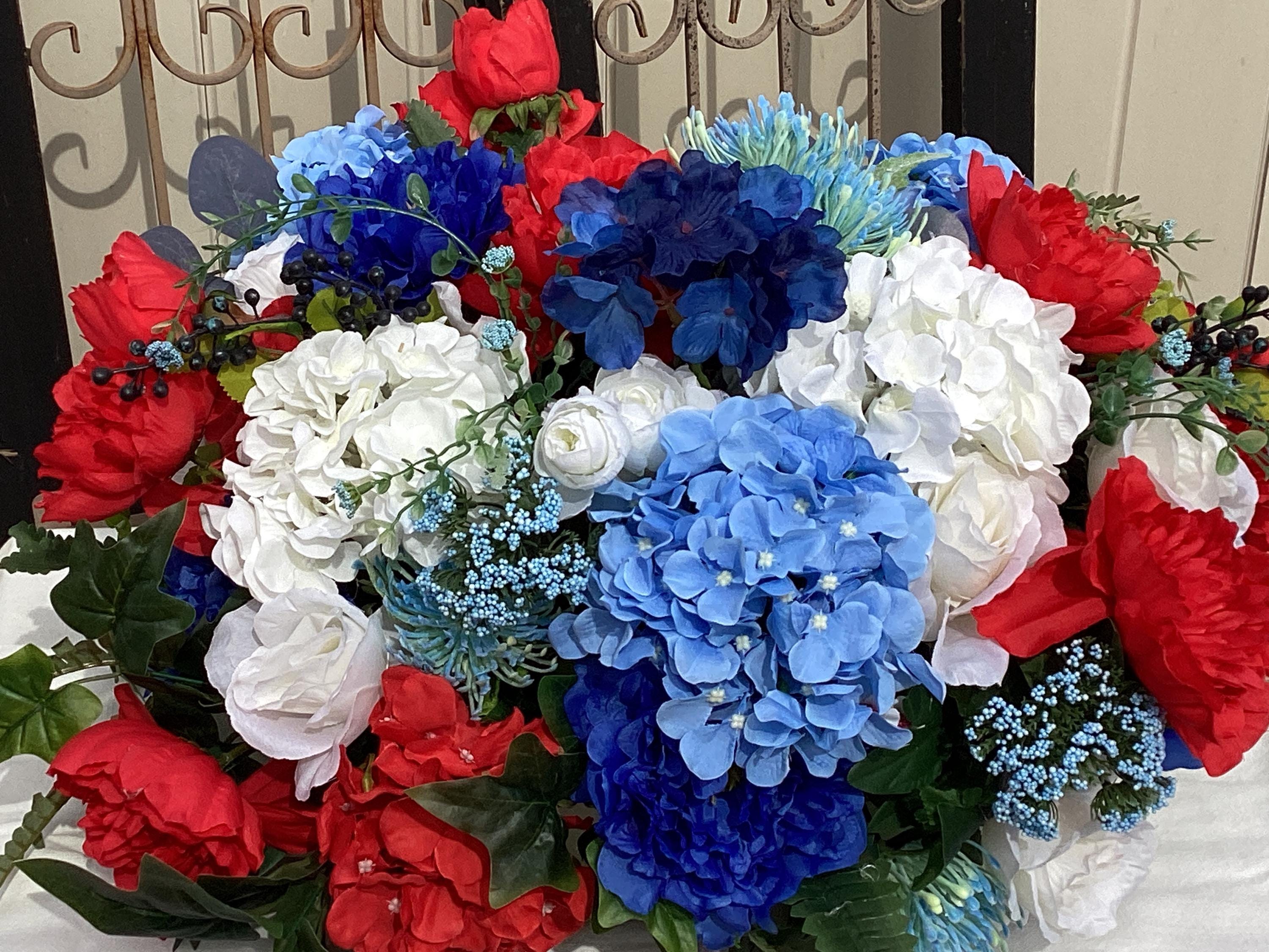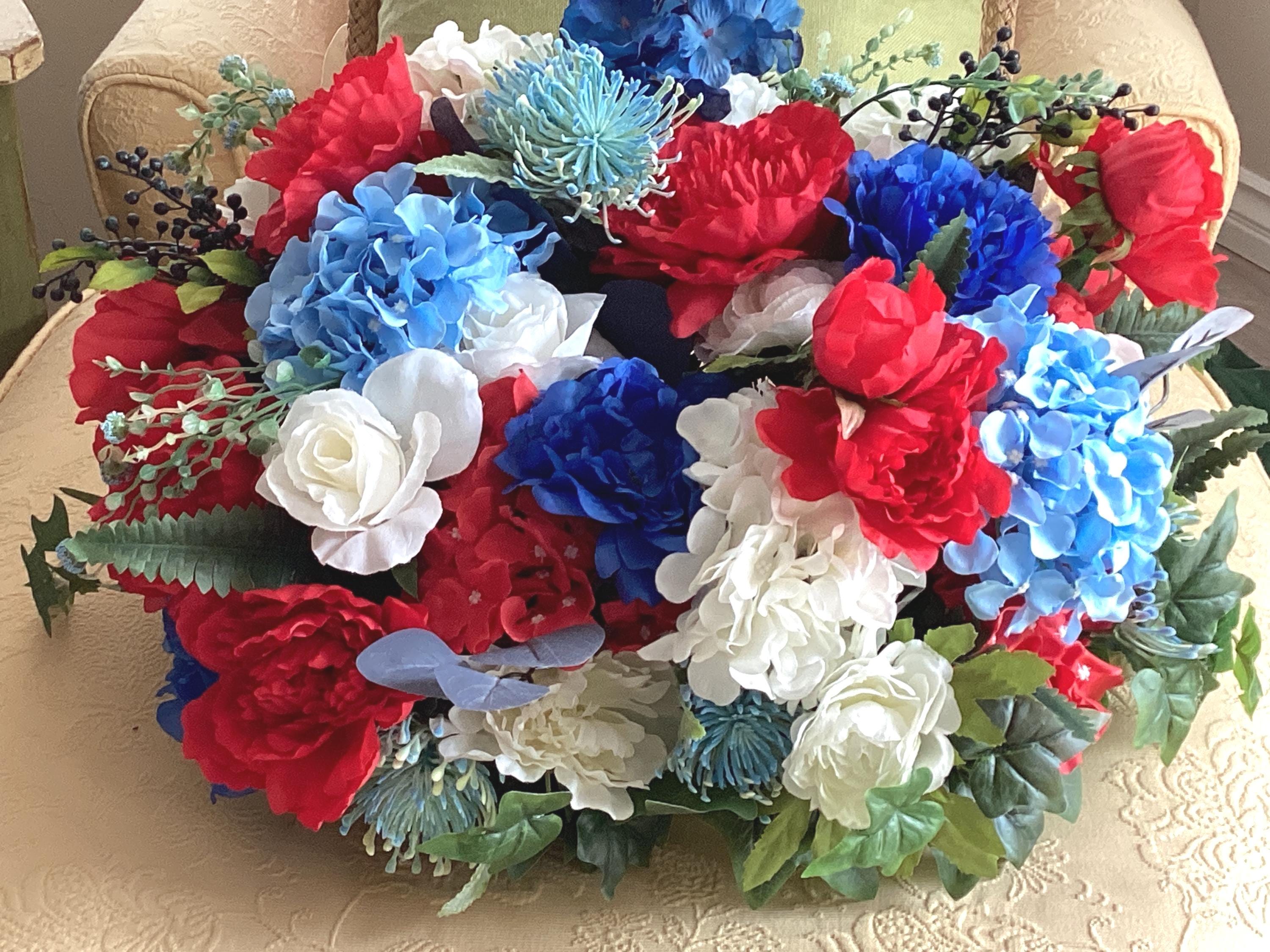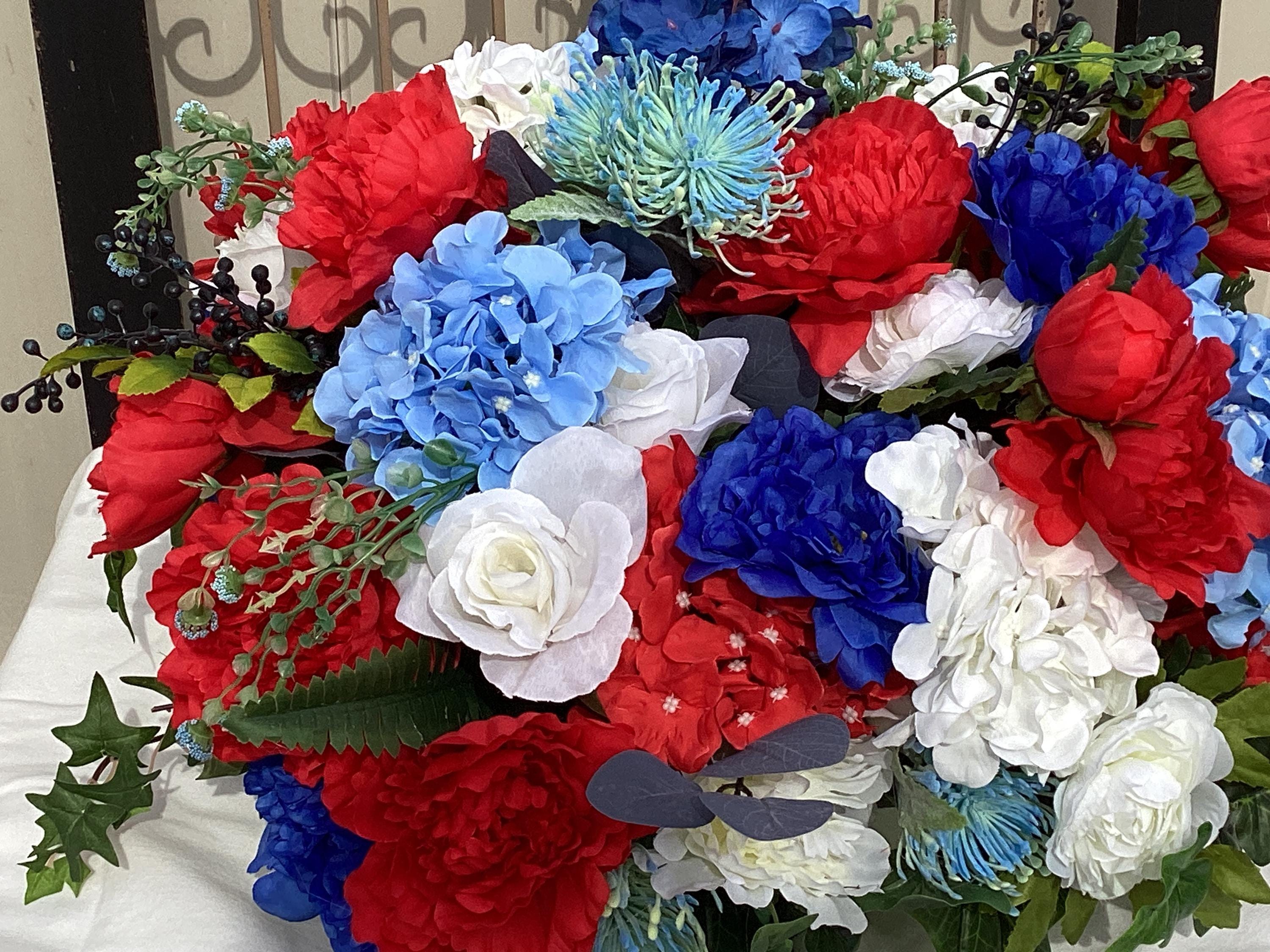 This large red white and blue floral arrangement is filled with so many flowers! Pretty blue, white and red hydrangeas, red, white, blue peony, various greens and berries and set in a white wood tray with handles. This is a large arrangement measuring: 24" wide, 20" deep, 12" tall from tip to tip. This is such a pretty arrangement for all year:)