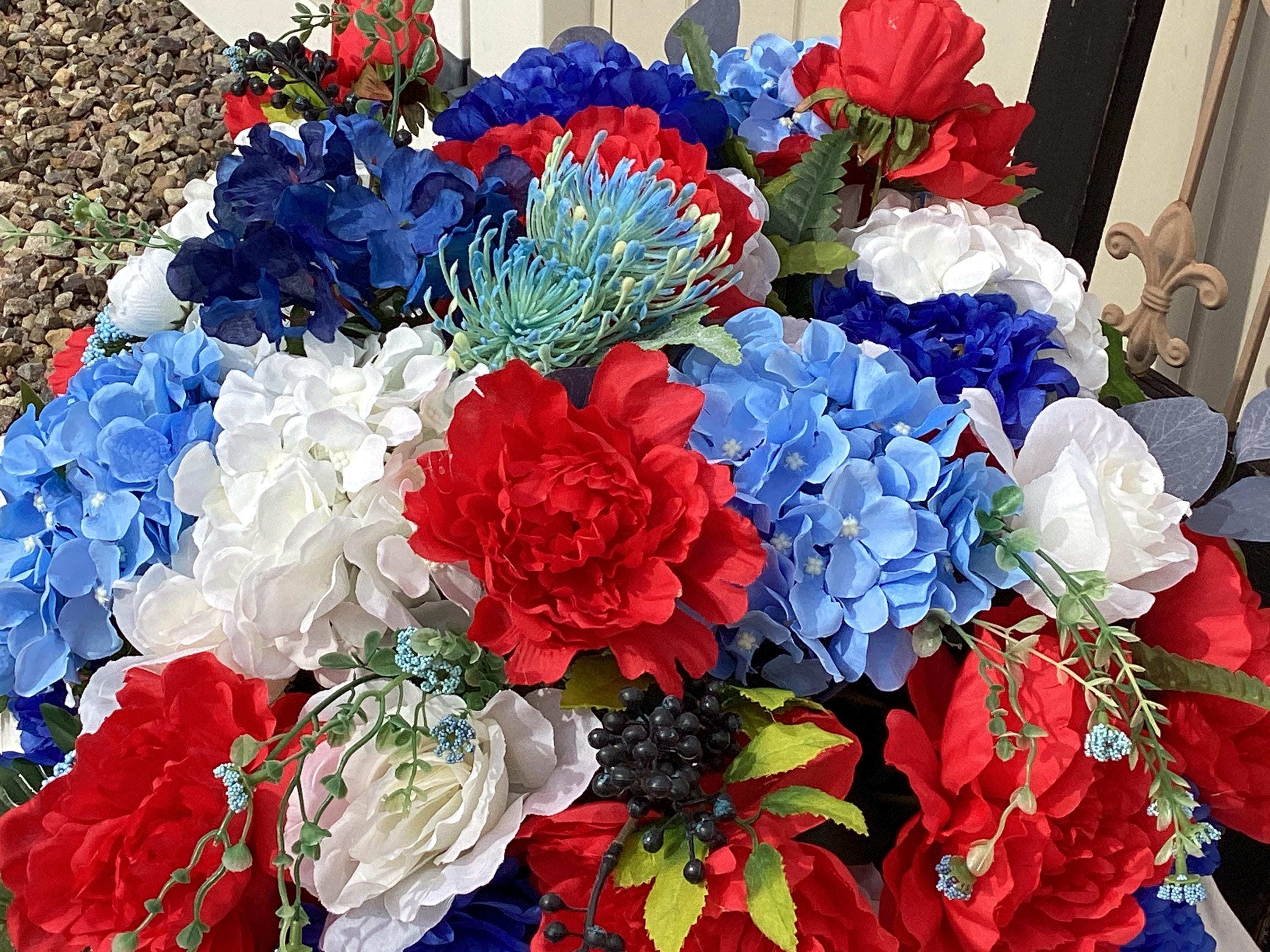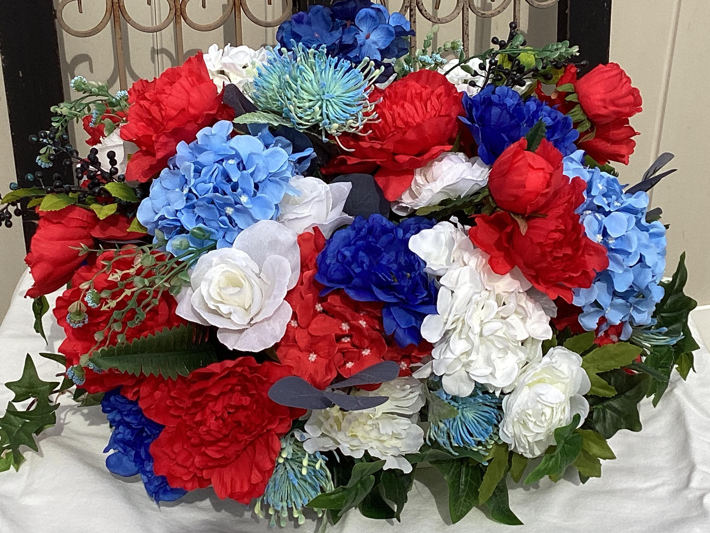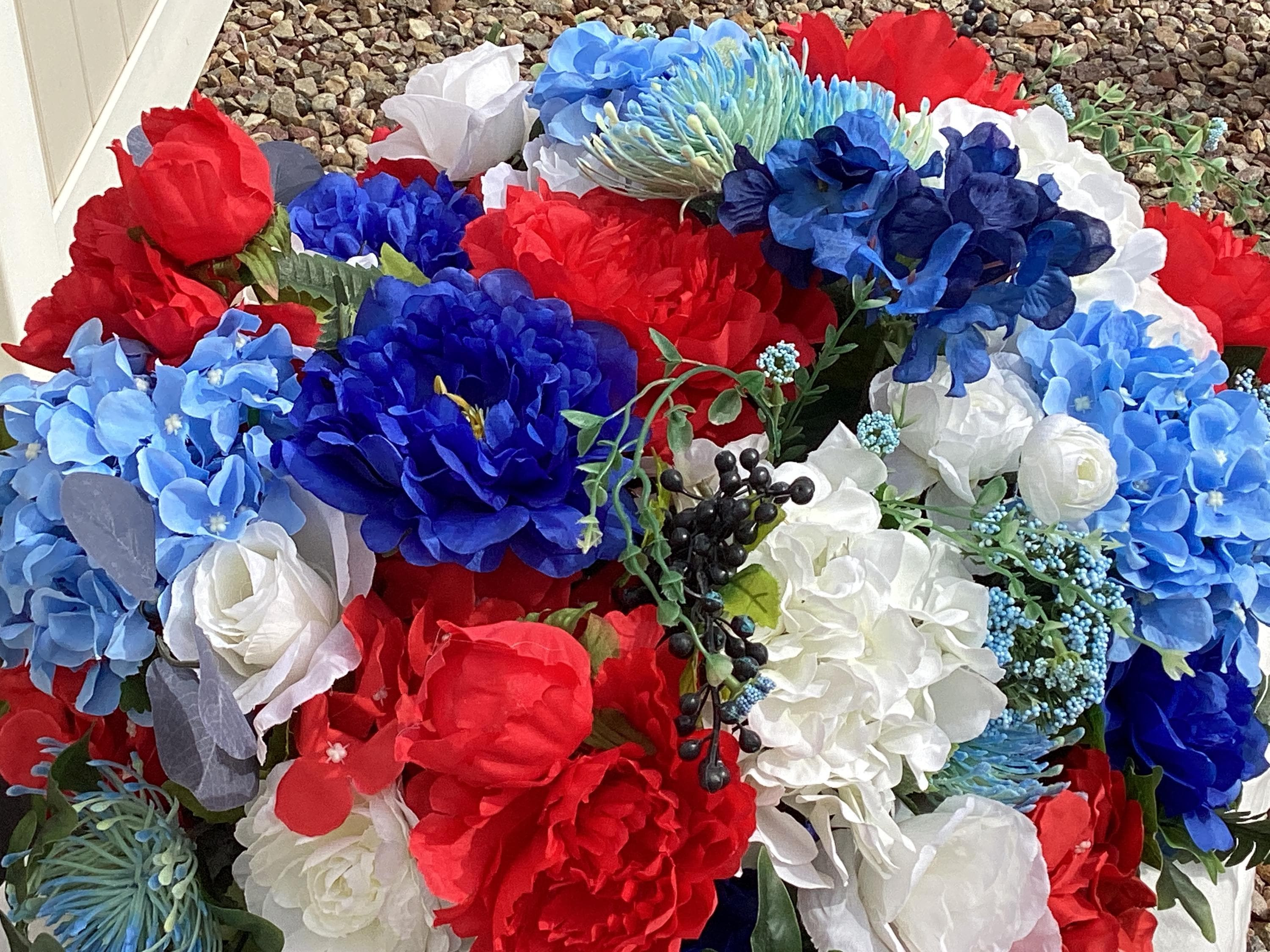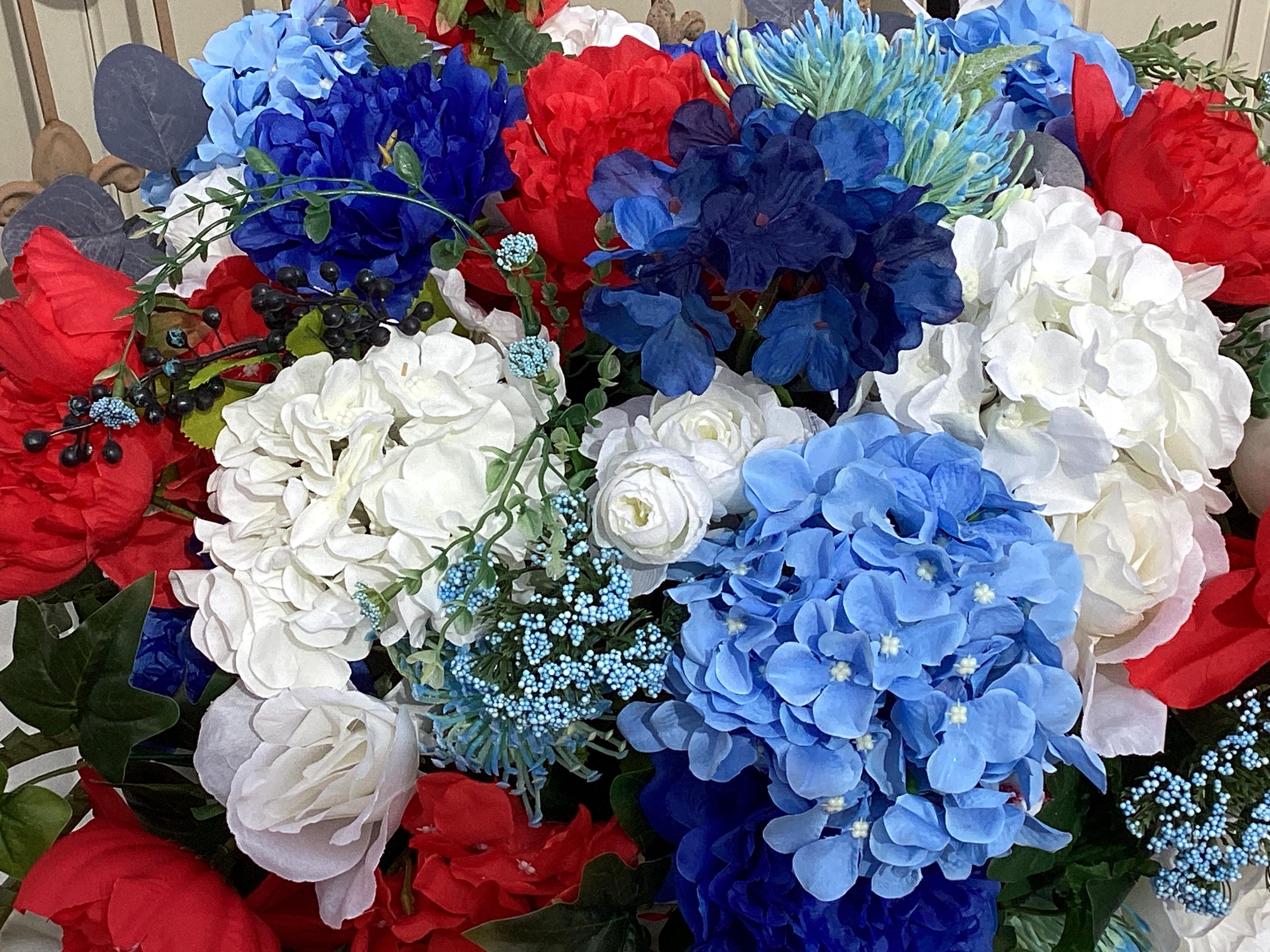 This large red white and blue floral arrangement is filled with so many flowers! Pretty blue, white and red hydrangeas, red, white, blue peony, various greens and berries and set in a white wood tray with handles. This is a large arrangement measuring: 24" wide, 20" deep, 12" tall from tip to tip. This is such a pretty arrangement for all year:)